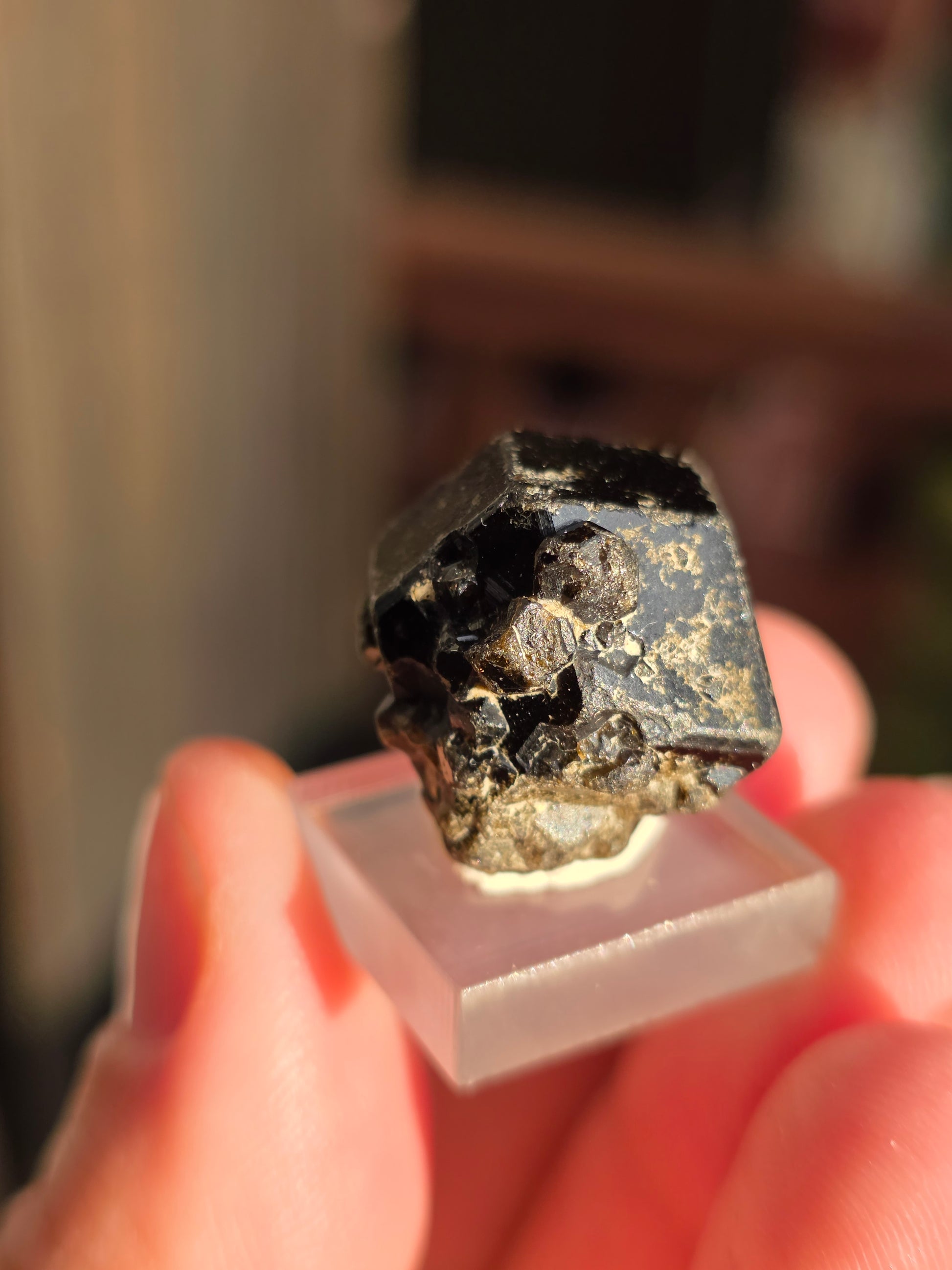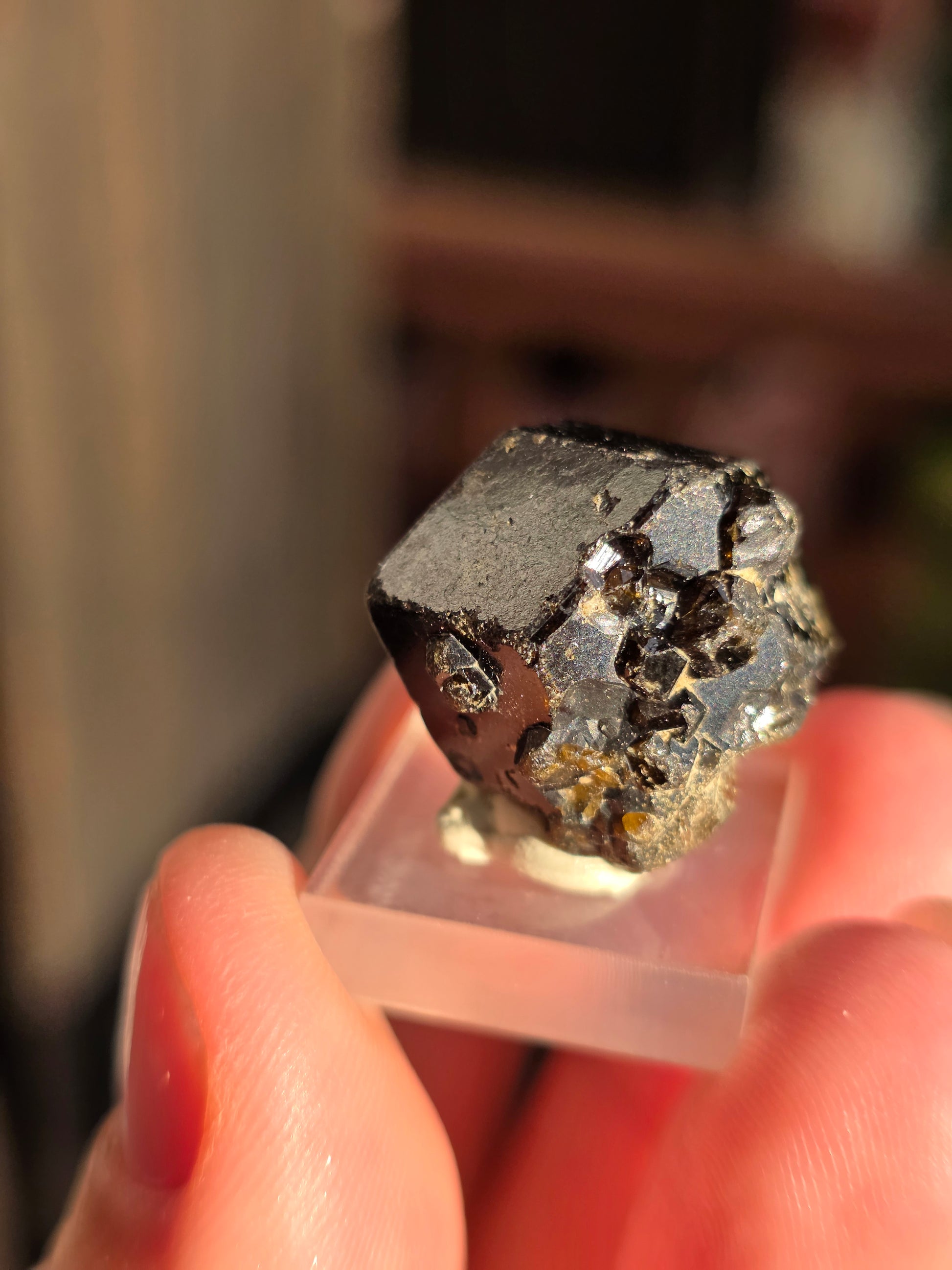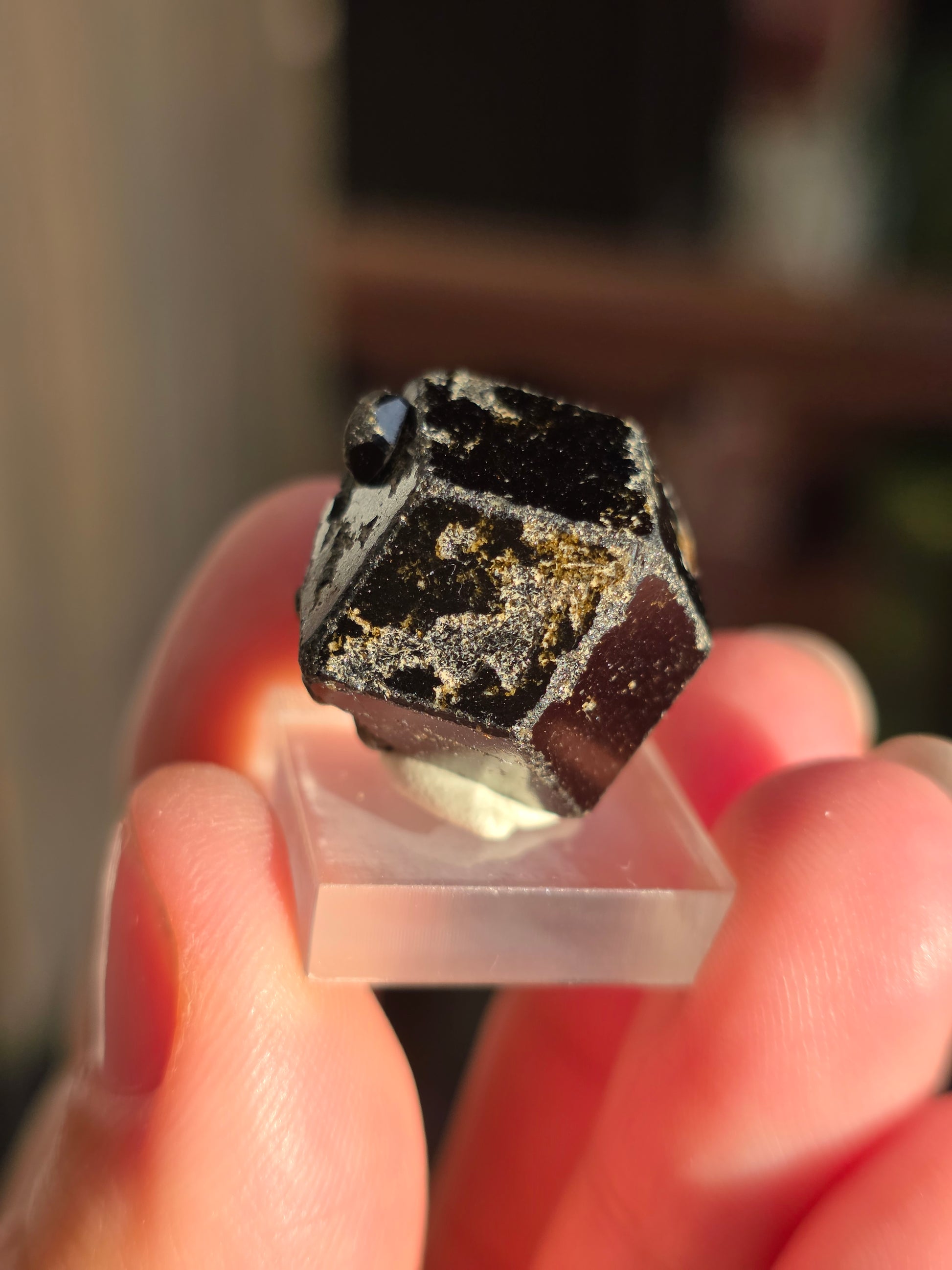 Joli Grenat Mélanite du Mali sur son socle en acrylique. (vidéo ici)