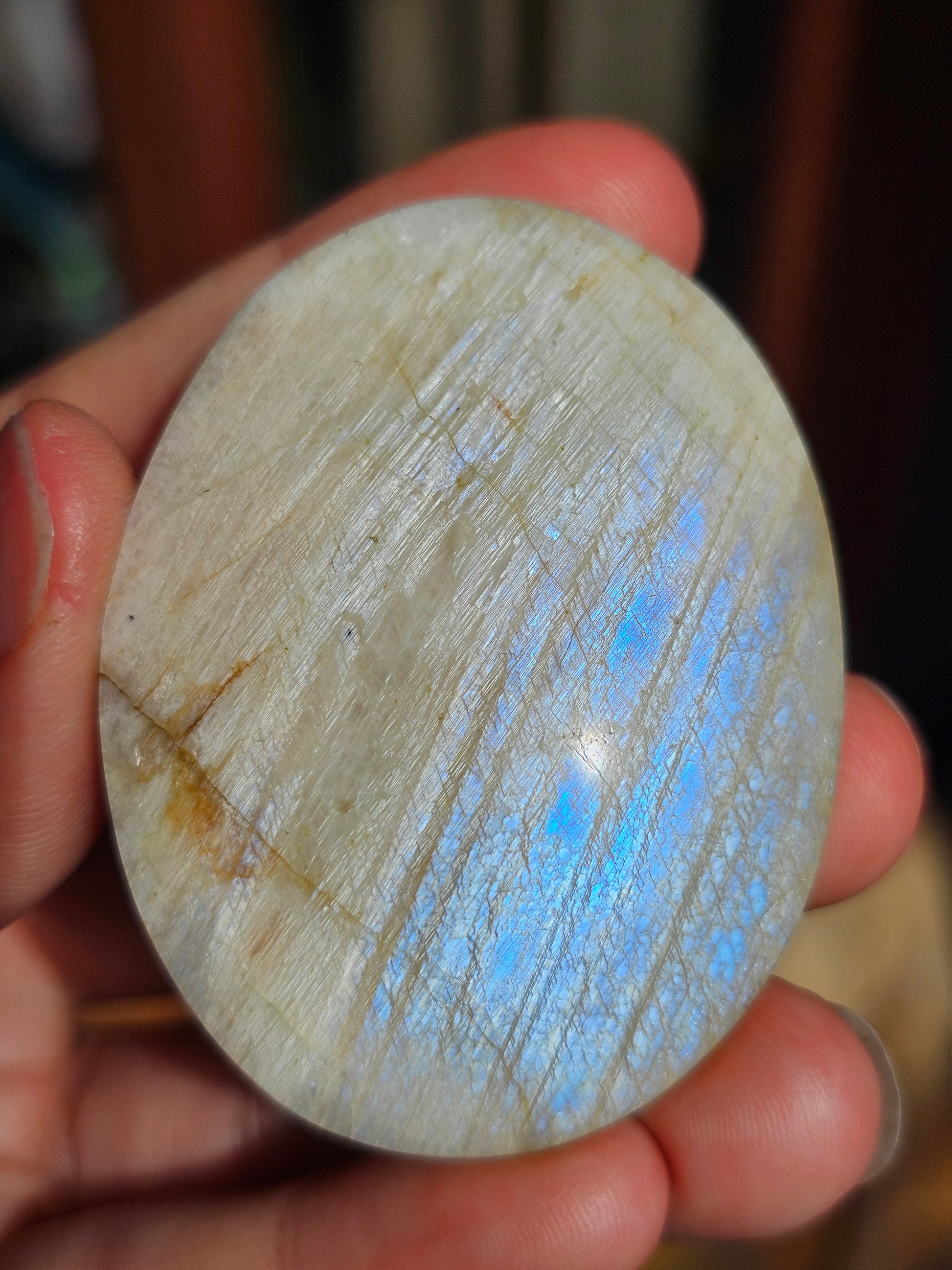 Joli galet en Pierre de Lune d'Inde avec de beaux reflets bleutés et irisés. La douceur au creux de la main.