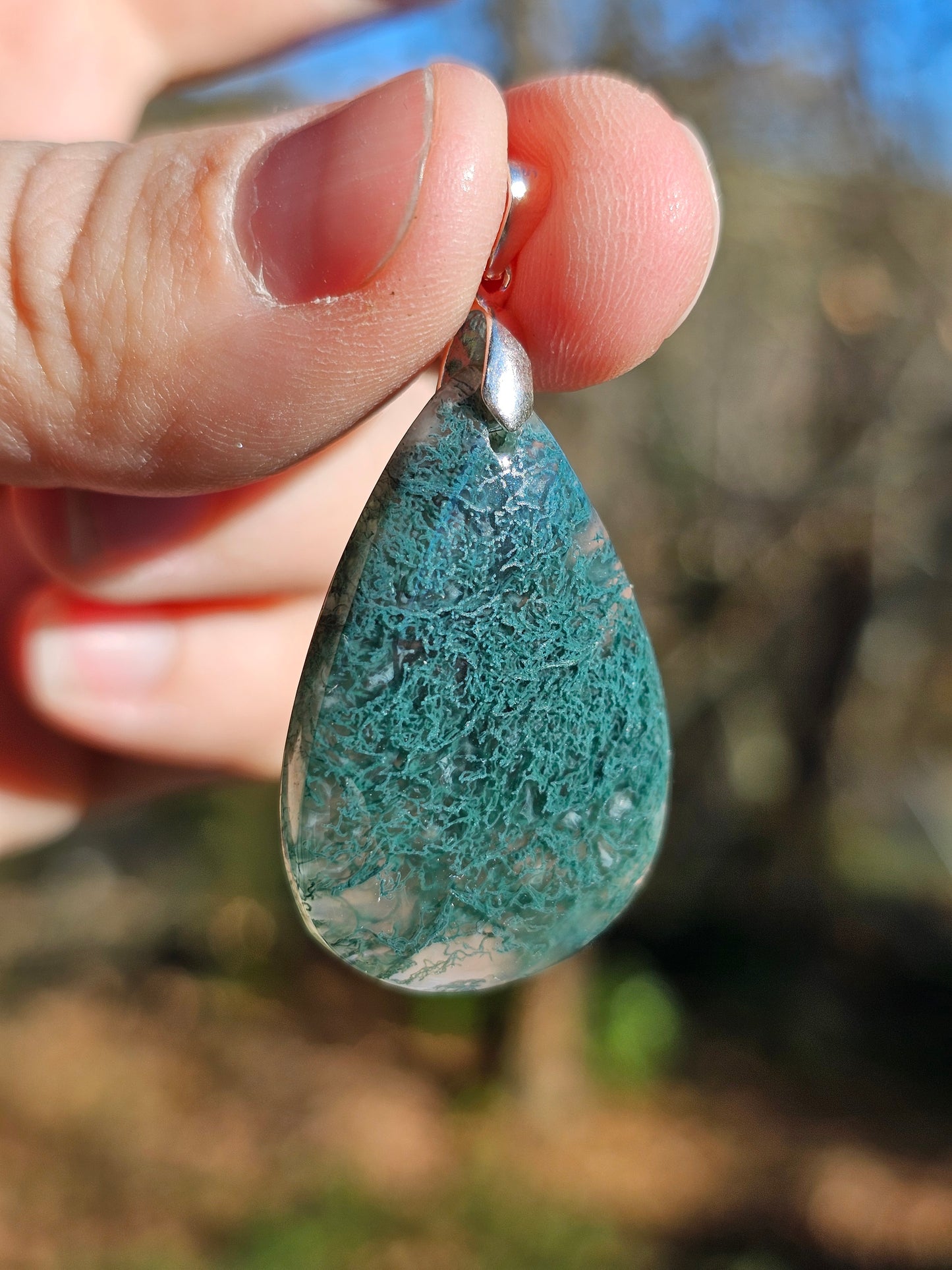 Sublime pendentif en Agate mousse monté sur une bélière en argent 925 et livré dans son pochon avec un cordon ciré noir. Possibilité de le sublimer avec une chaîne en argent et jolie boîte cadeau.