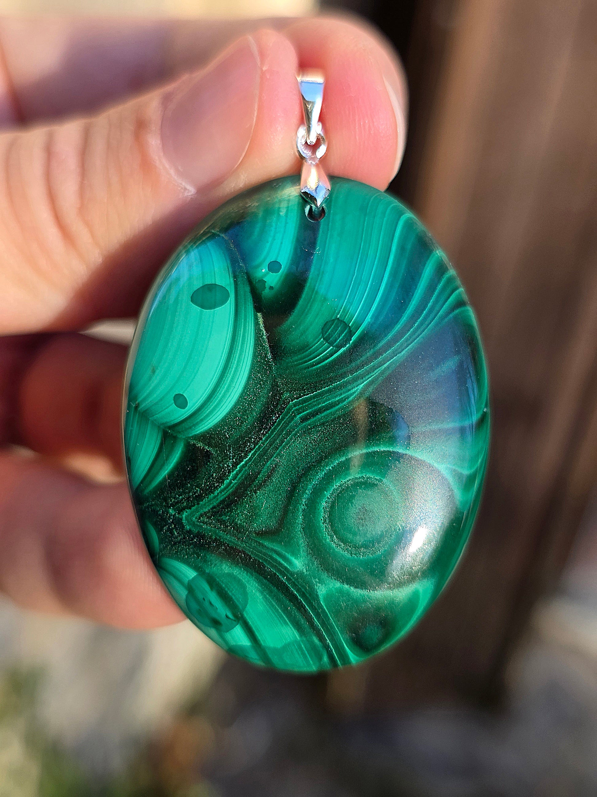 Superbe pendentif en Malachite du Congo (vidéo ici).