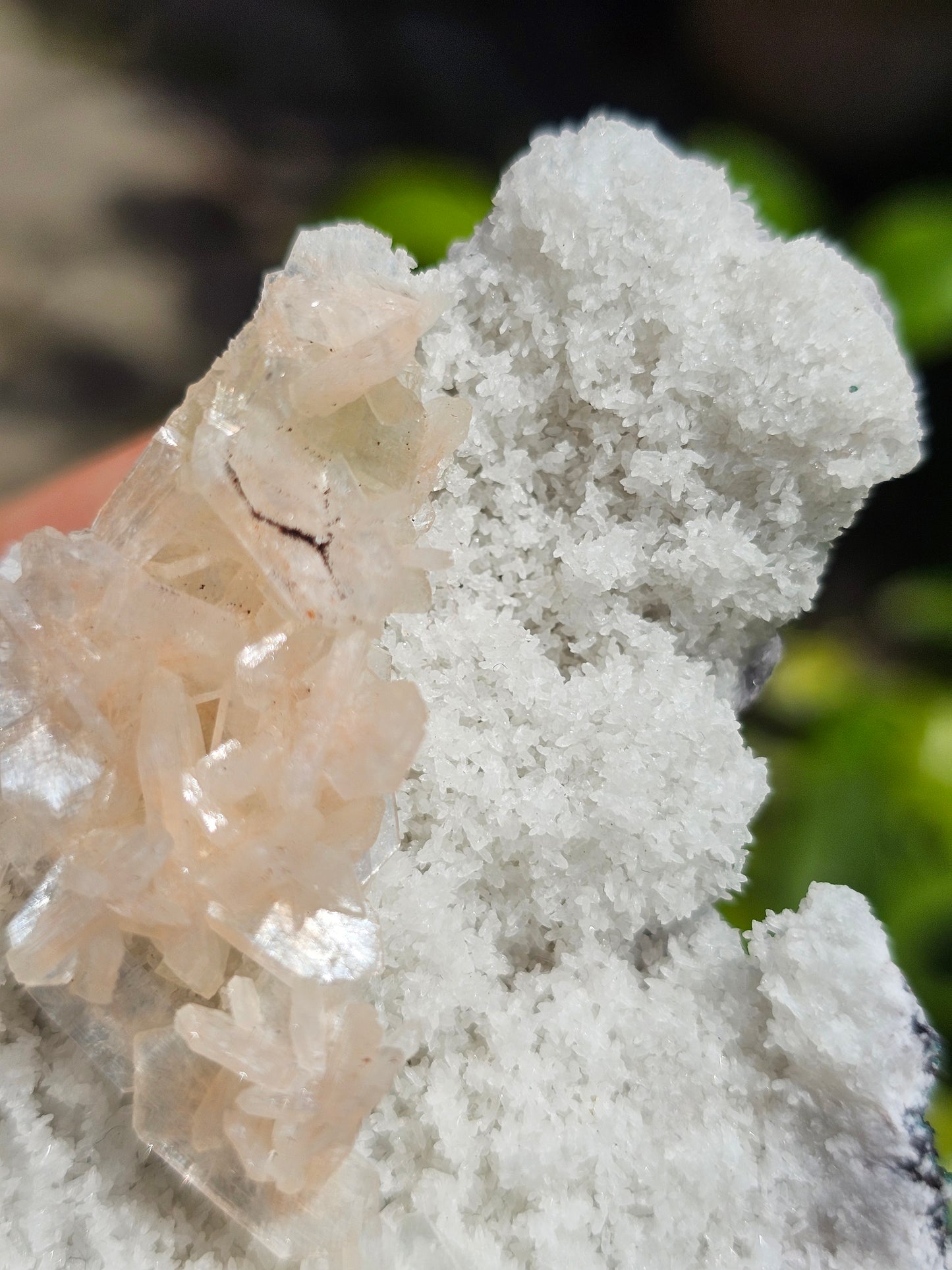 Apophyllite, apophyllite verte, stilbite sur Calcédoine blanche K