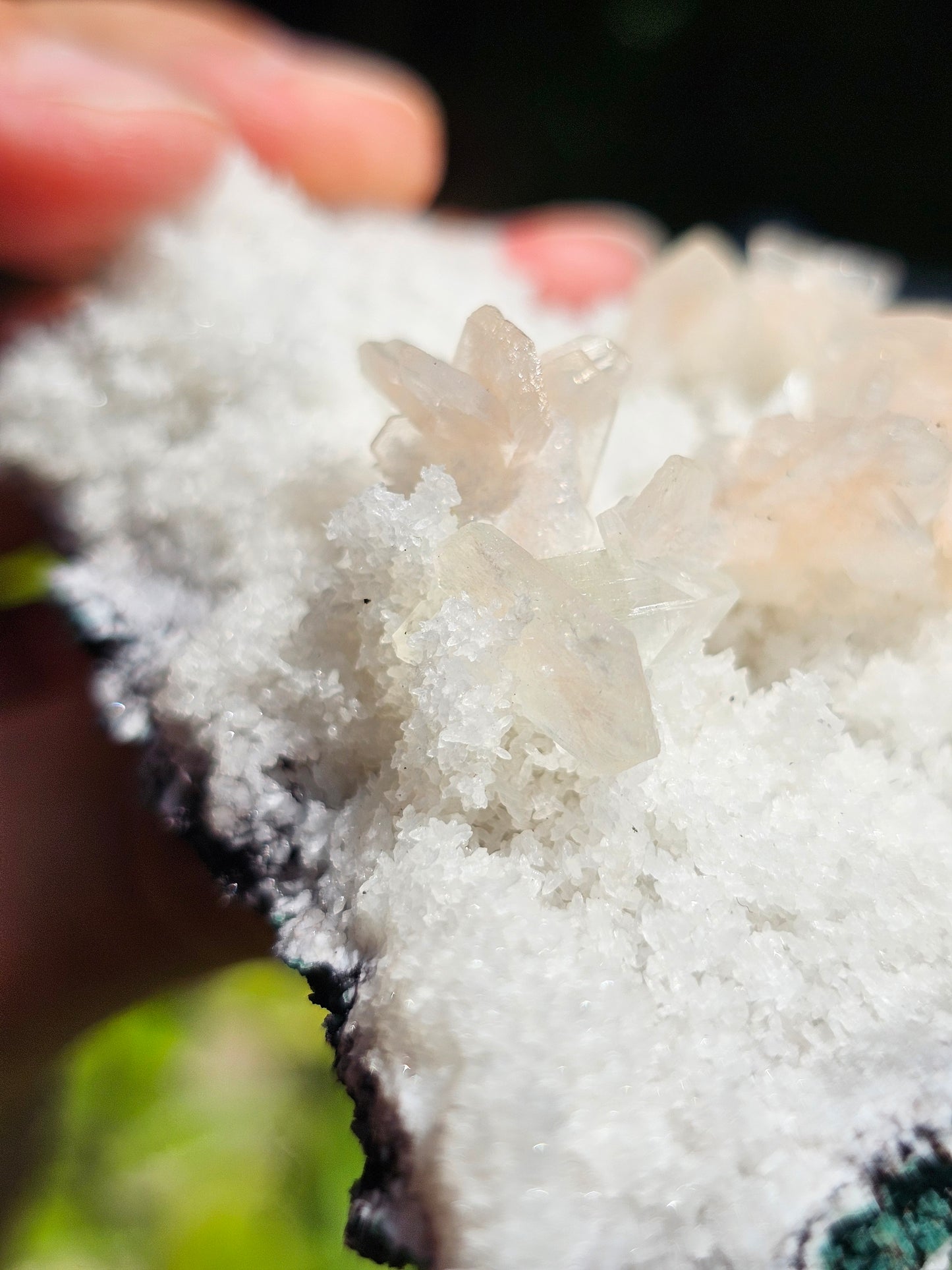 Magnifique combo d'apophyllite, apophyllite verte, stilbite sur une calcédoine blanche en provenance d'Inde.