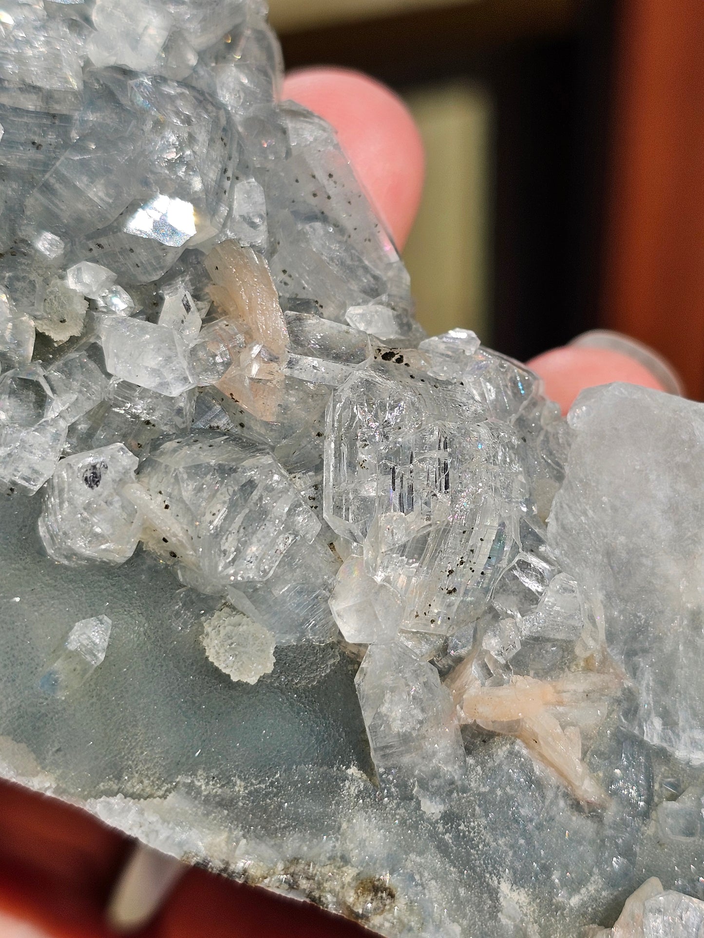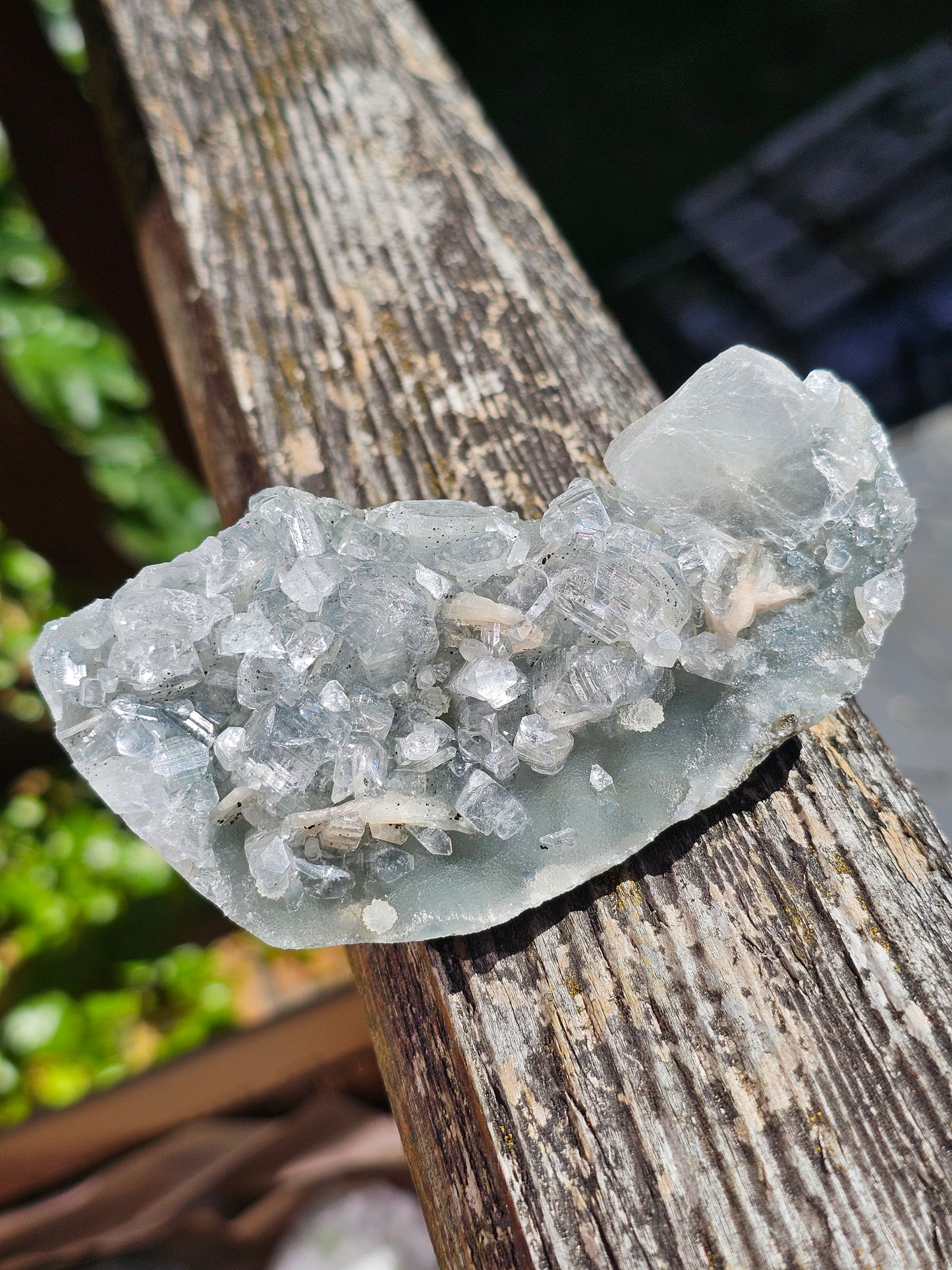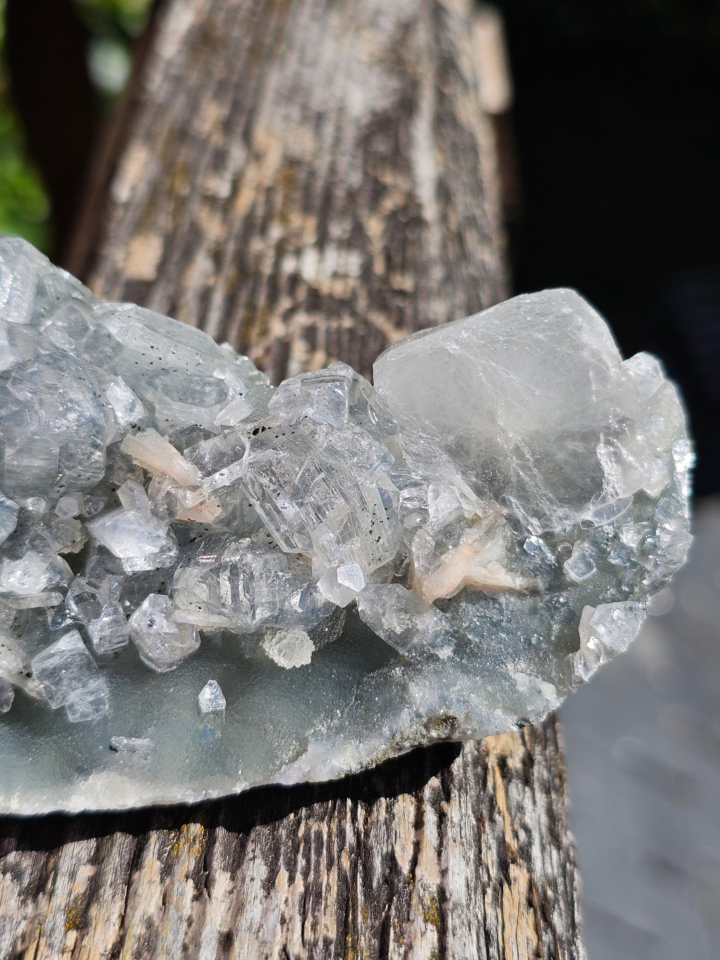 Jolie Apophyllite et Stilbite sur Calcédoine bleue en provenance d'Inde.