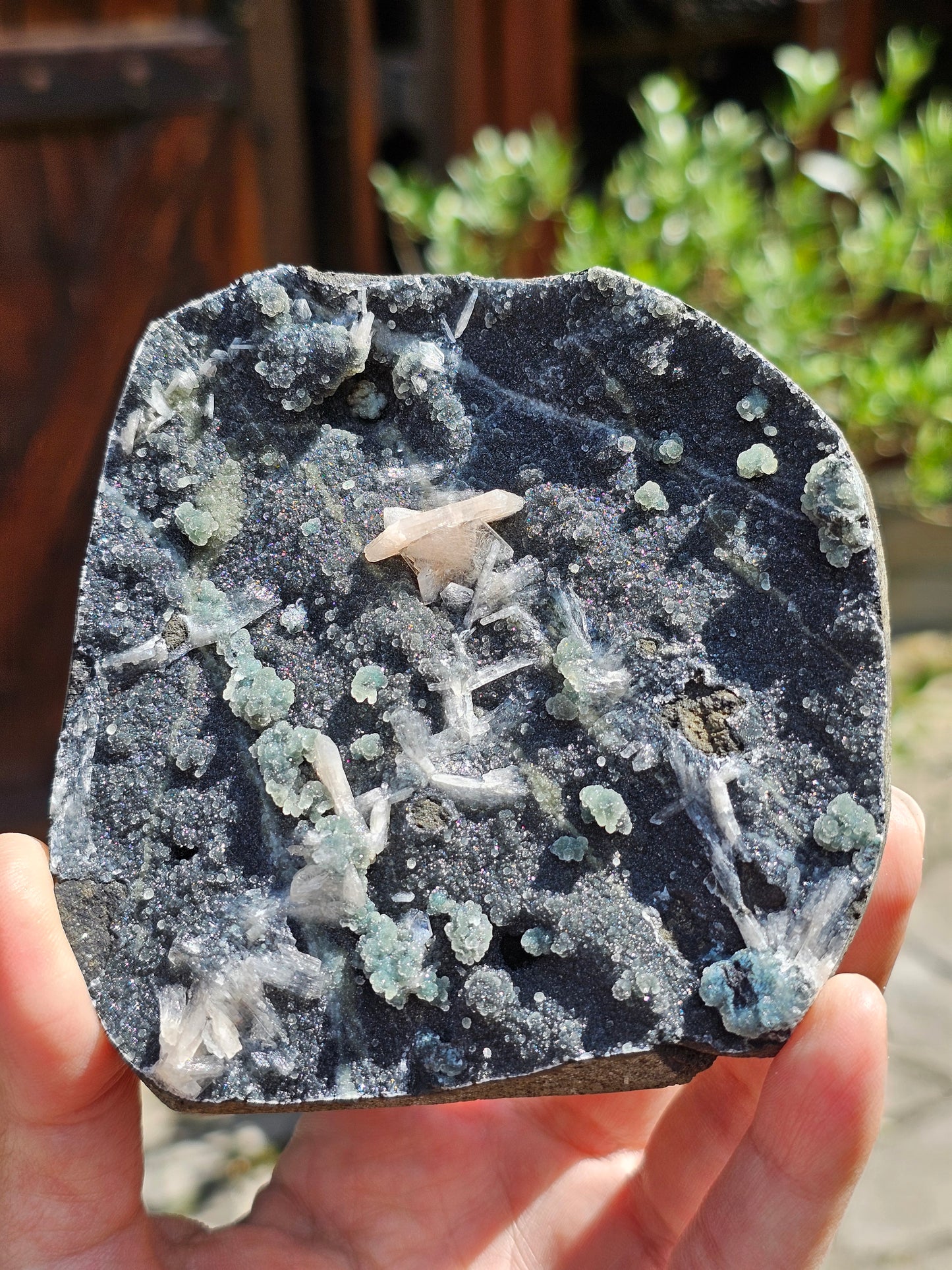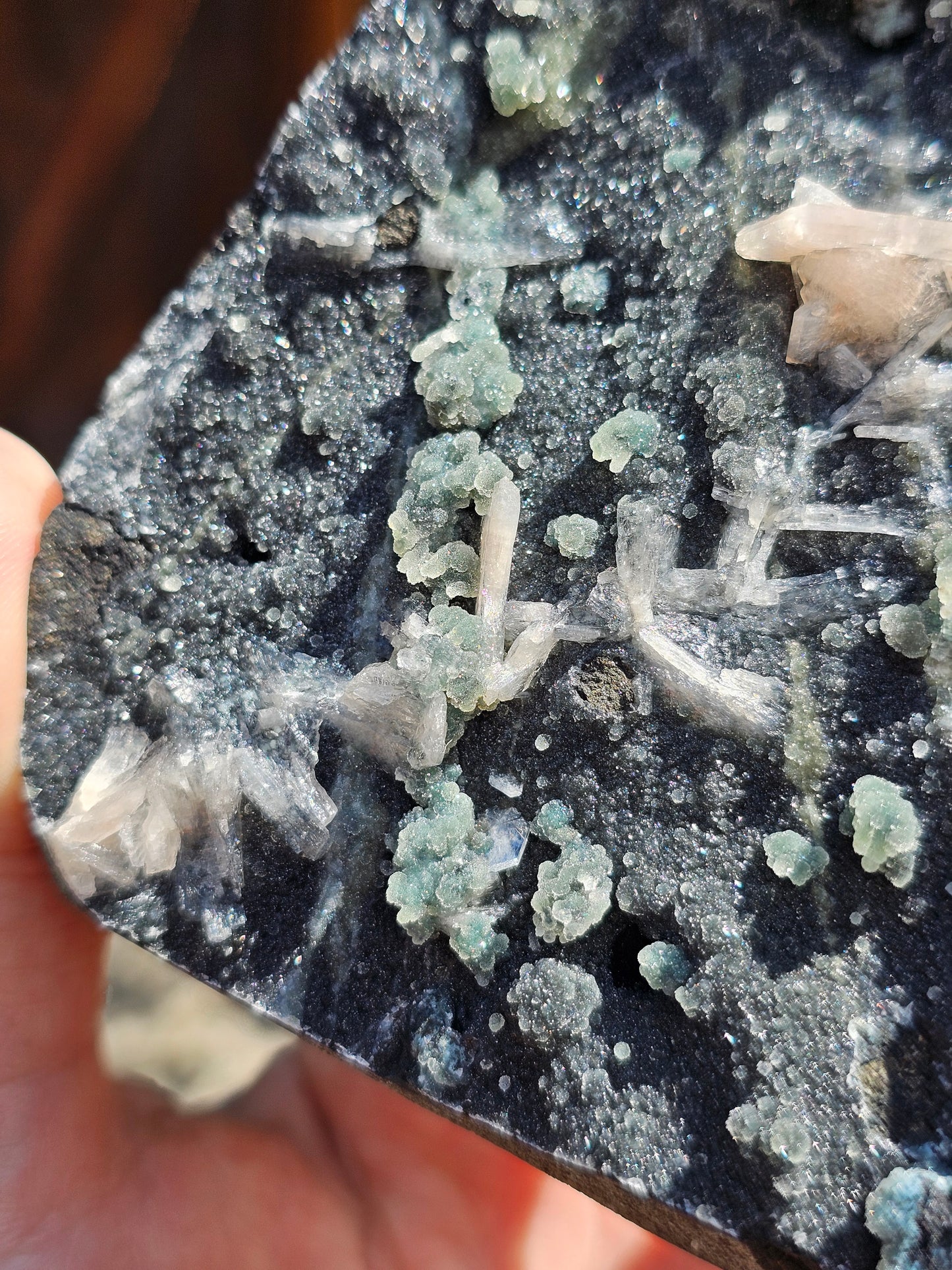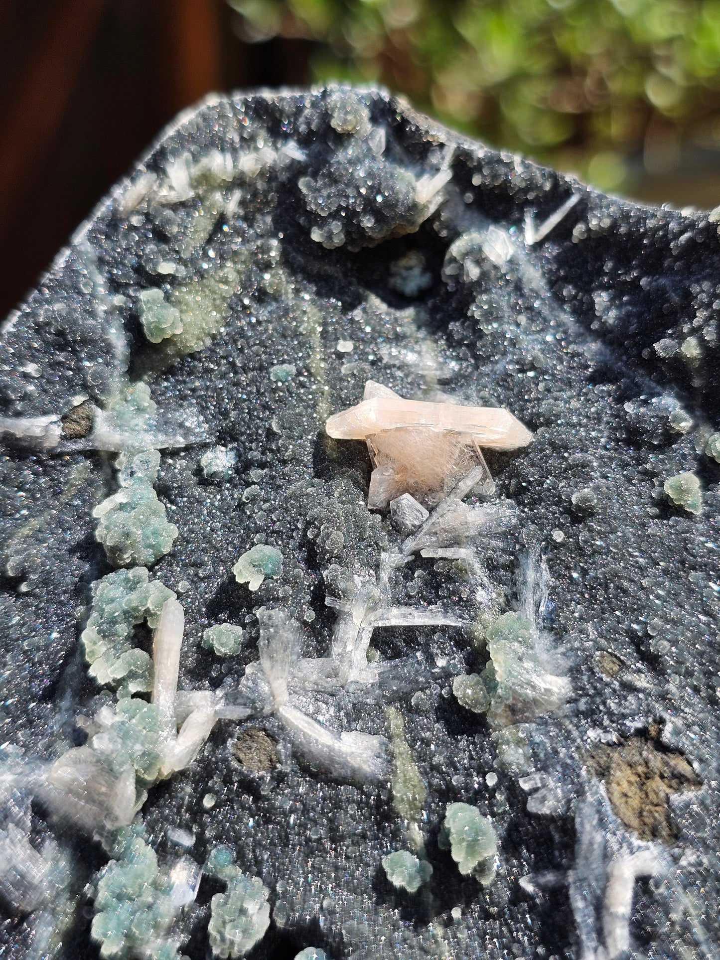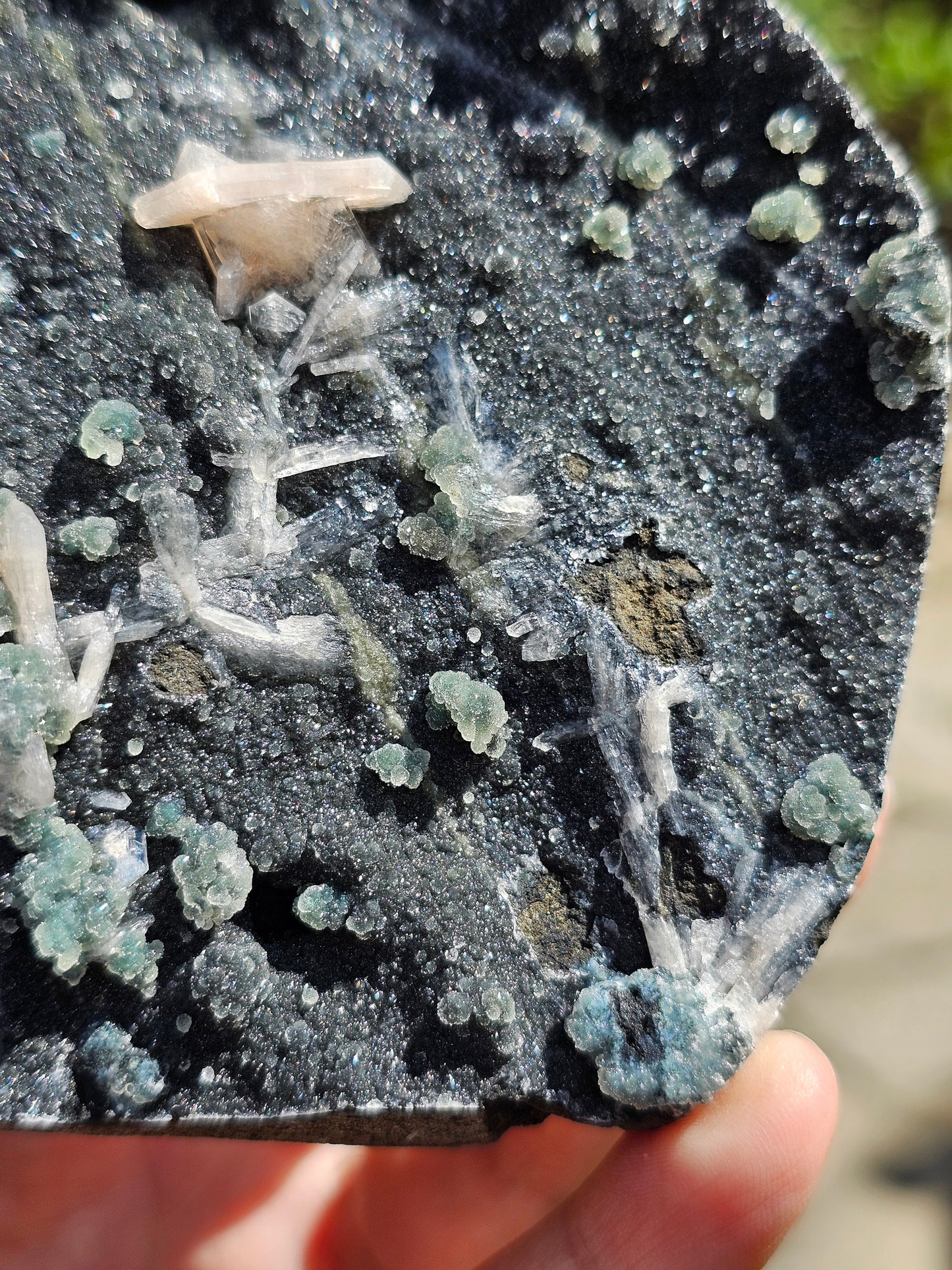 Superbe Apophyllite, Prehnite sur Calcédoine noire avec un touche de Stilbite en provenance d'Inde.