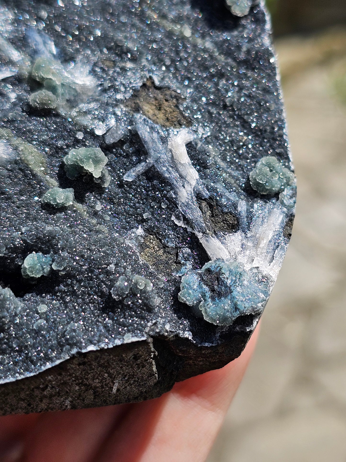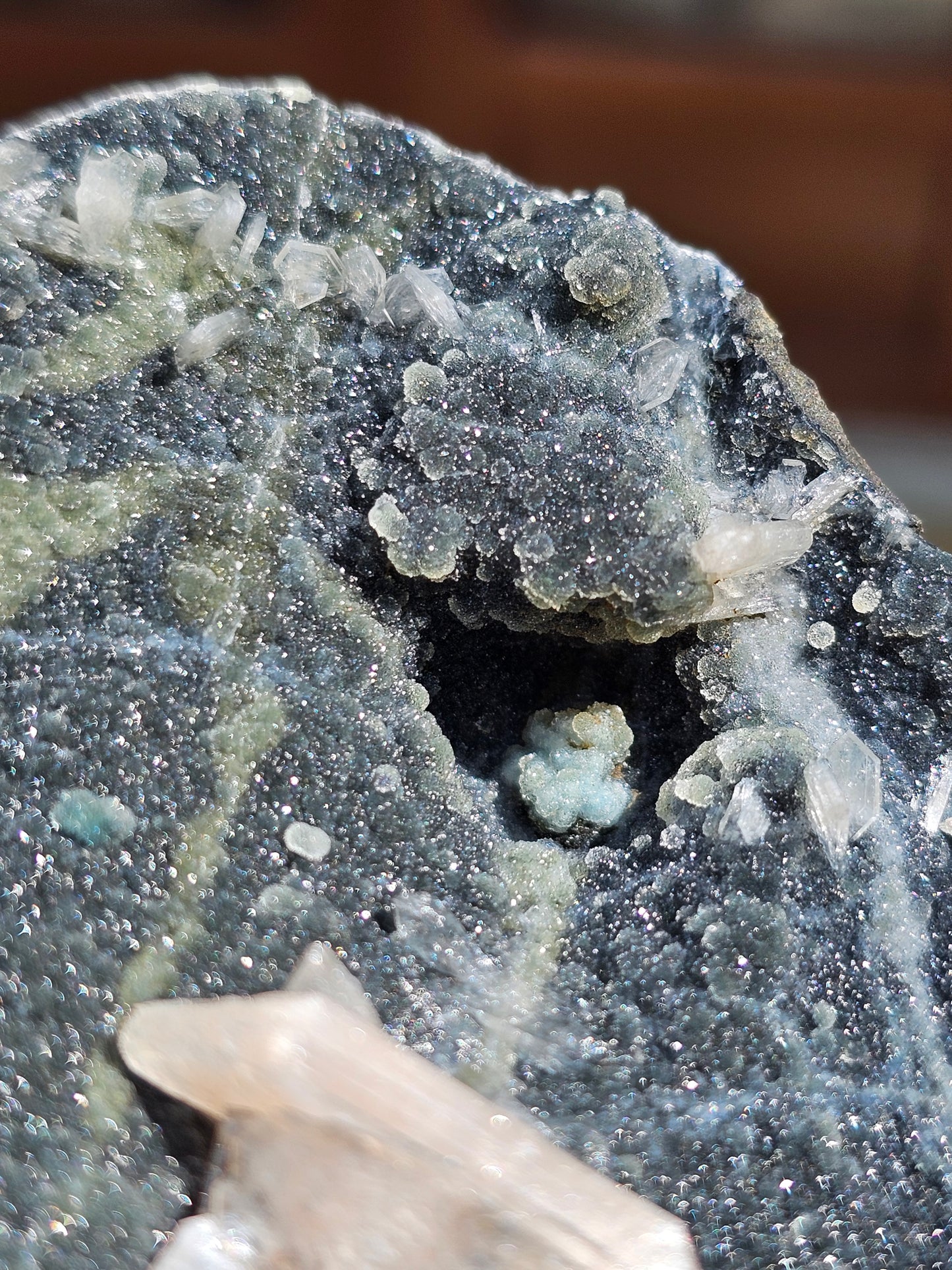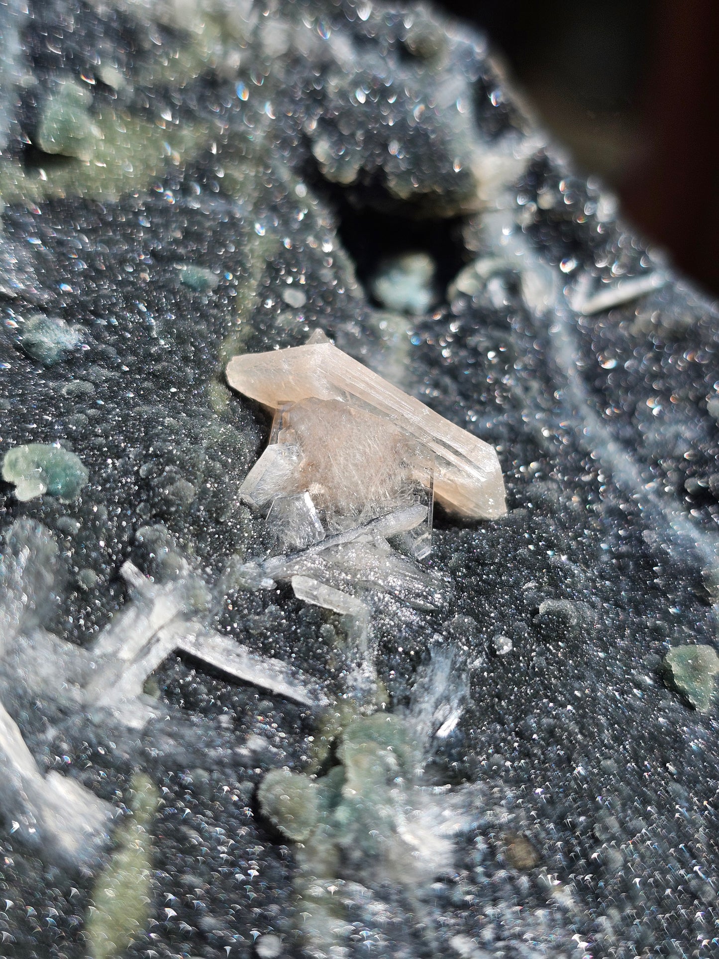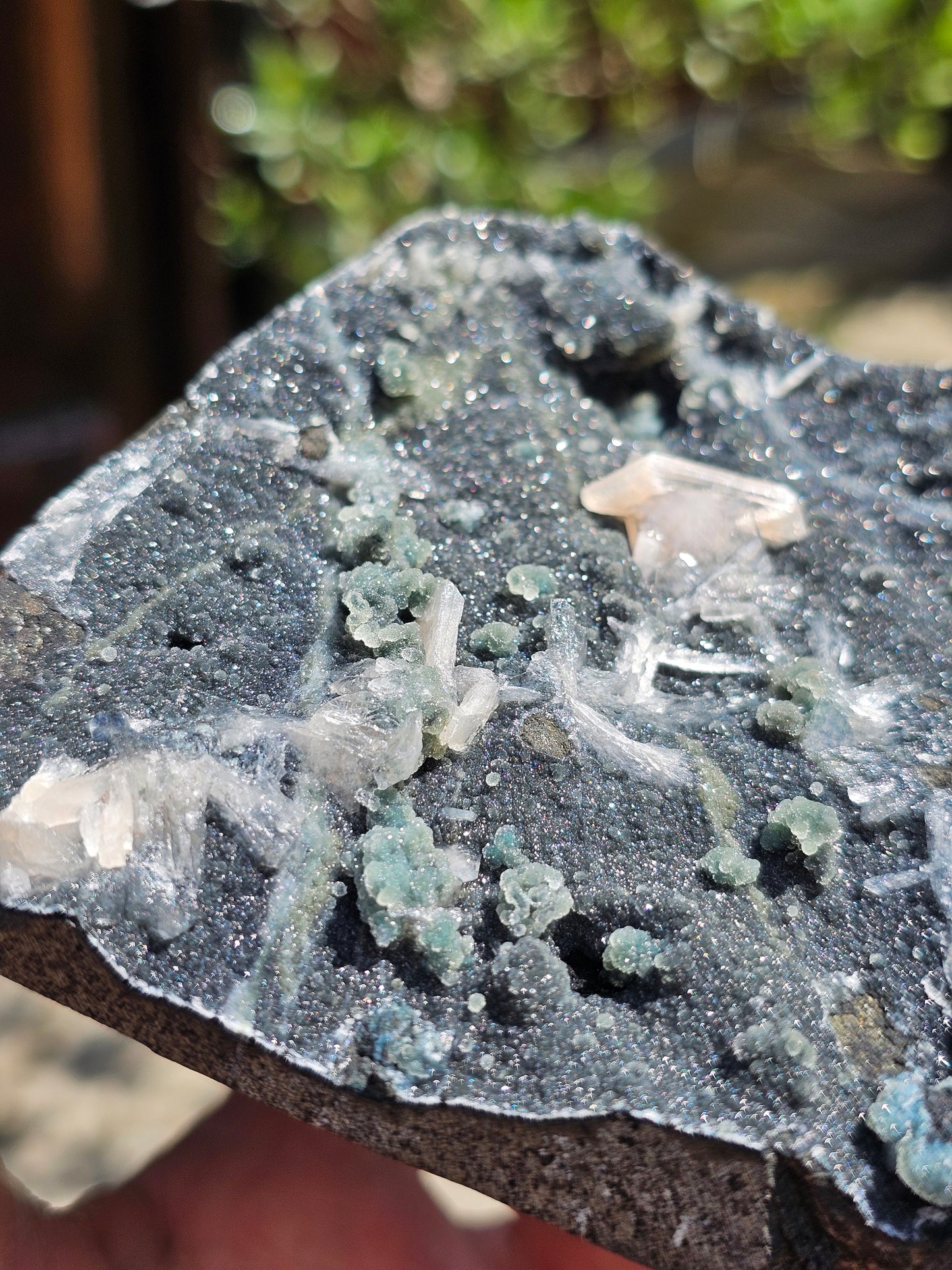 Superbe Apophyllite, Prehnite sur Calcédoine noire avec un touche de Stilbite en provenance d'Inde.