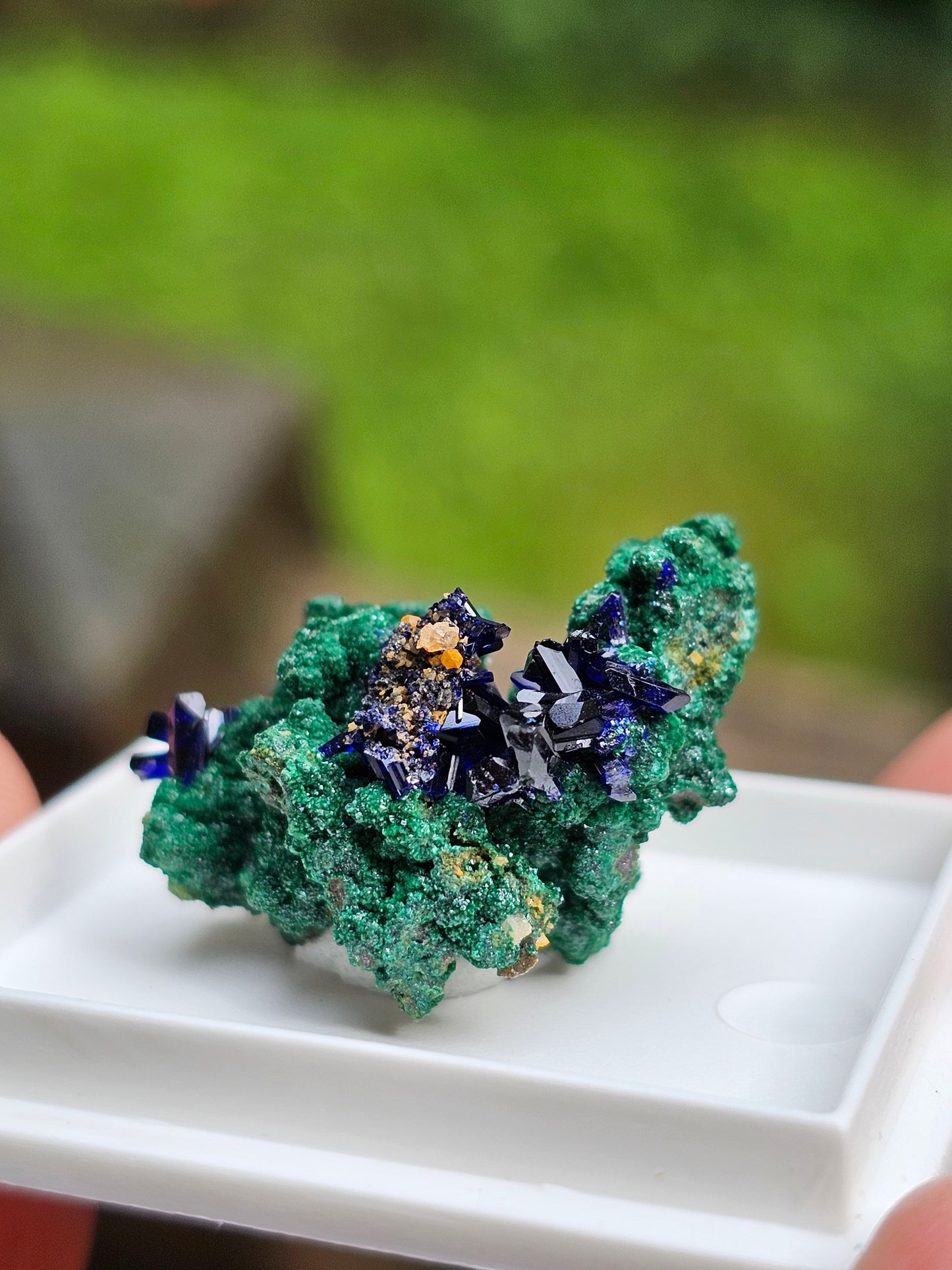 Magnifique Azurite avec Malachite du Maroc, vendue dans sa boîte vitrine.