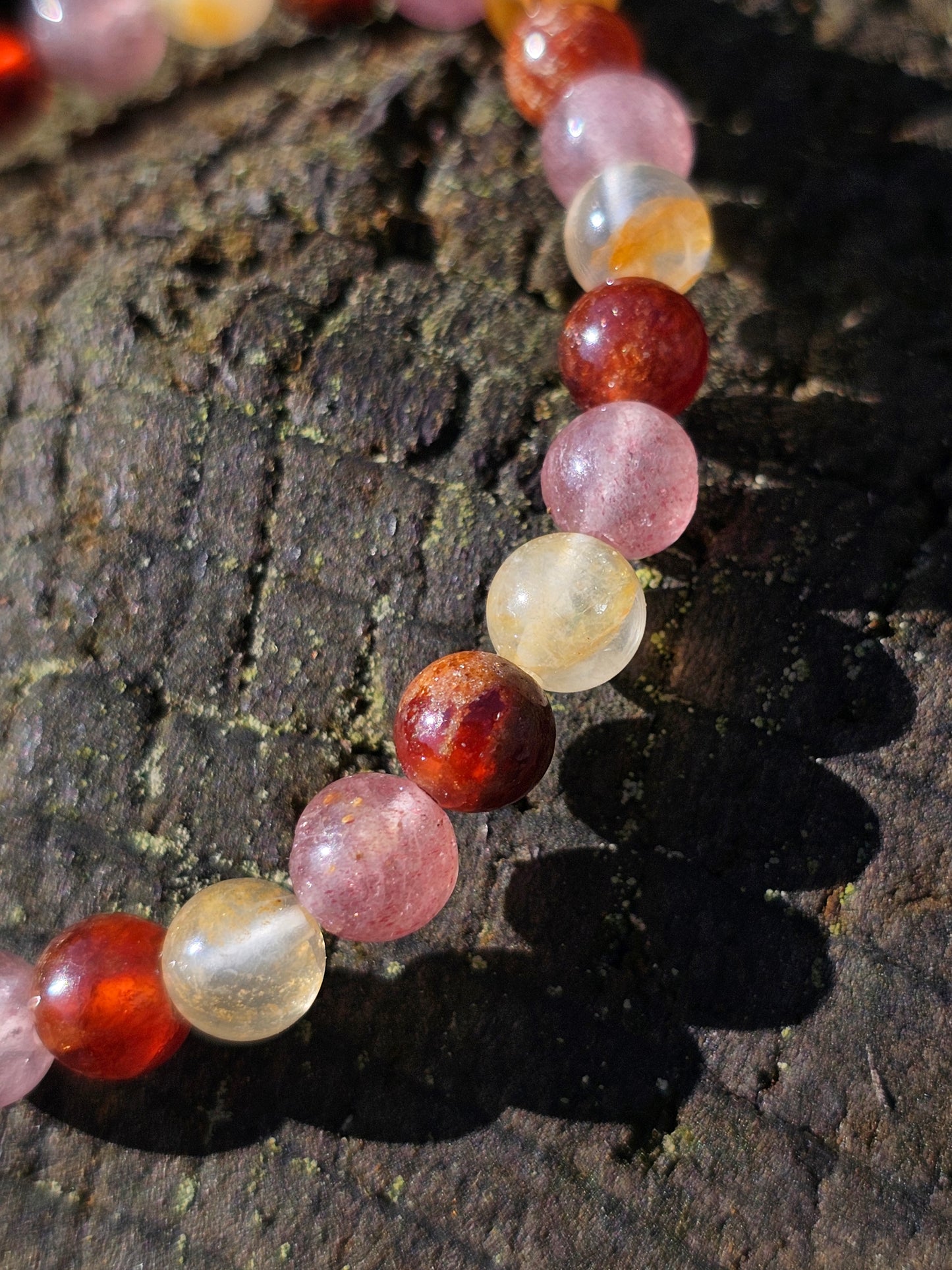 Jolie bracelet élastique composé de perles de Grenat hessonite (grenat orange), quartz fraise et quartz hématoïde jaune (golden healer) de 6mm.