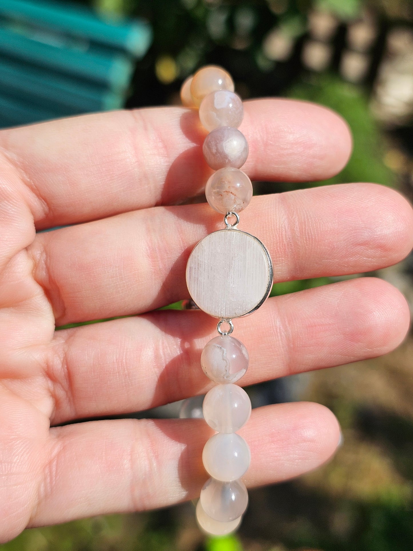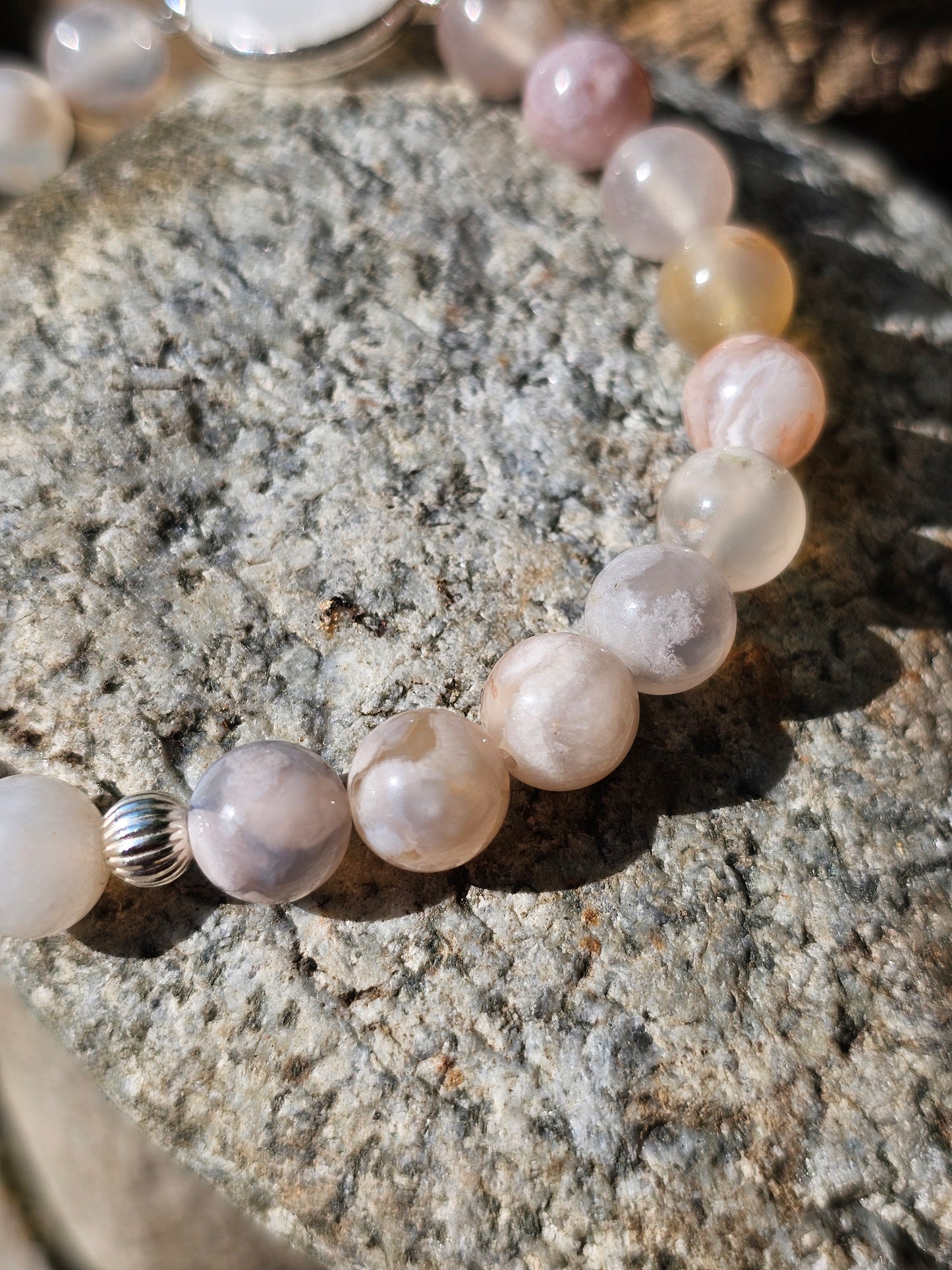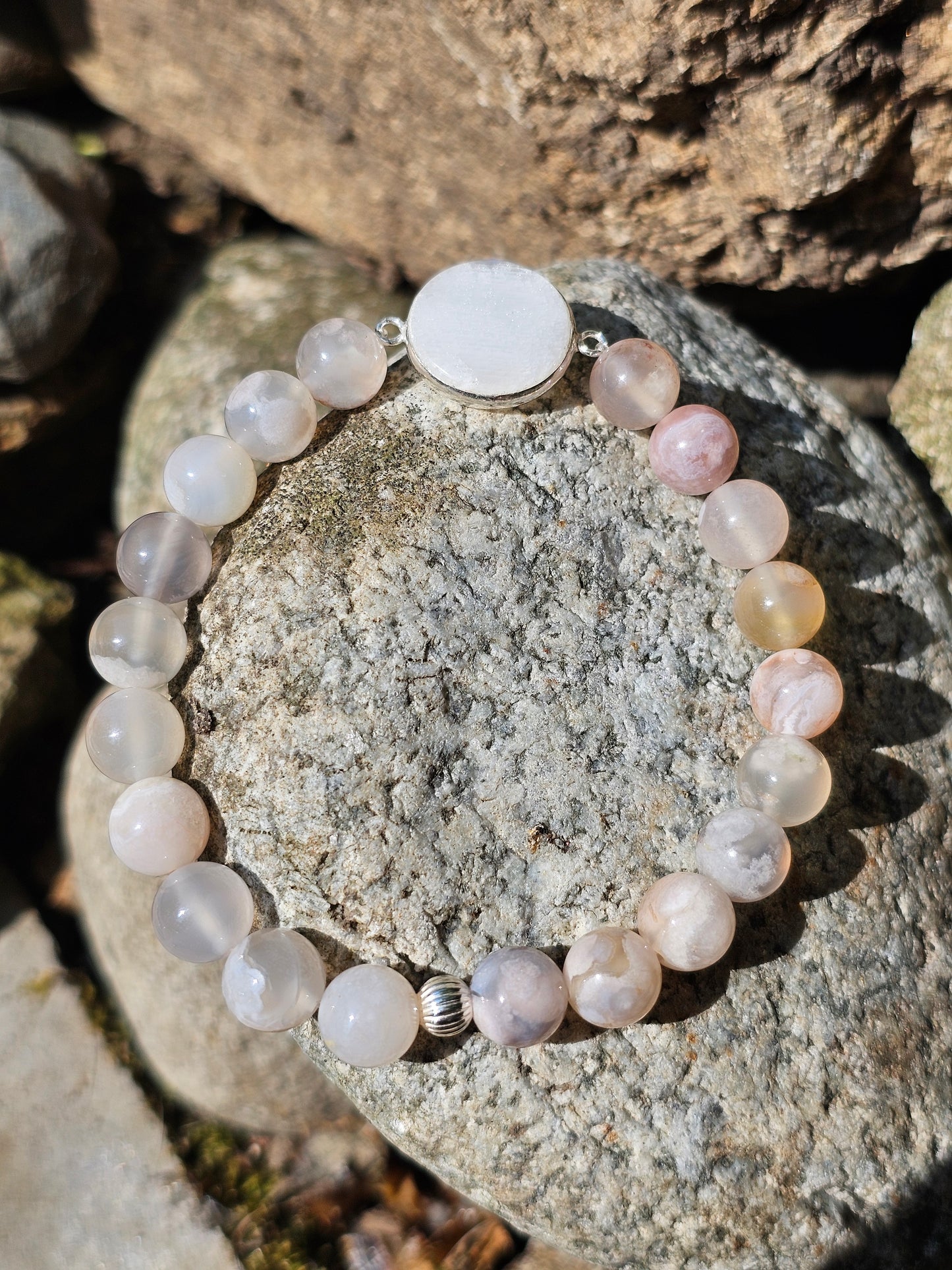 Magnifique bracelet en Agate fleurs de cerisier en 8mm, une perle en argent 925 en 5mm et rond en pierre de lune 20mm.