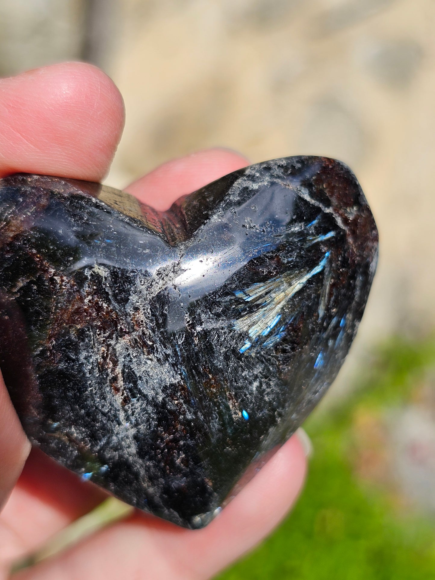 Cœur d'Arfvedsonite de Russie, au taillage au peu brut. Très original avec ses beaux filaments bleus et dorés.