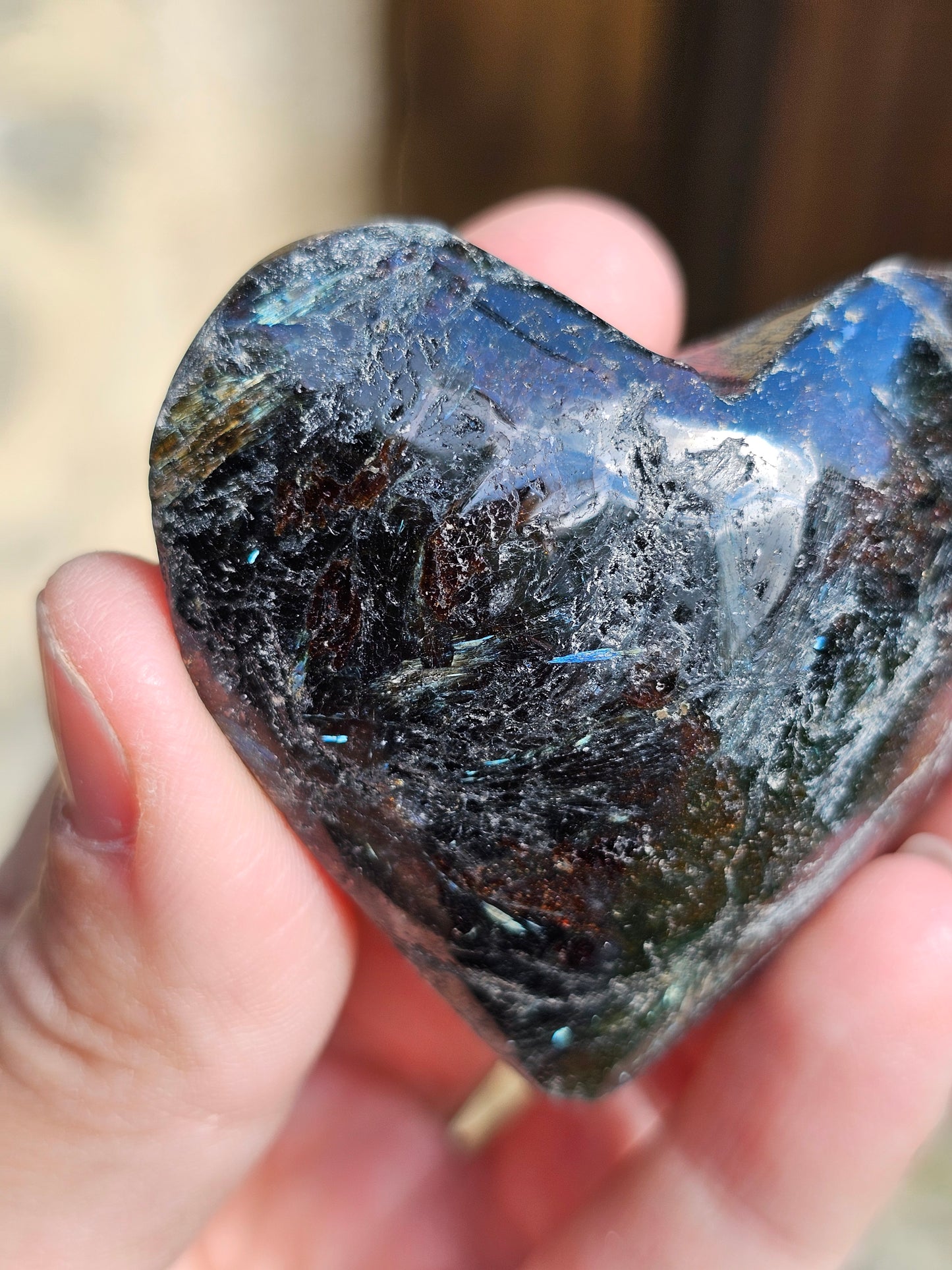 Cœur d'Arfvedsonite de Russie, au taillage au peu brut. Très original avec ses beaux filaments bleus et dorés.