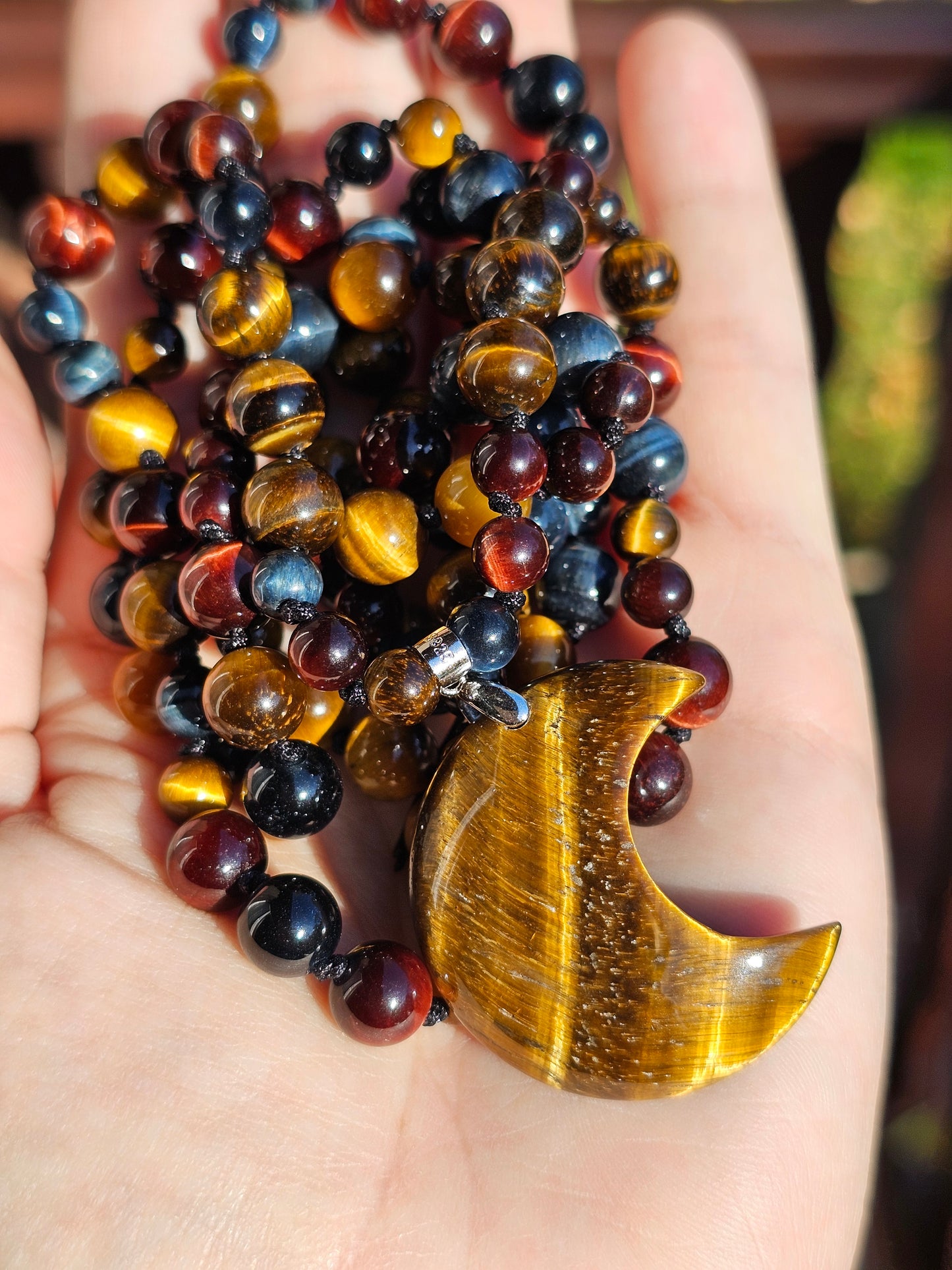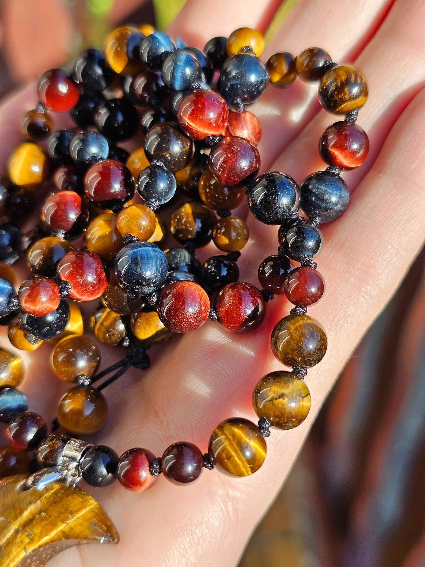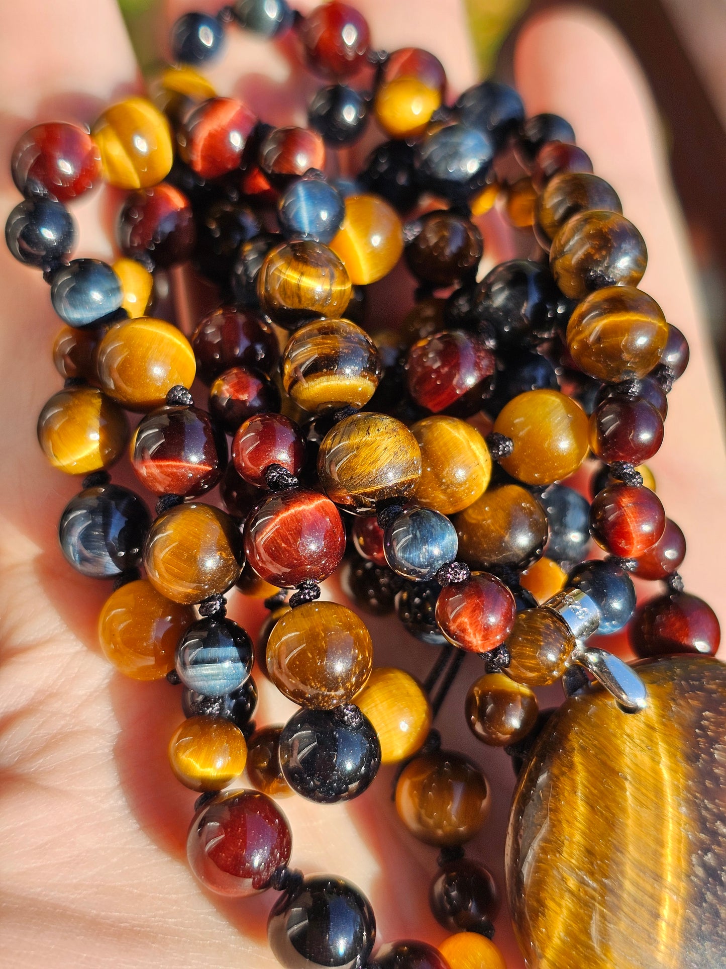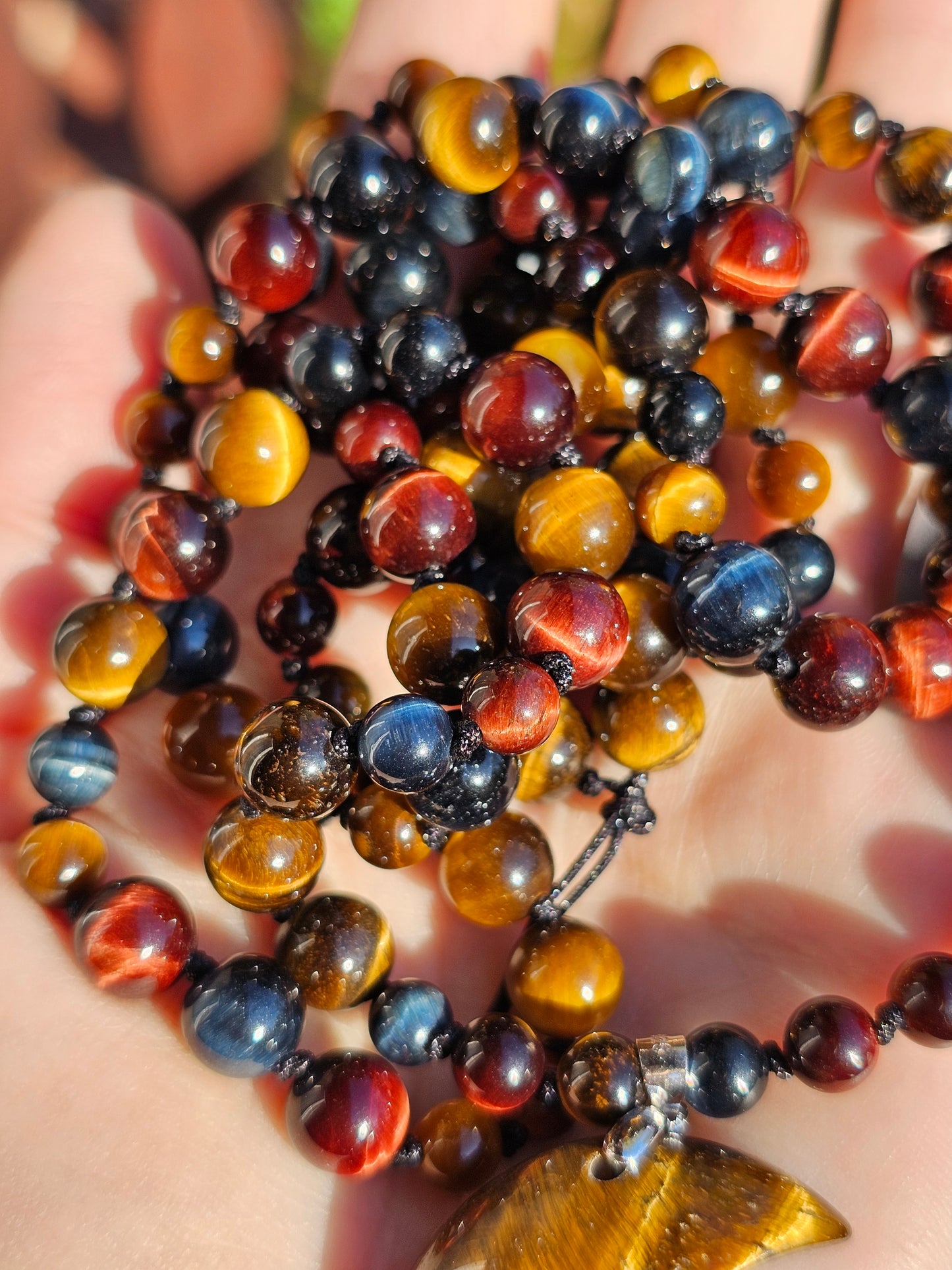 Mala de 108 perles en perles naturelles d'œil multiple : œil de tigre, œil de faucon et œil de taureau (6mm et 8mm), séparées chacune par un nœud.