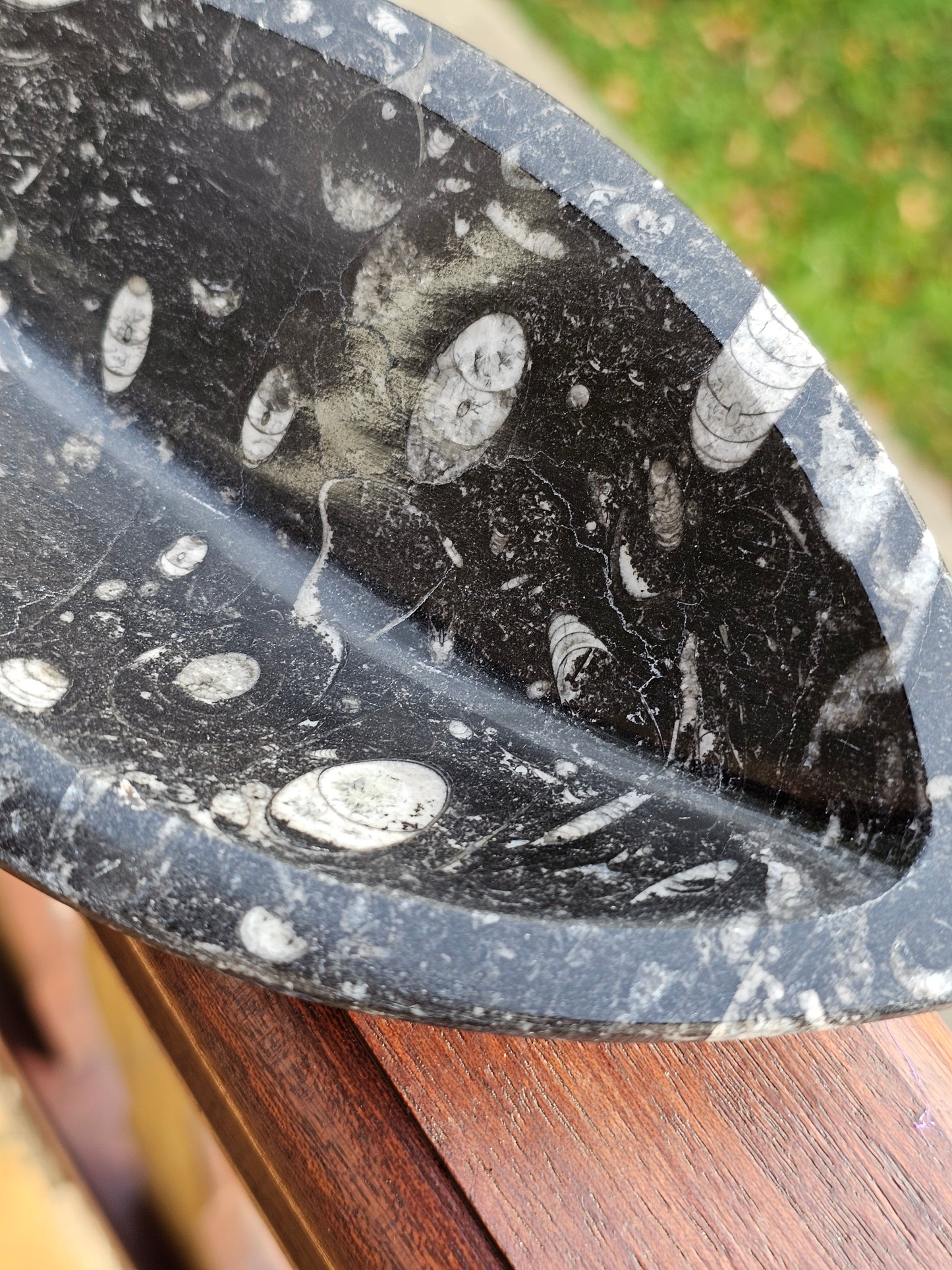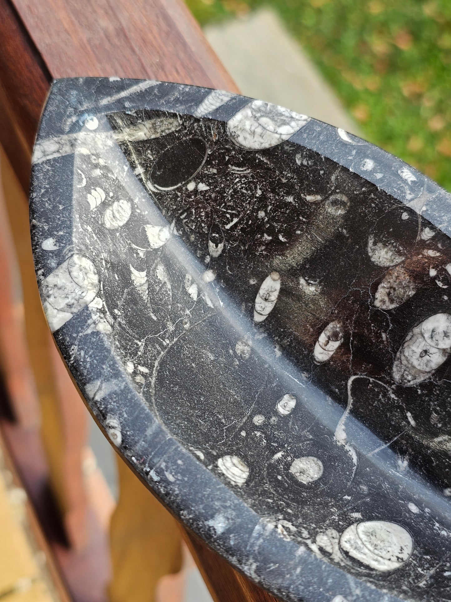 Jolie coupelle en Orthoceras du Maroc façonnée à la main par des artisans locaux, ce qui lui donne un aspect unique et un beau polissage.