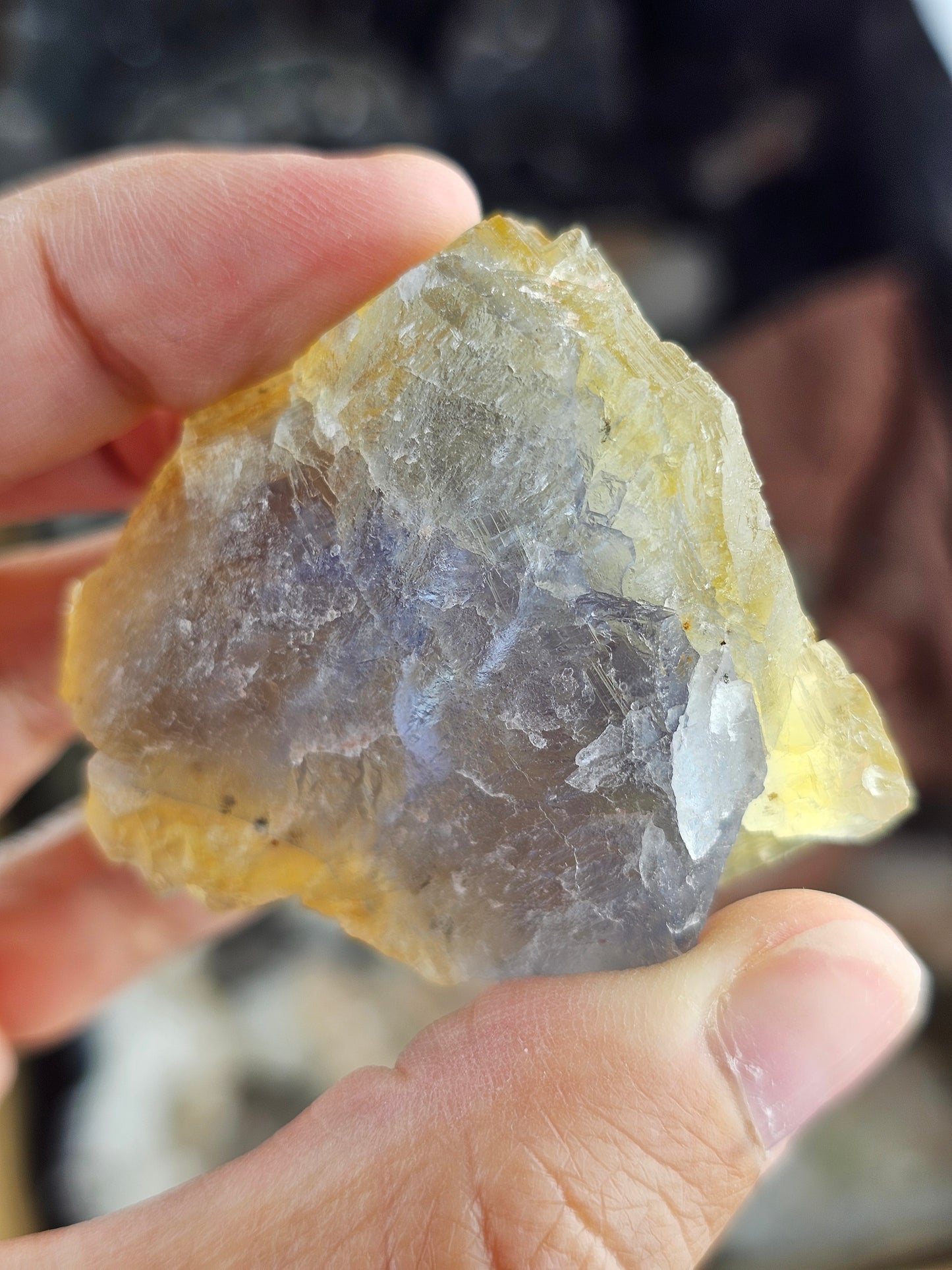 Jolie Fluorite brute du Maroc. Elle est jaune avec un coeur bleu/vert.