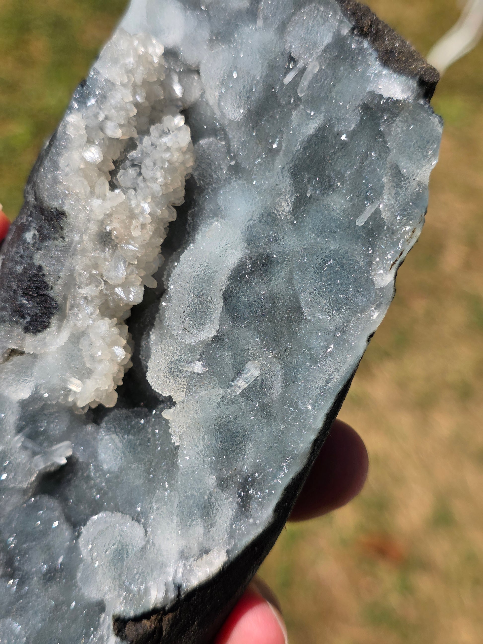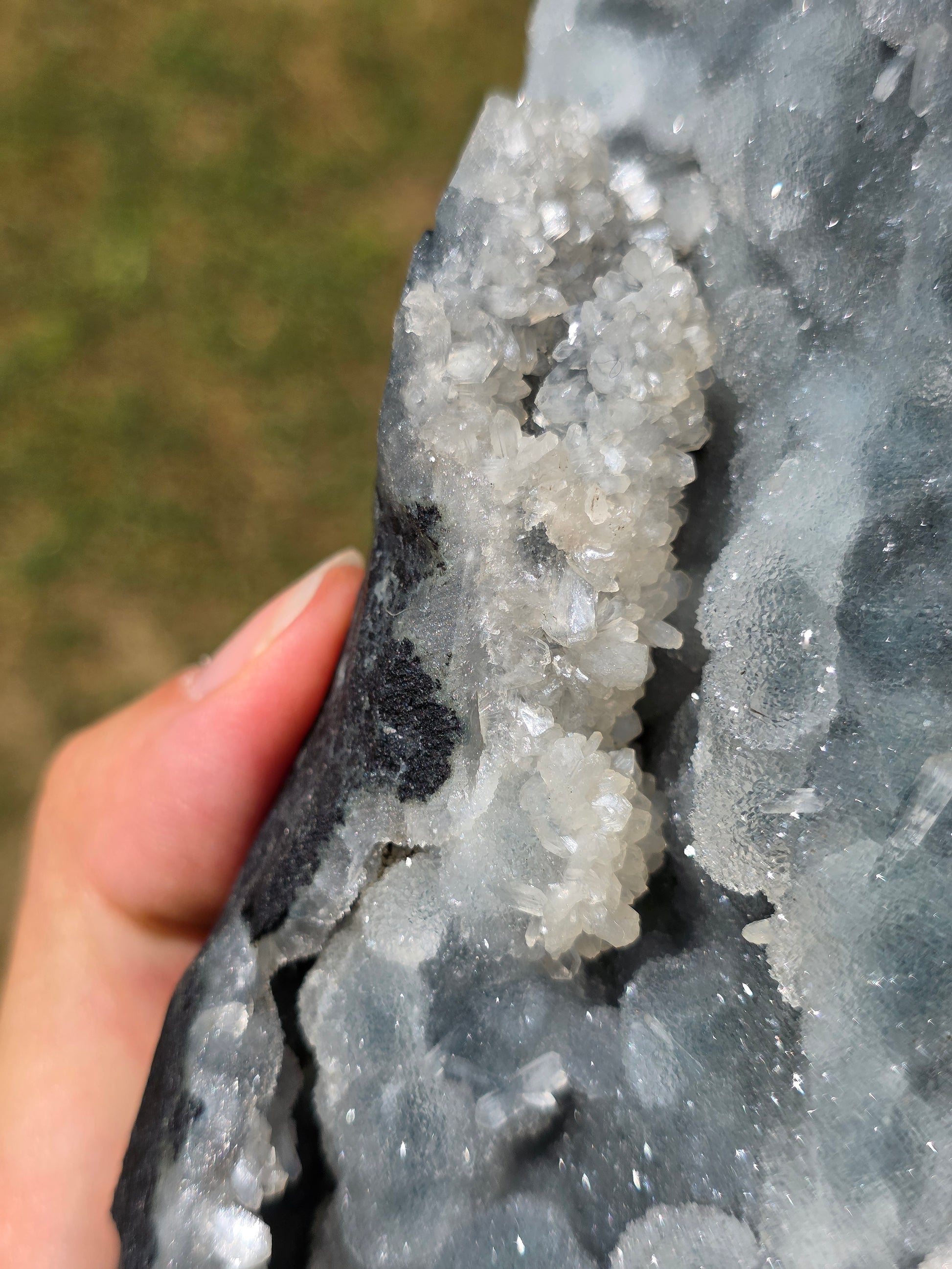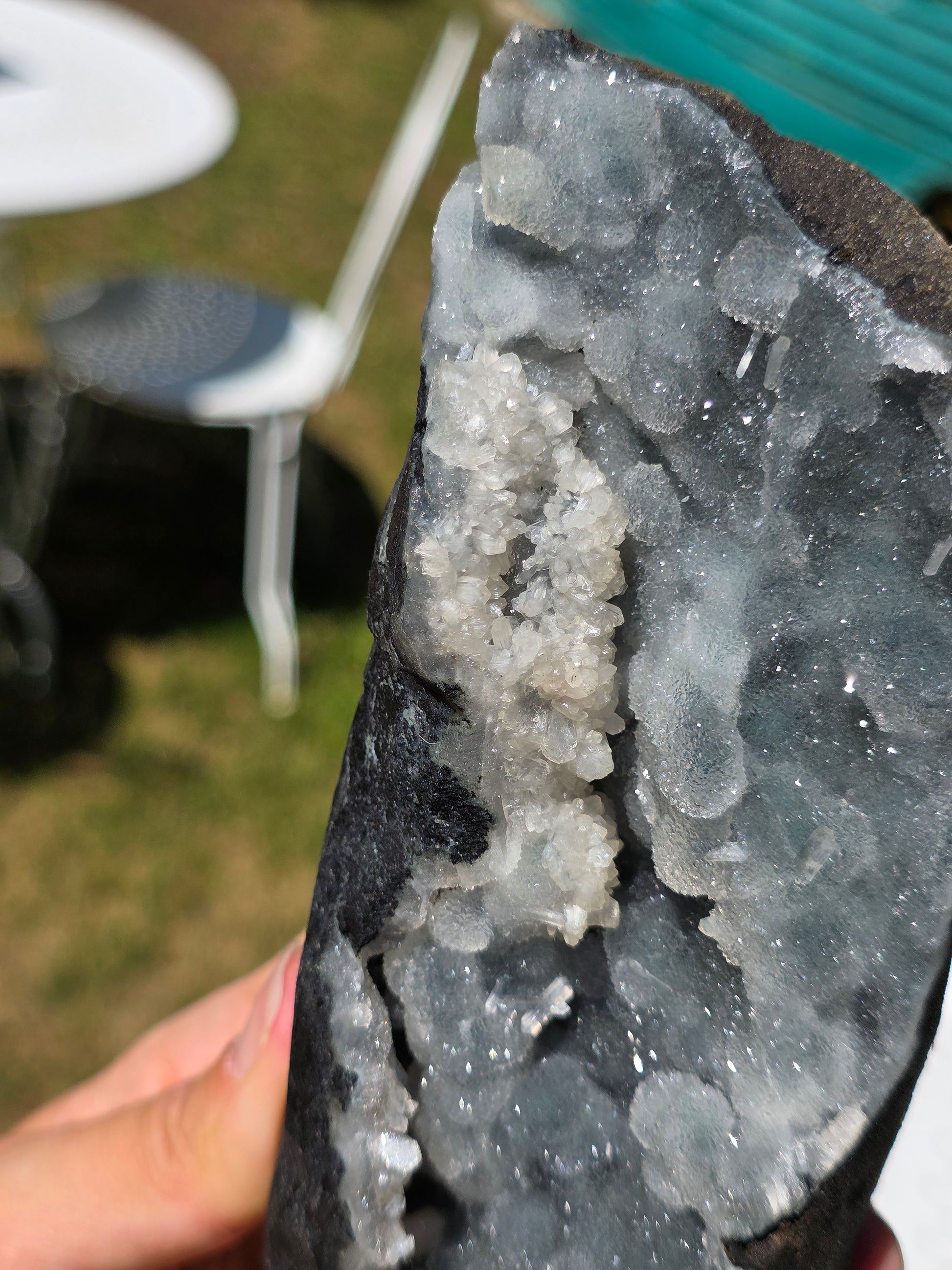 Grande Calcédoine avec Stilbite et Quartz en provenance d'Inde (vidéo ici). Le haut de la Calcédoine est cassé mais recollable d'où le prix réduit.