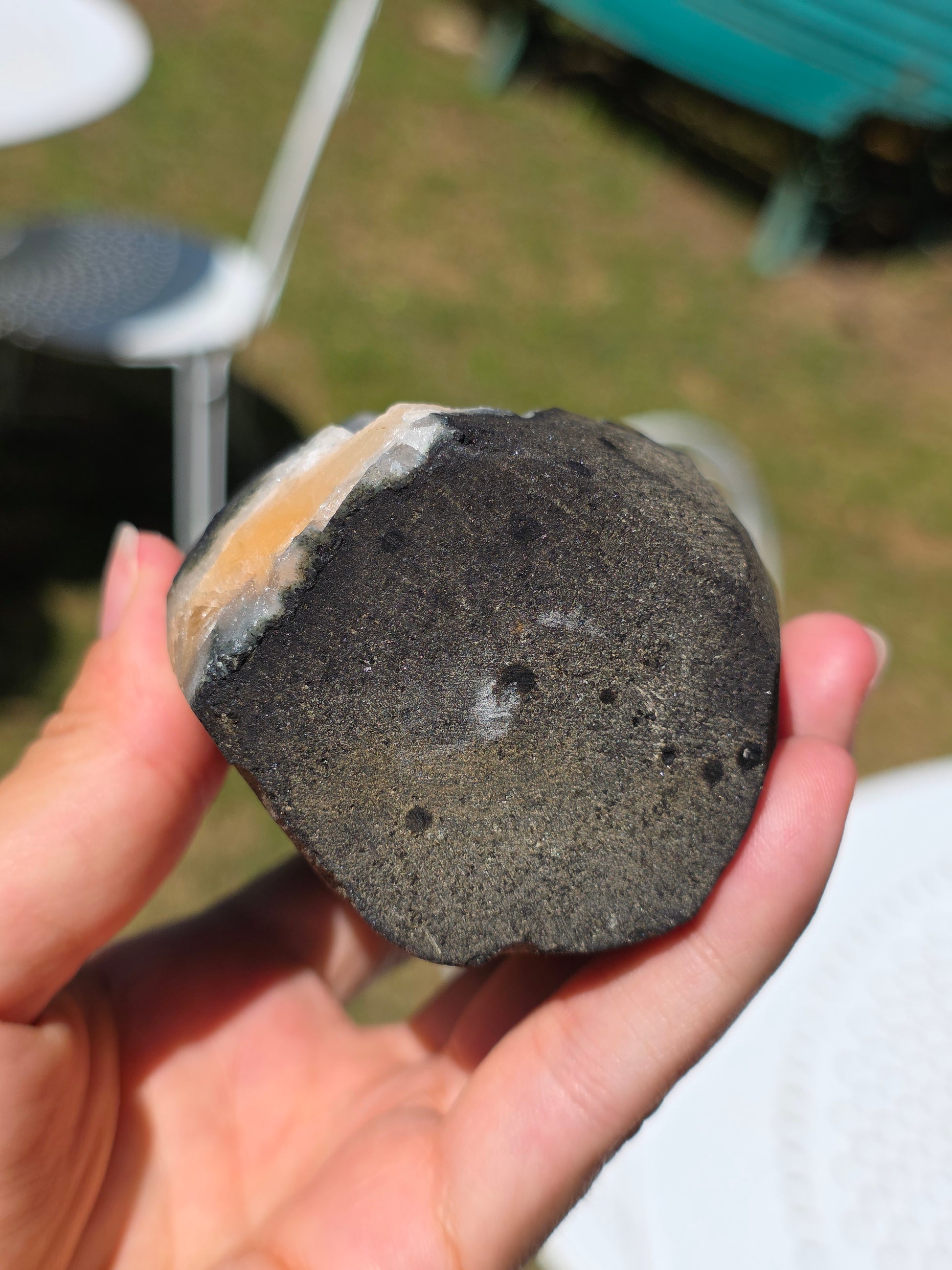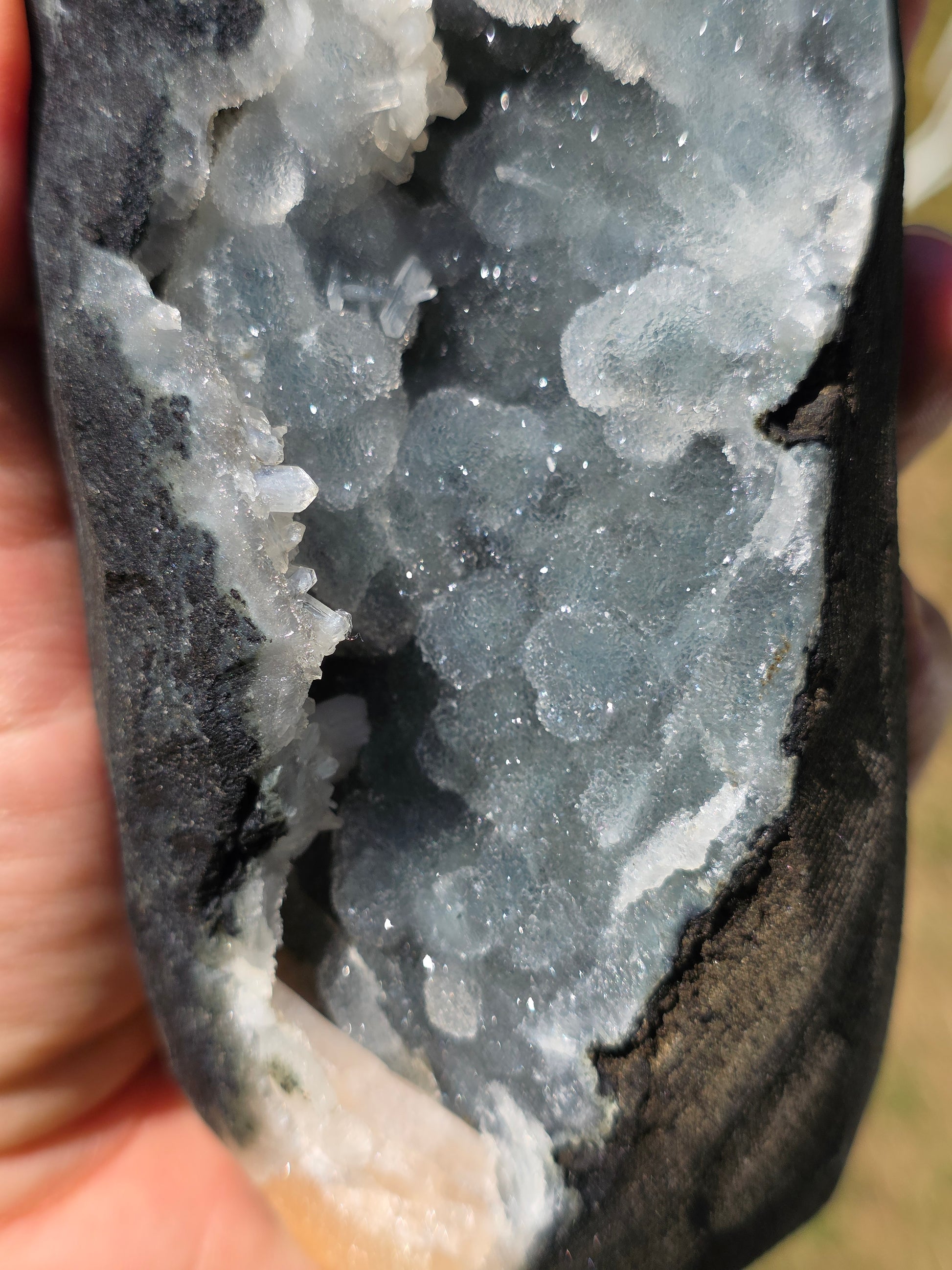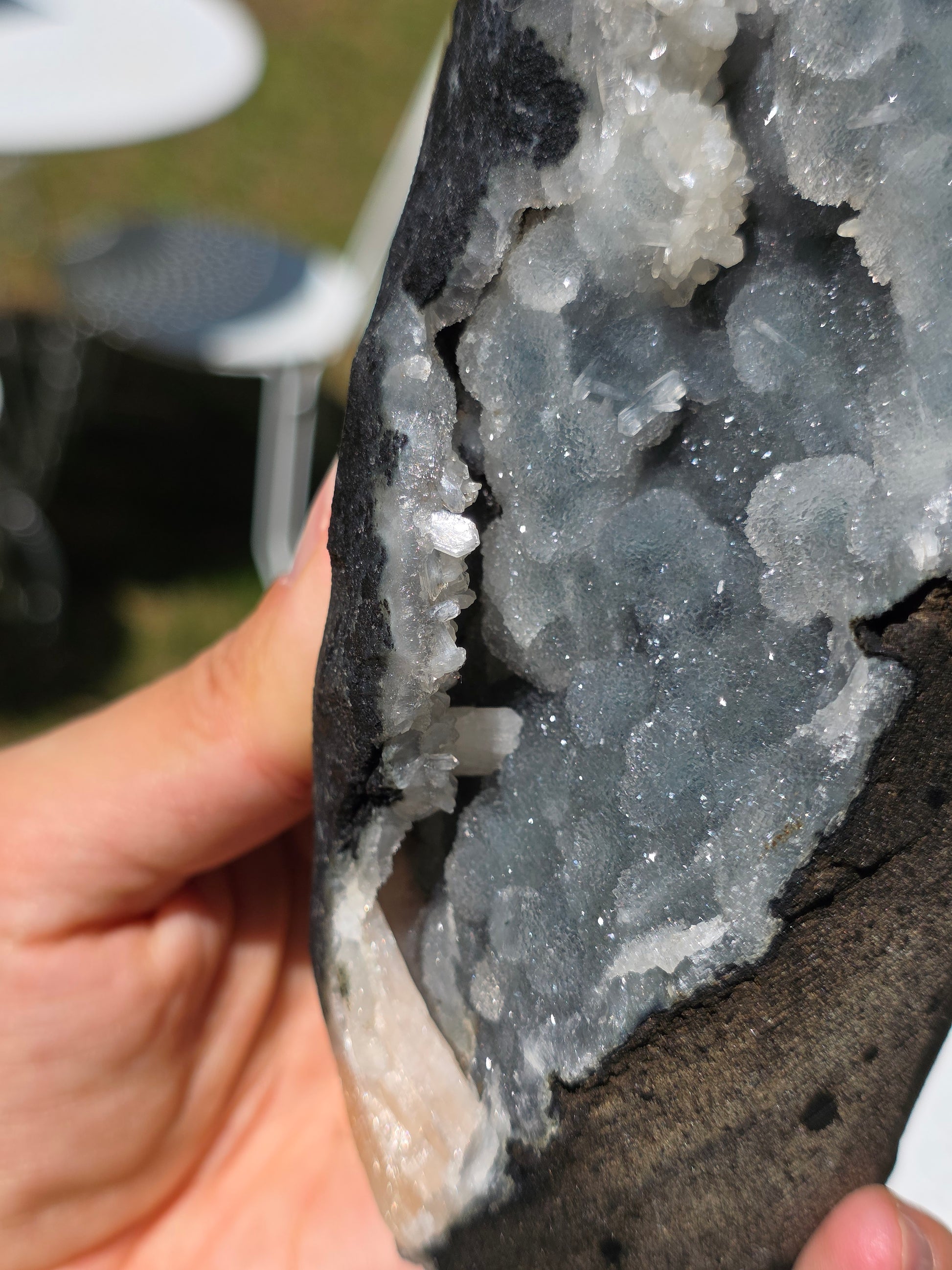 Grande Calcédoine avec Stilbite et Quartz en provenance d'Inde (vidéo ici). Le haut de la Calcédoine est cassé mais recollable d'où le prix réduit.