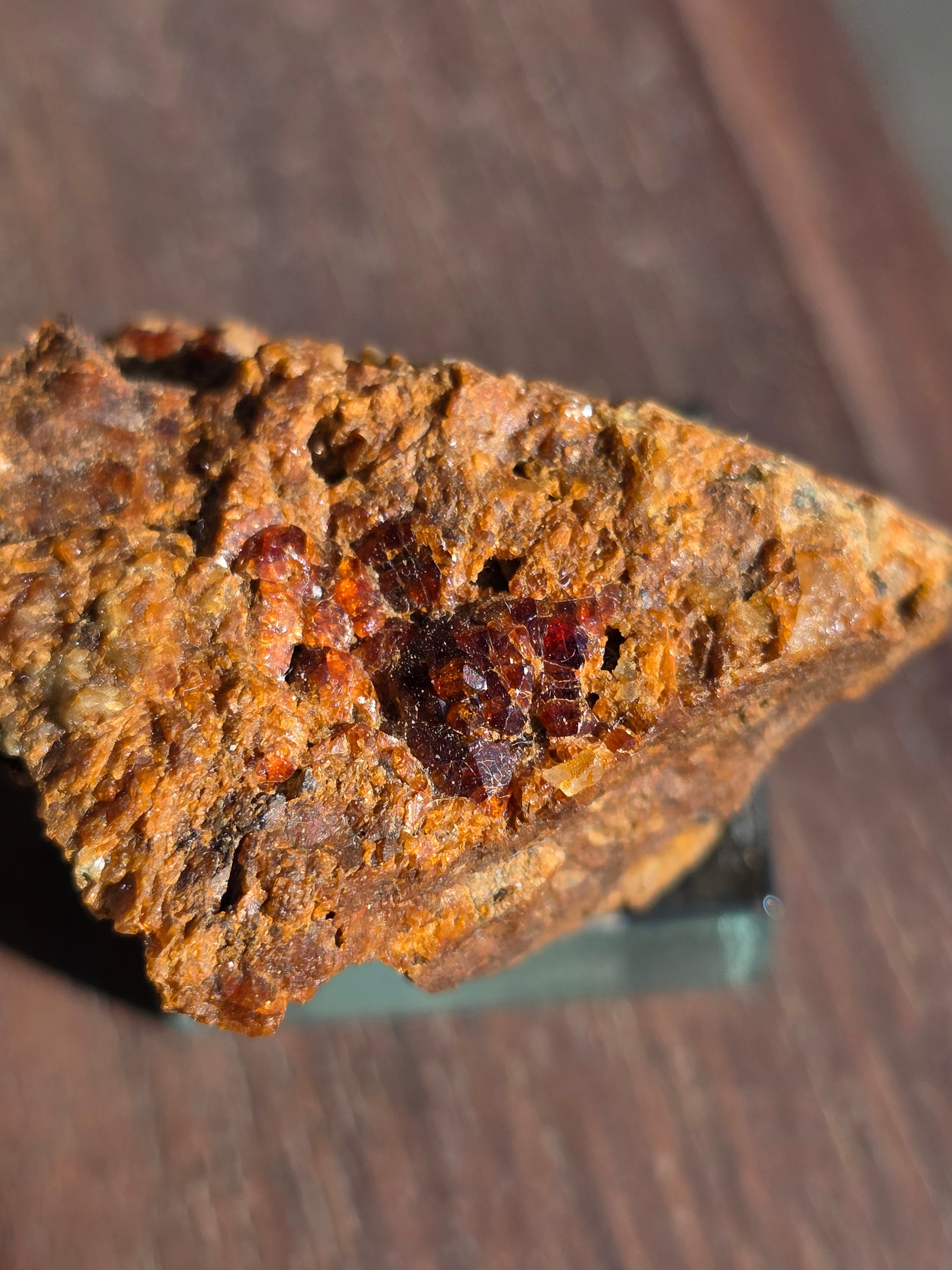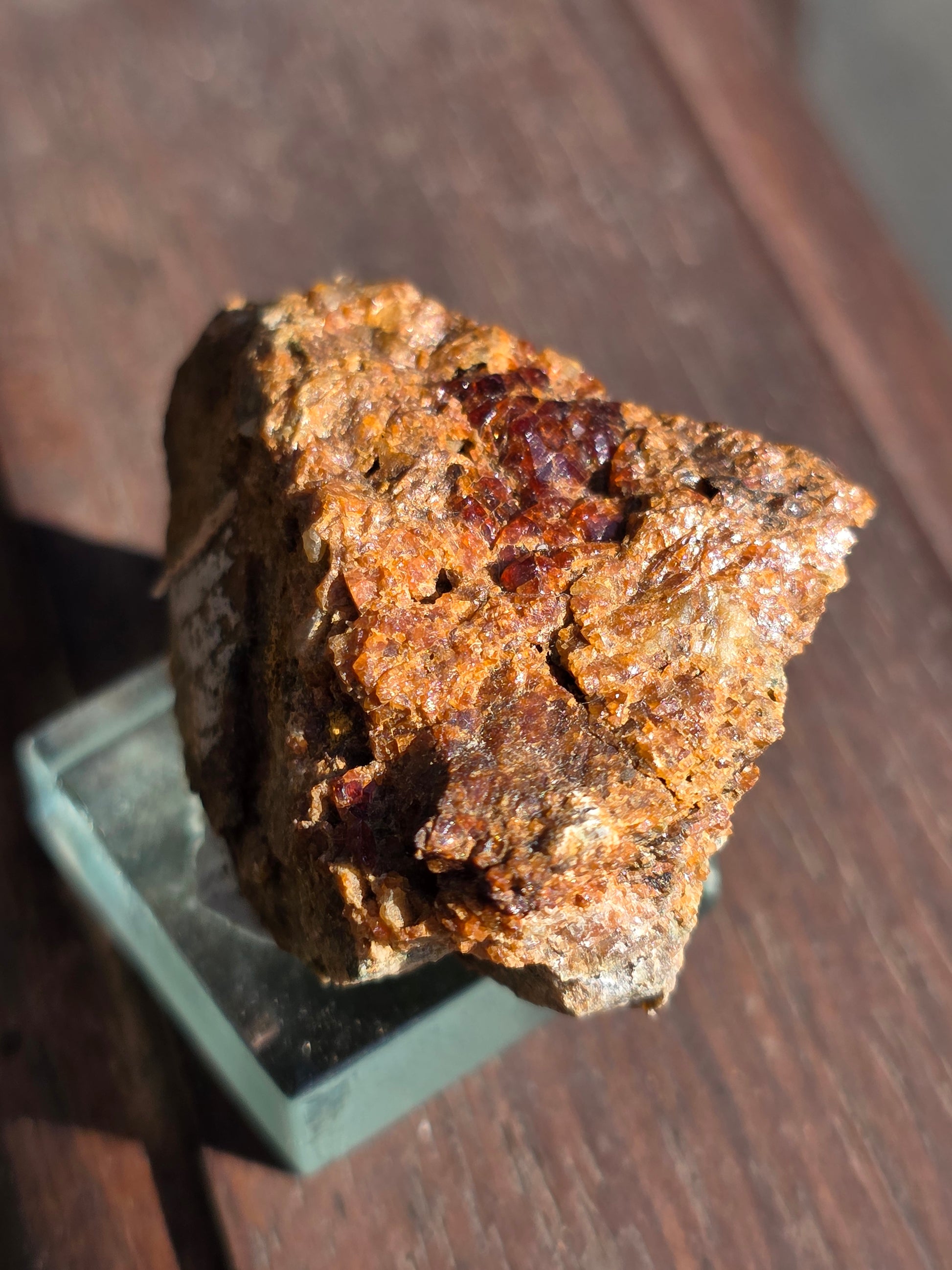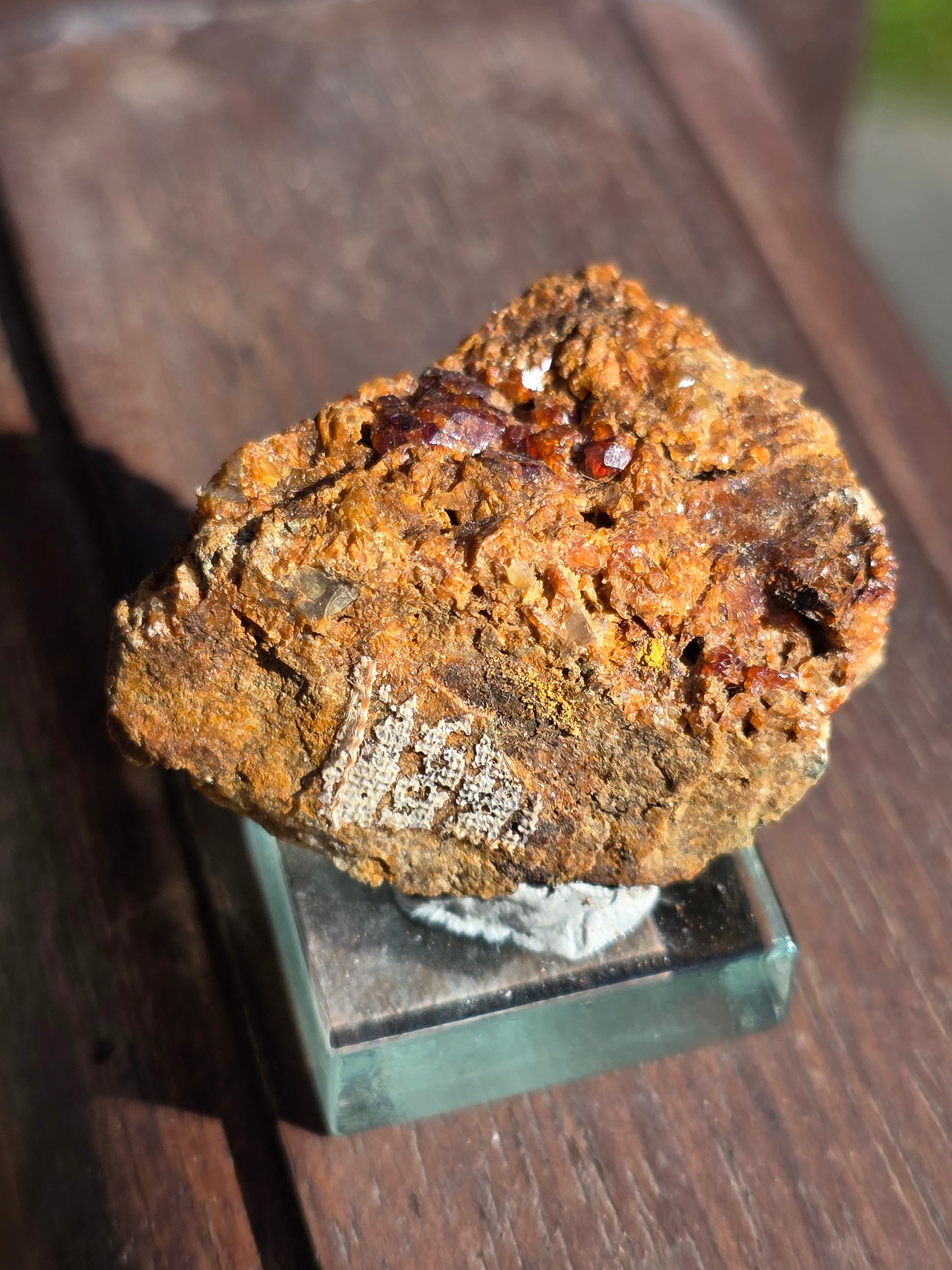 Joli grenat sur gangue de Bigorre dans le 65 (Hautes-Pyrénées) sur son socle en verre.