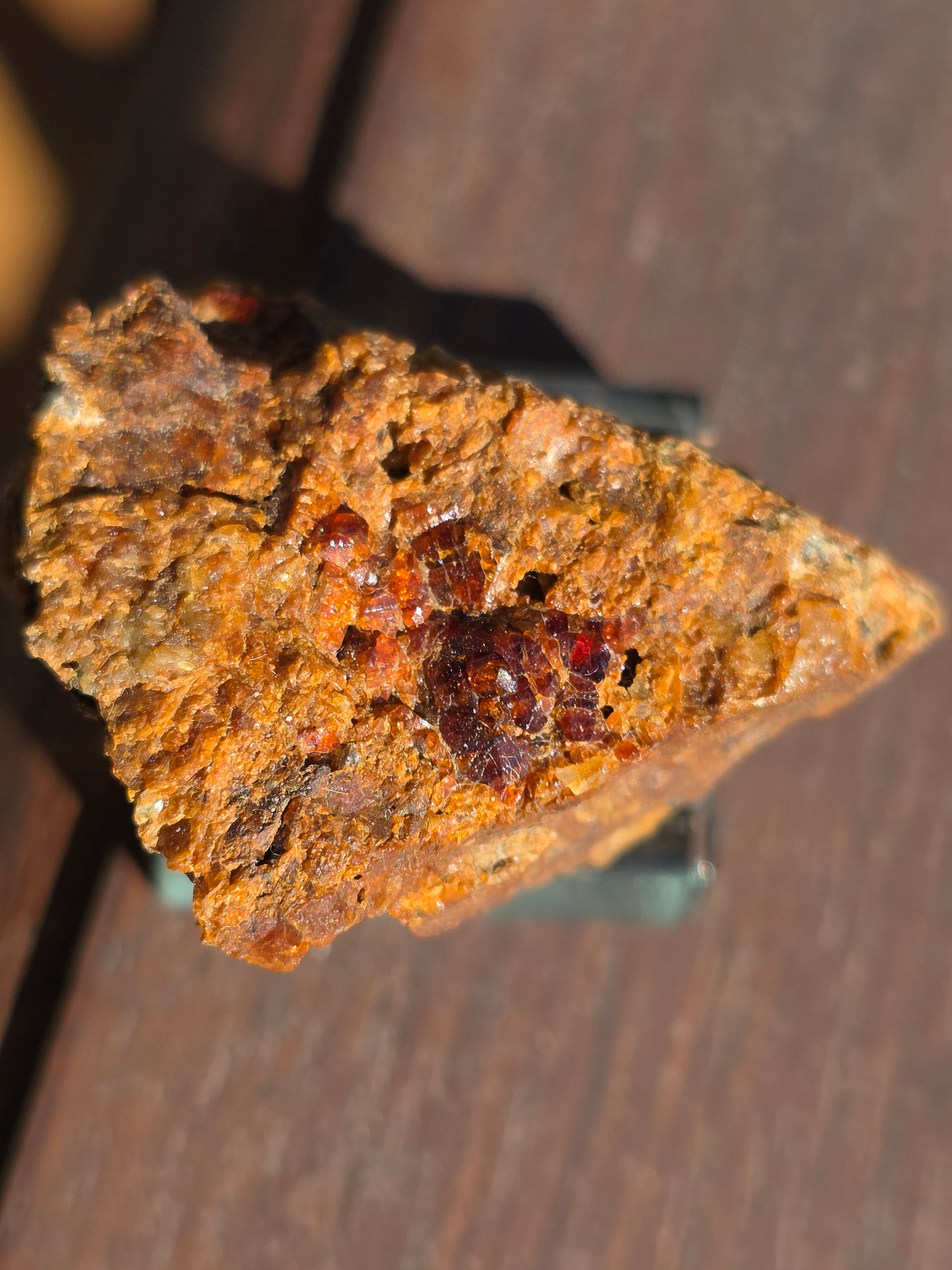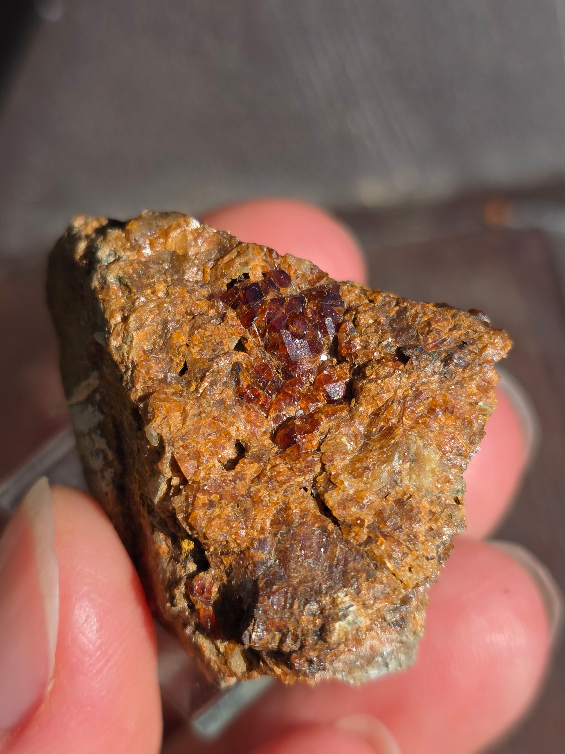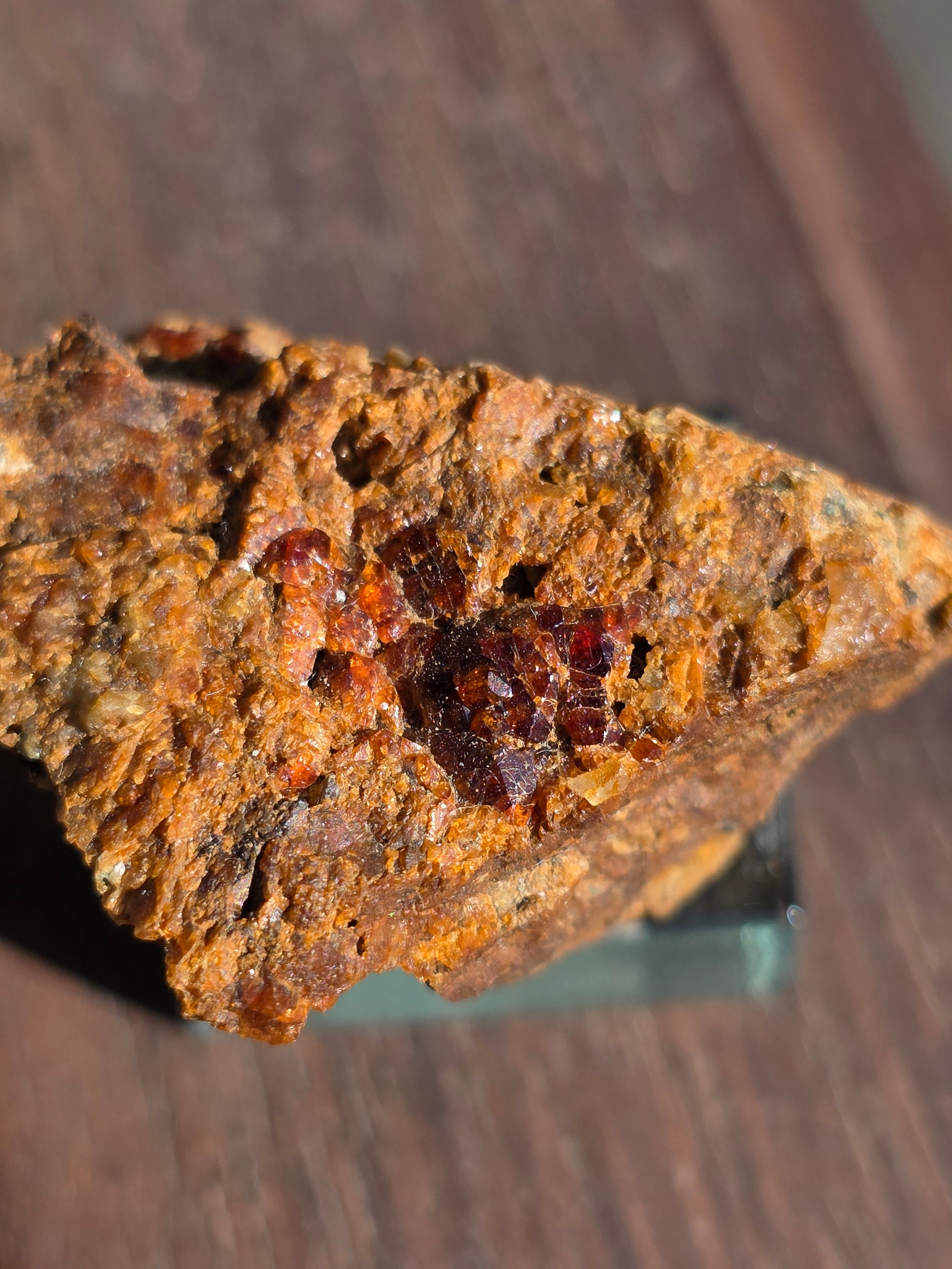Joli grenat sur gangue de Bigorre dans le 65 (Hautes-Pyrénées) sur son socle en verre.