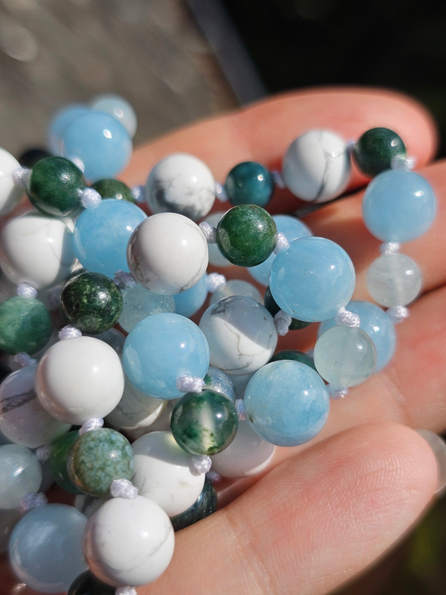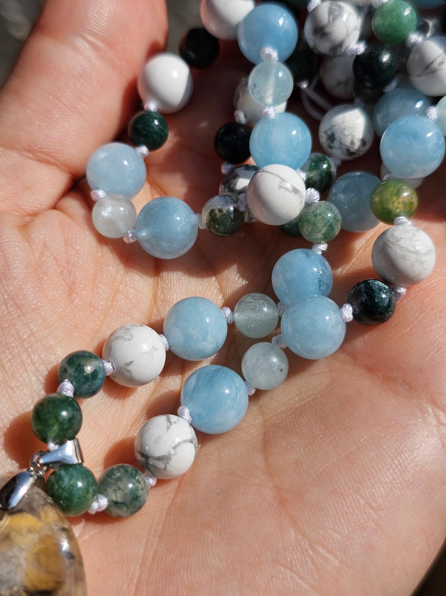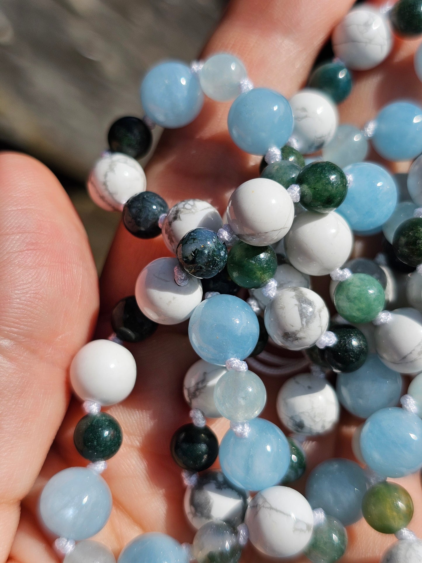 Mala de 108 perles en perles naturelles d'Aigue-marine (moins bleue que sur les photos), Howlite blanche et Agate mousse. Chaque perle est séparée par un nœud.