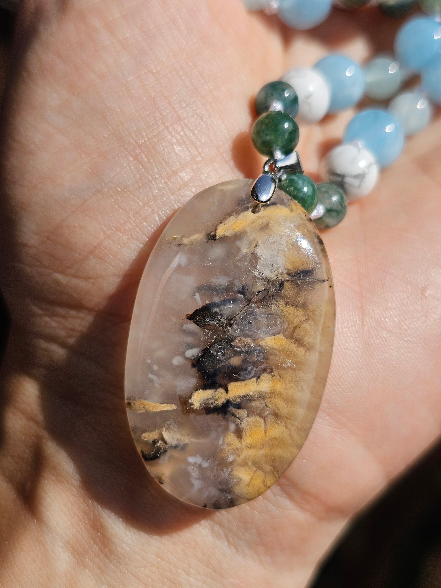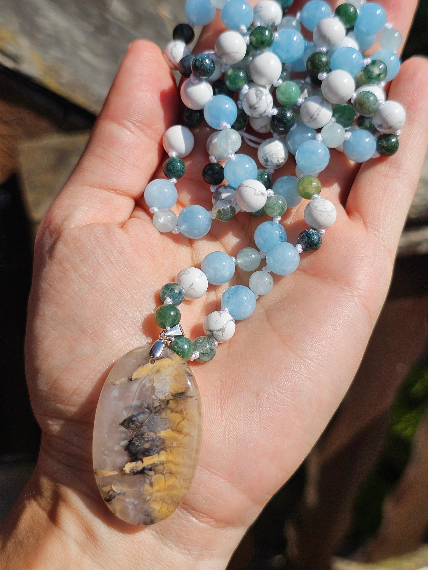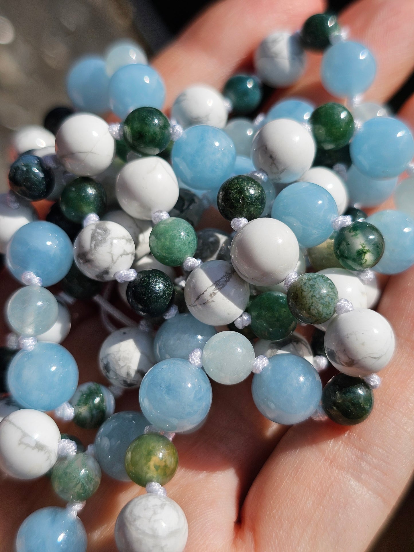 Mala de 108 perles en perles naturelles d'Aigue-marine (moins bleue que sur les photos), Howlite blanche et Agate mousse. Chaque perle est séparée par un nœud.