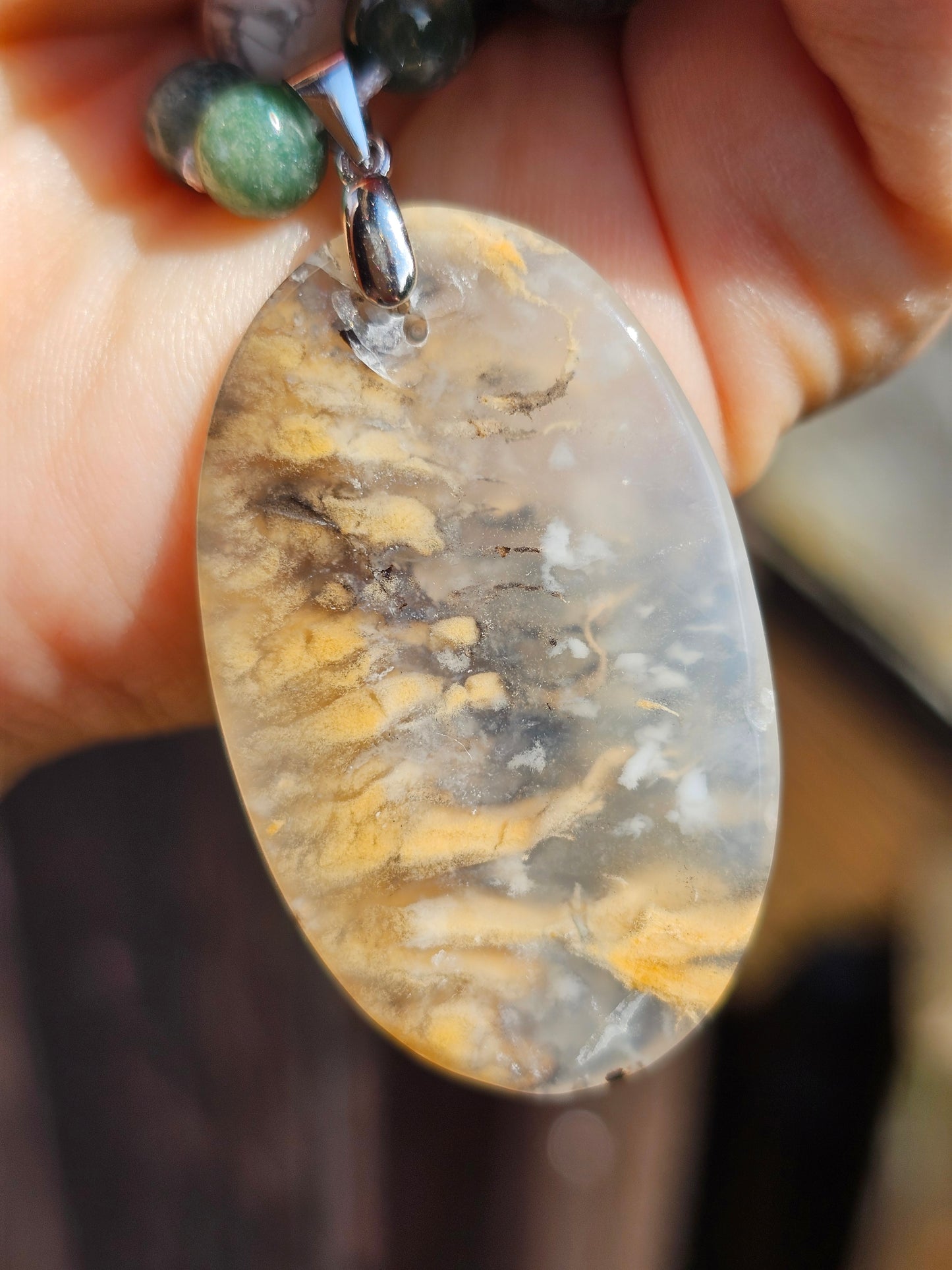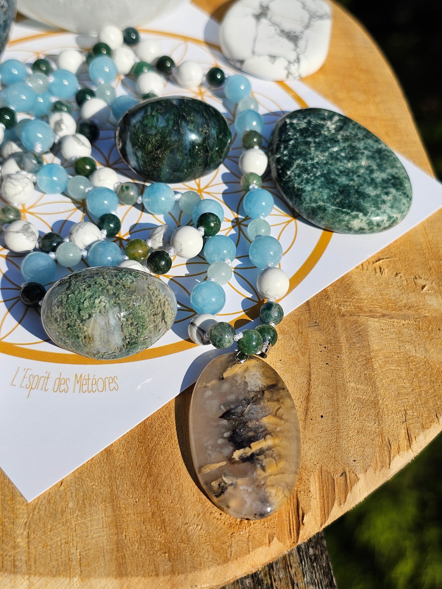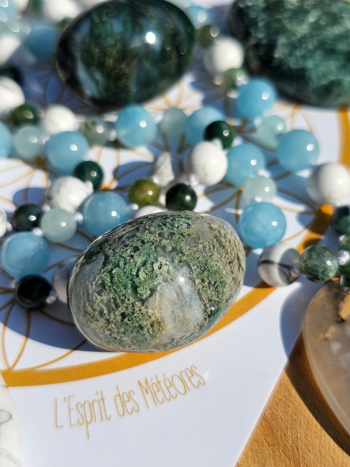 Agate mousse : ouverture d'esprit et du cœur avec un sentiment de sécurité, confiance en soi, communication avec les autres, joie de vivre, légèreté, positivité, relativiser, connexions aux énergies de la Nature, instant présent, retrouver sa nature profonde.