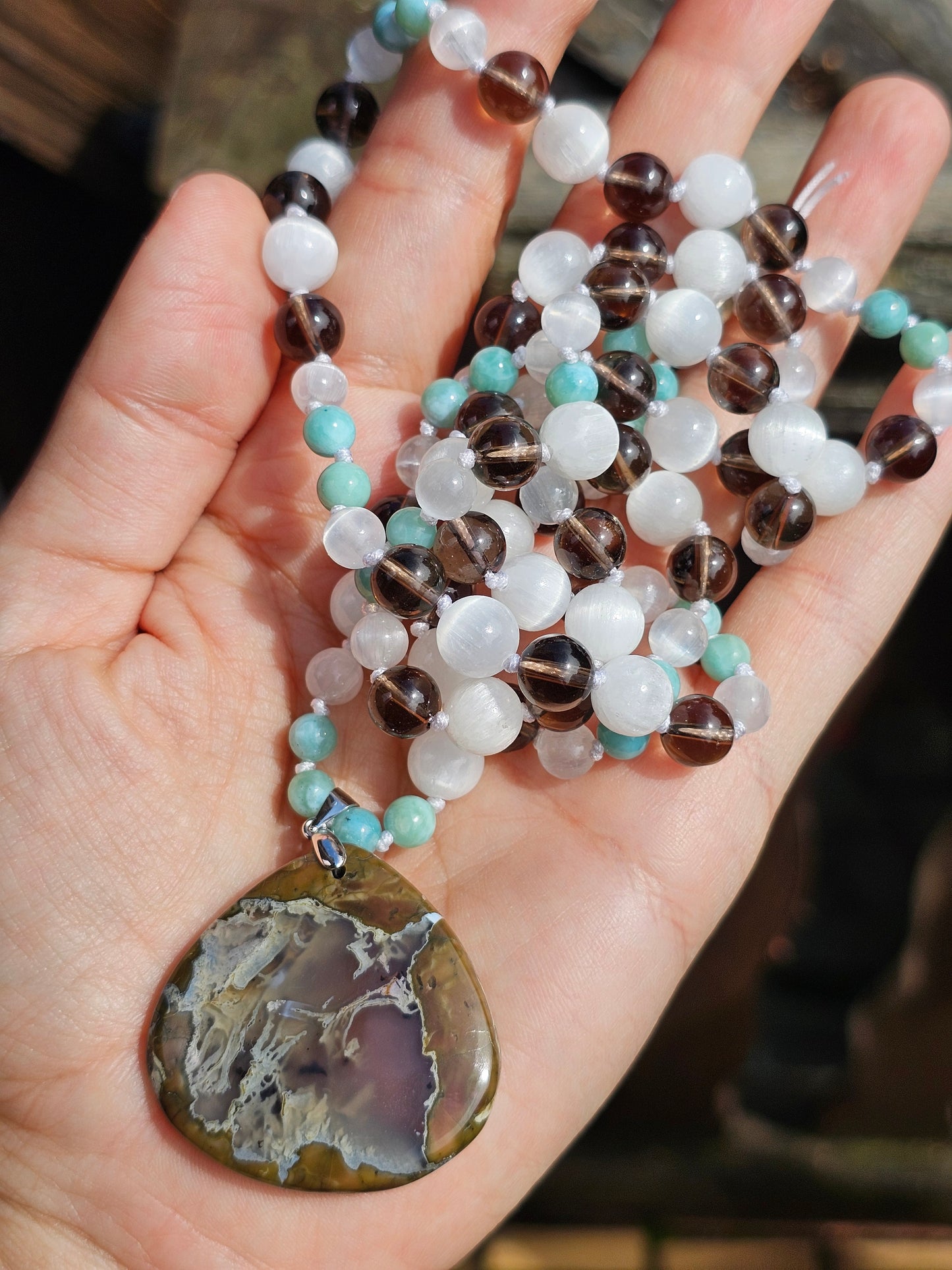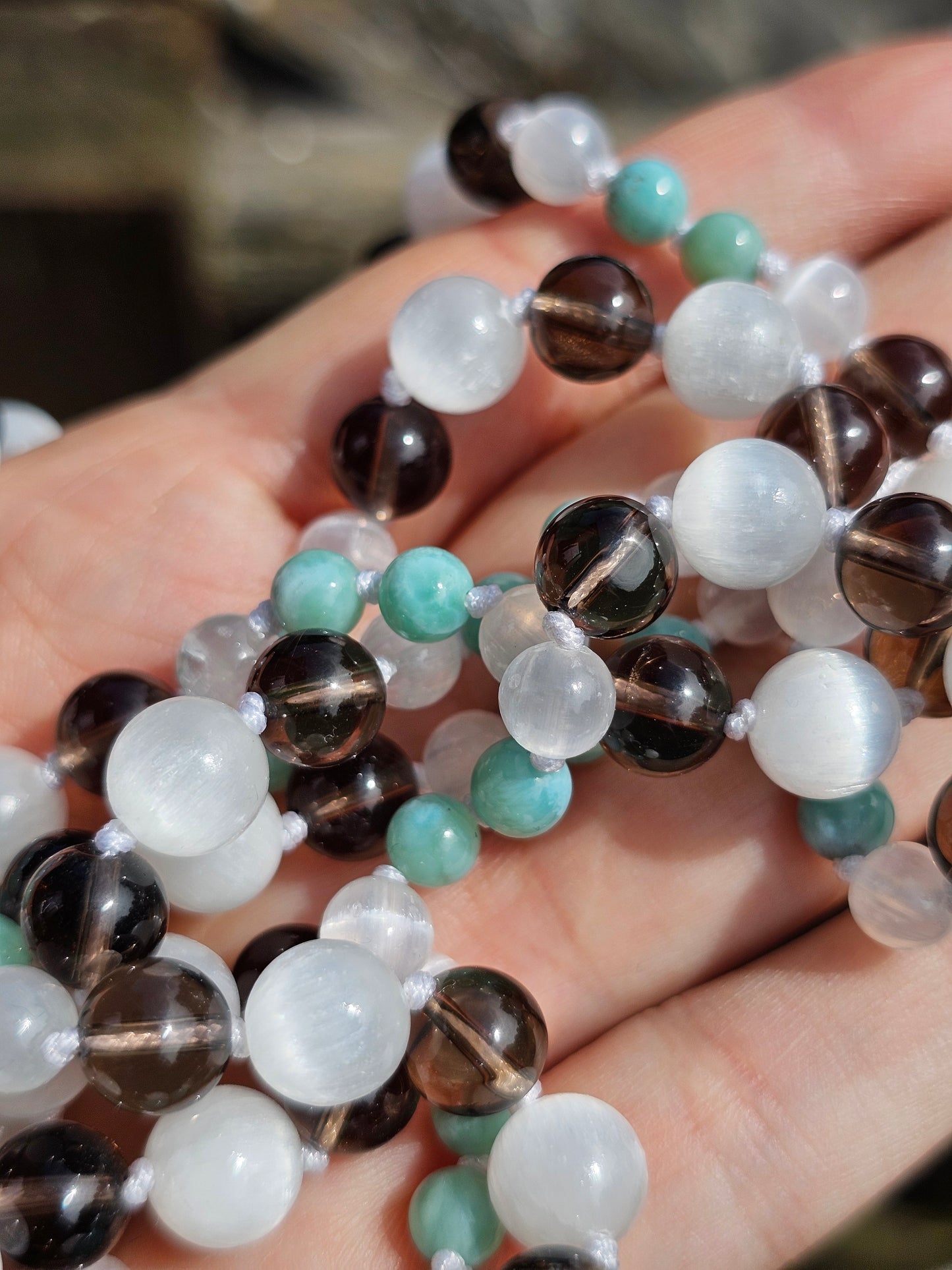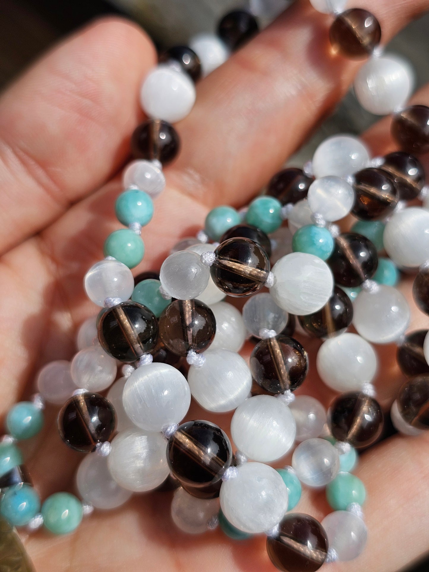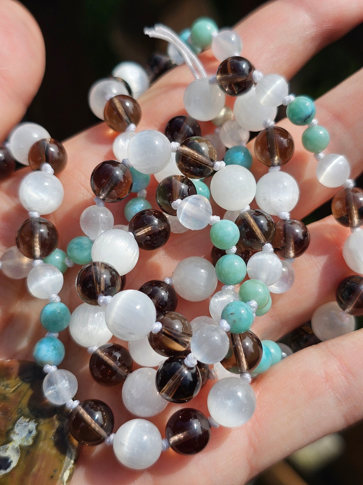 Mala de 108 perles en perles naturelles de Larimar, Sélénite, quartz fumé et argent 925. Chaque perle est séparée par un nœud.
