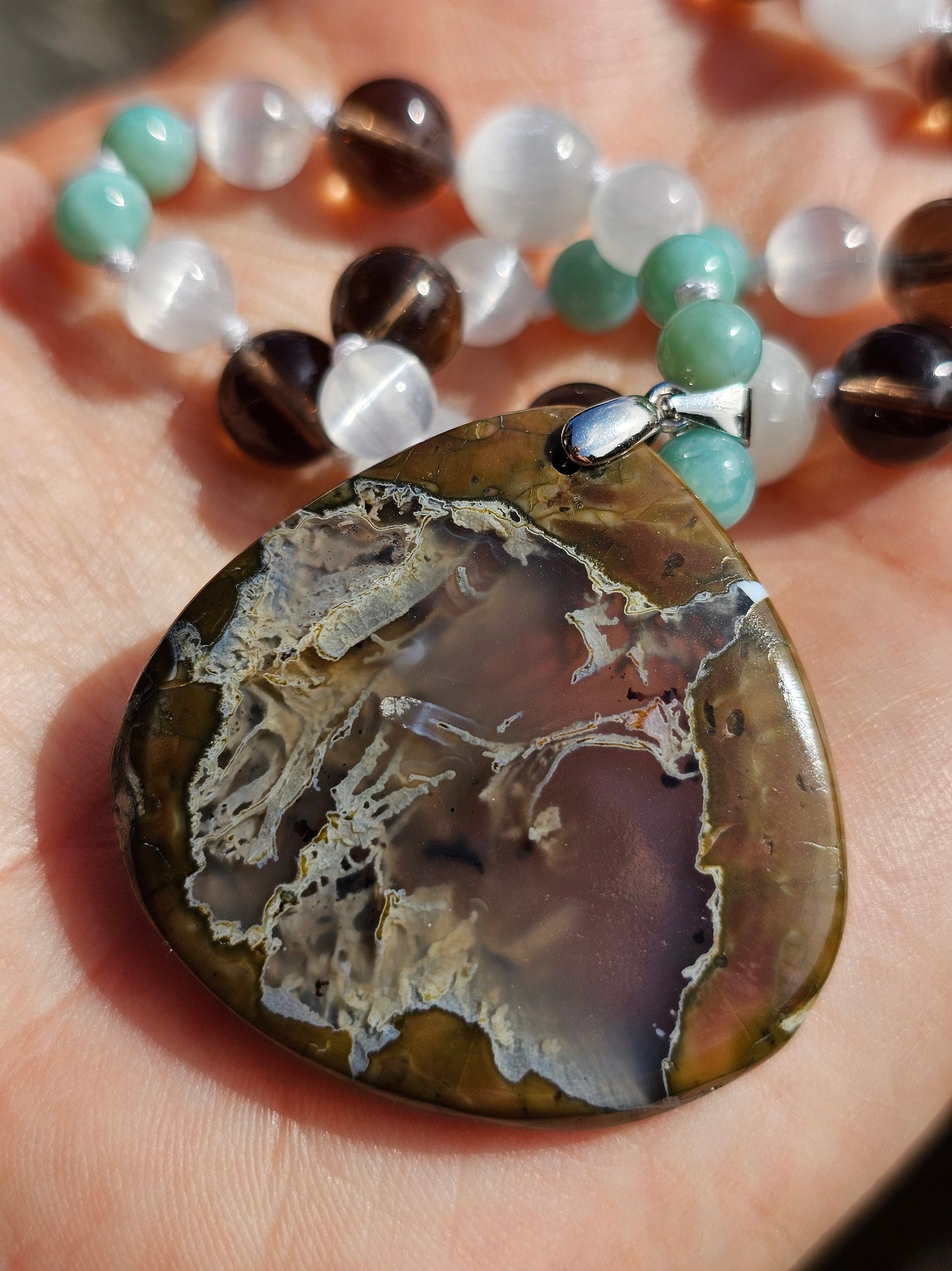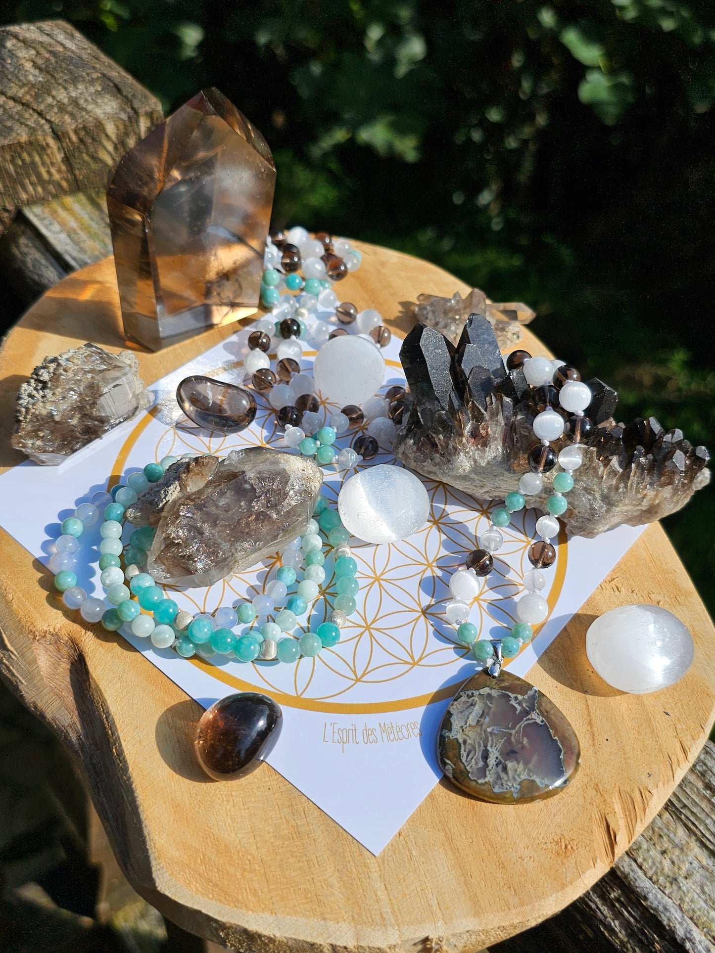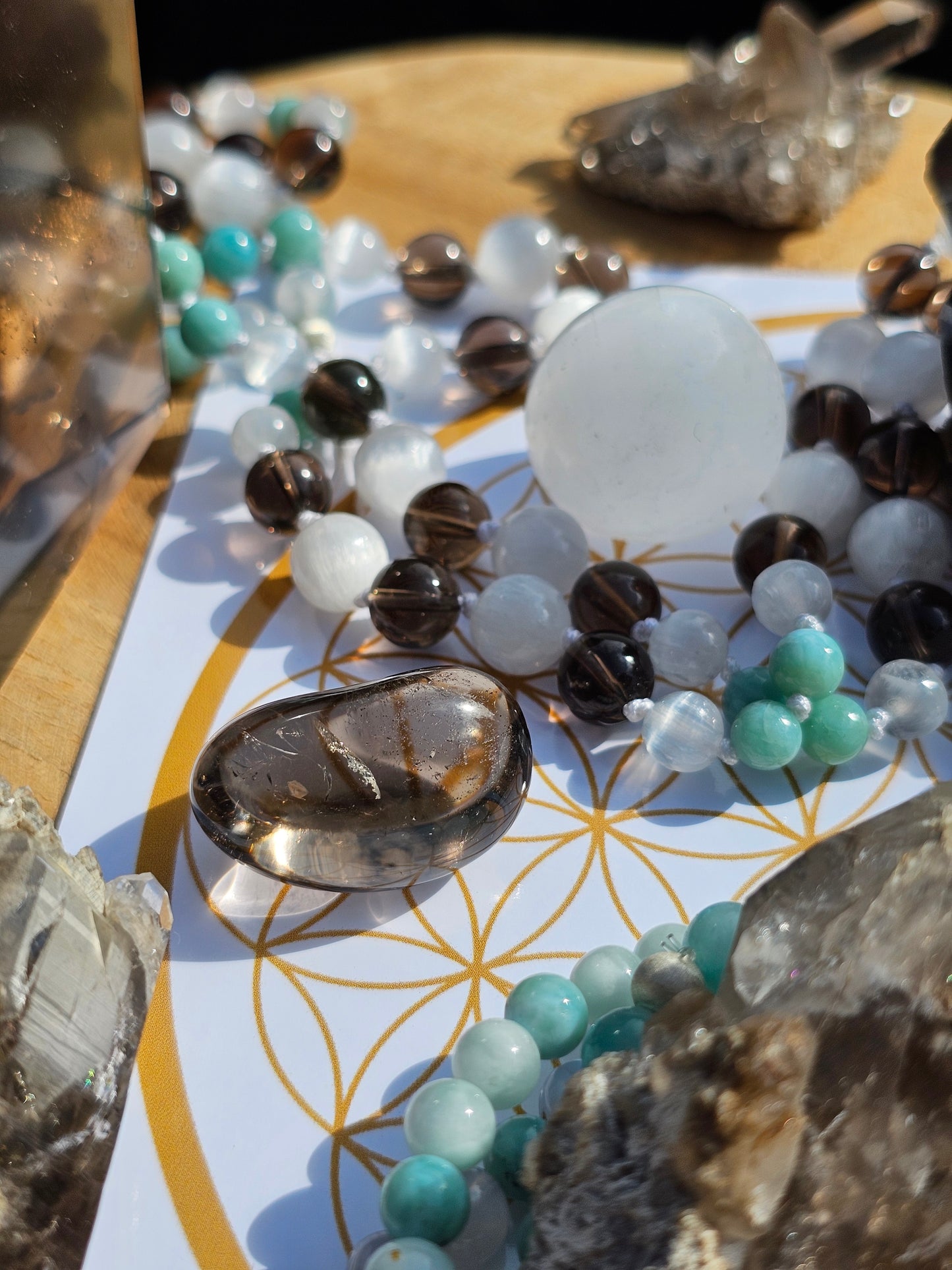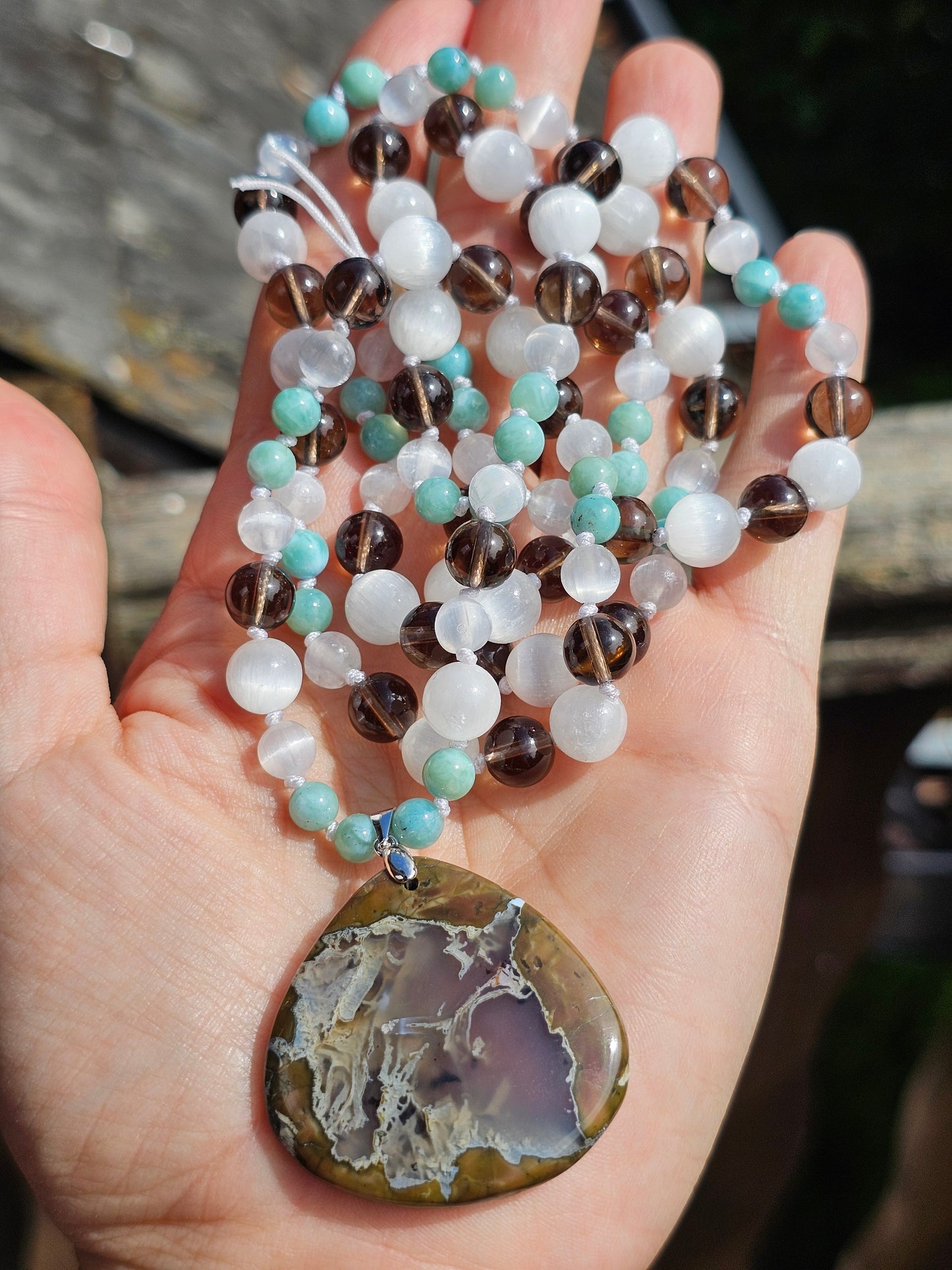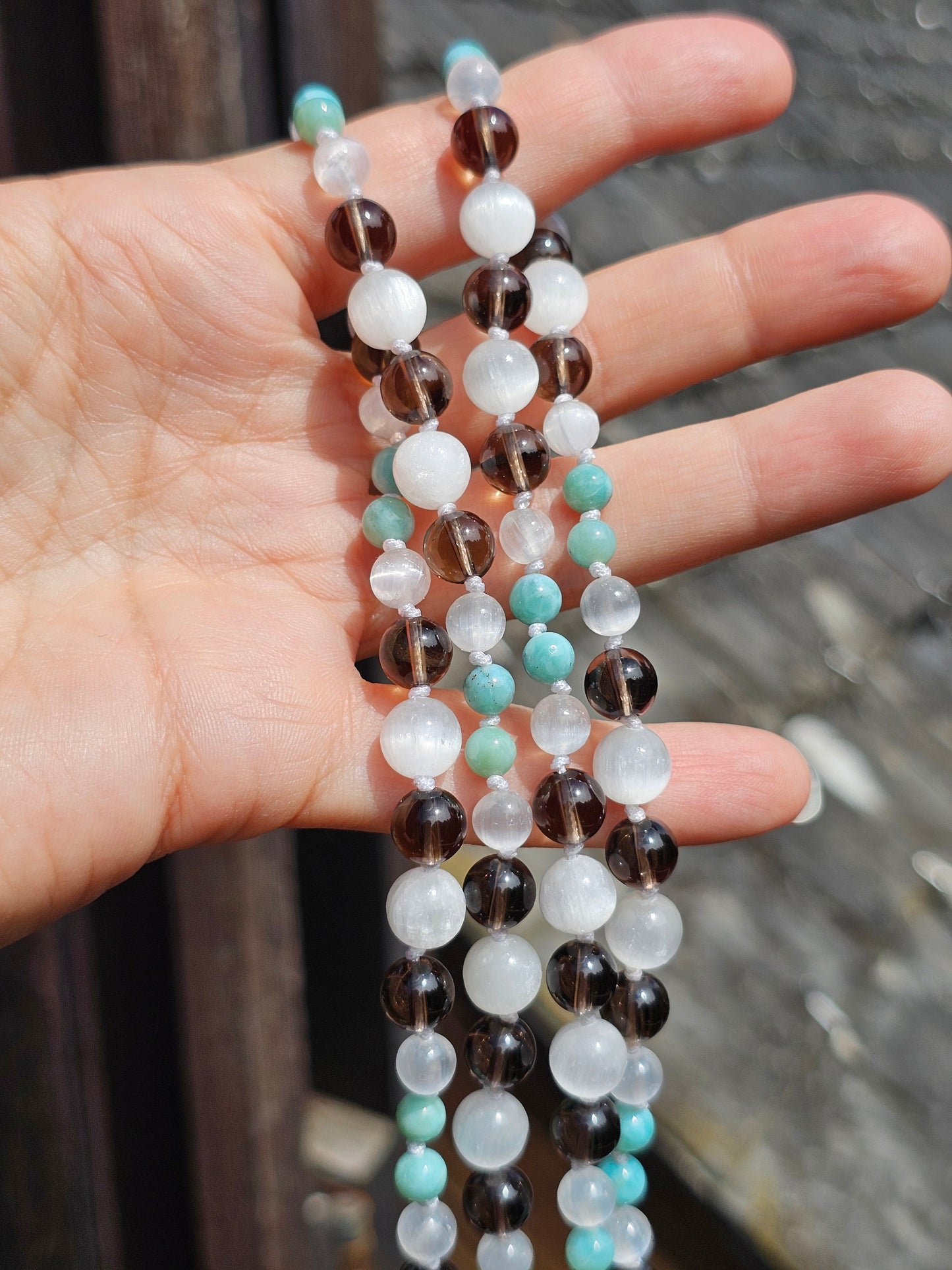 Mala de 108 perles en perles naturelles de Larimar, Sélénite, quartz fumé et argent 925. Chaque perle est séparée par un nœud.