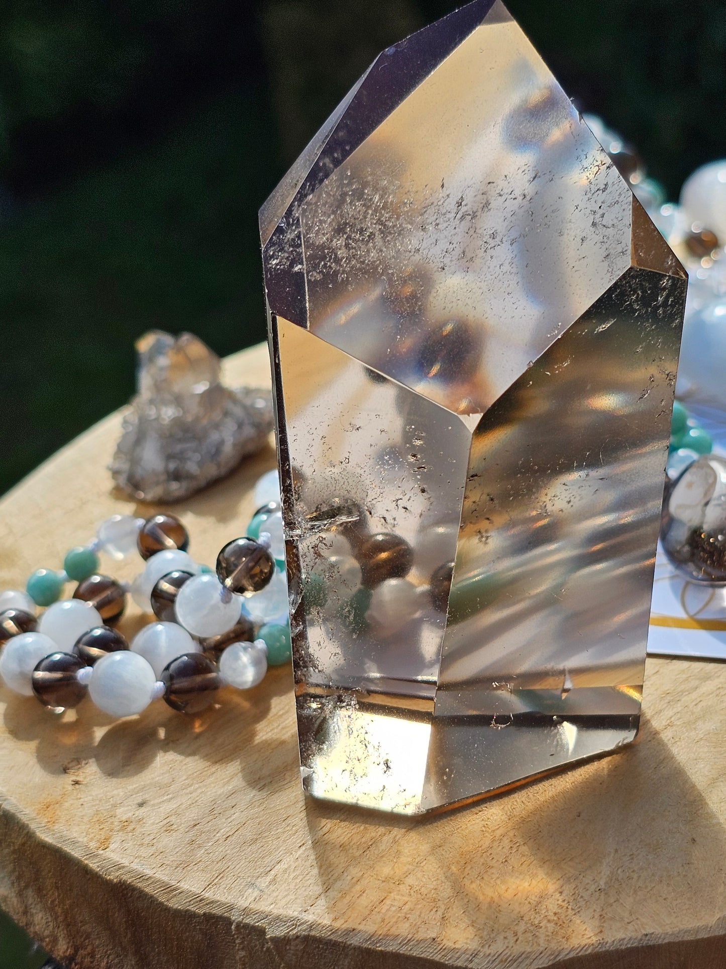 Quartz fumé : ancrage, se recentrer, combat les addictions, les peurs irrationnelles, les angoisses, les contradictions intérieures, stabilise l'humeur et les émotions, amène de la lucidité, incite à la réflexion, à ralentir.