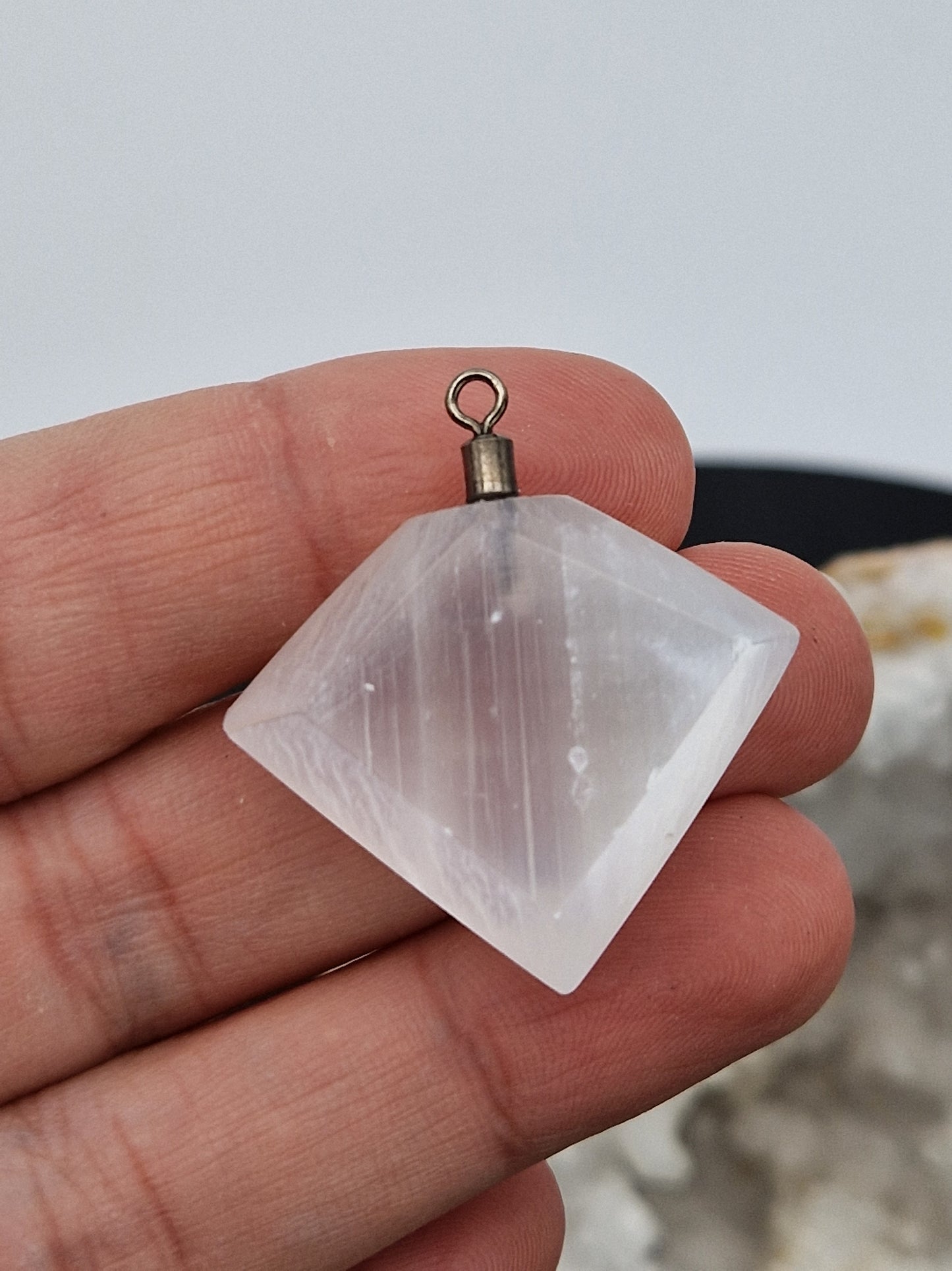 Pendentif diamant en Sélénite (gyspe fibreux) du Maroc livré dans un petit pochon cadeau.