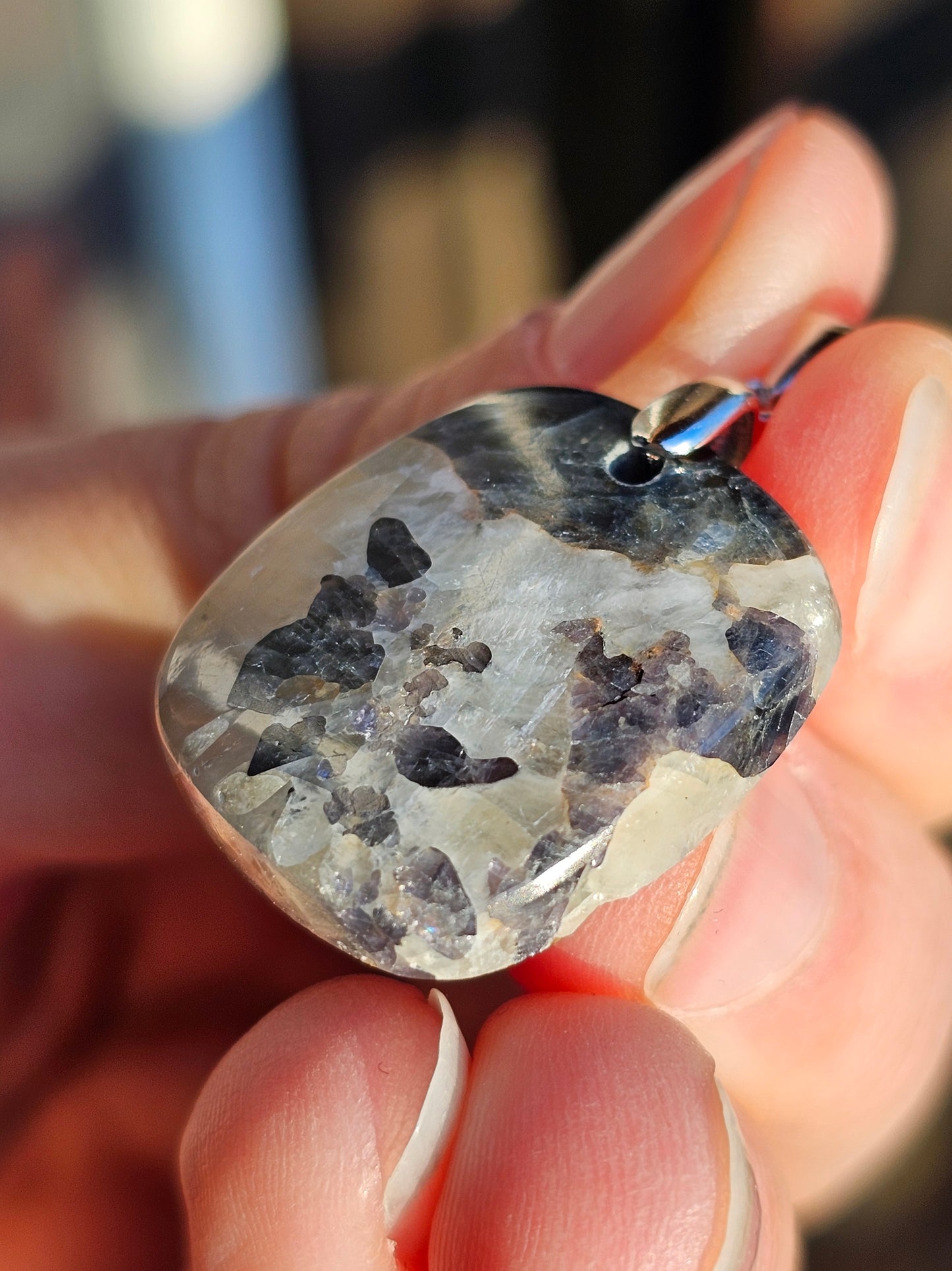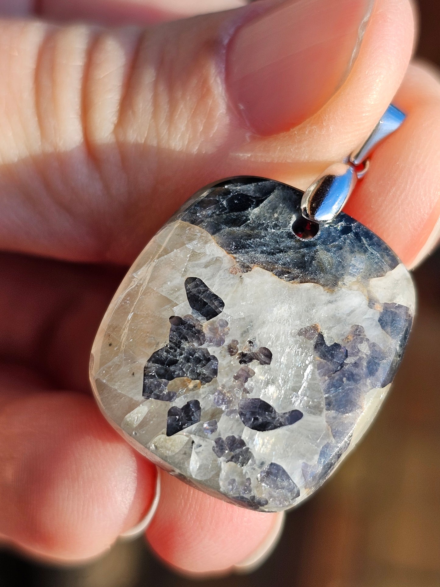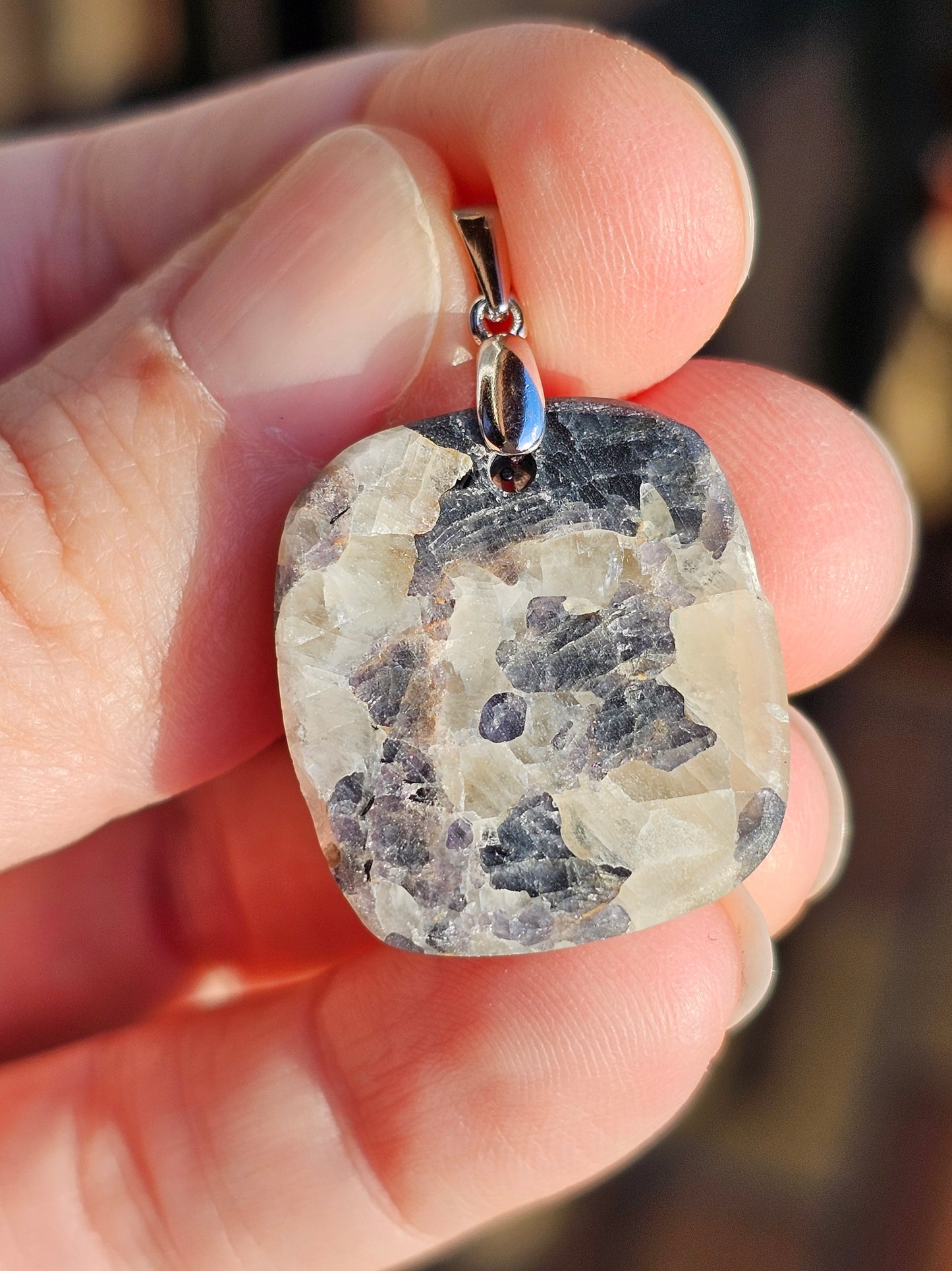 Magnifique pendentif en Calcite avec inclusions de spinelle violette monté sur une bélière en argent 925.