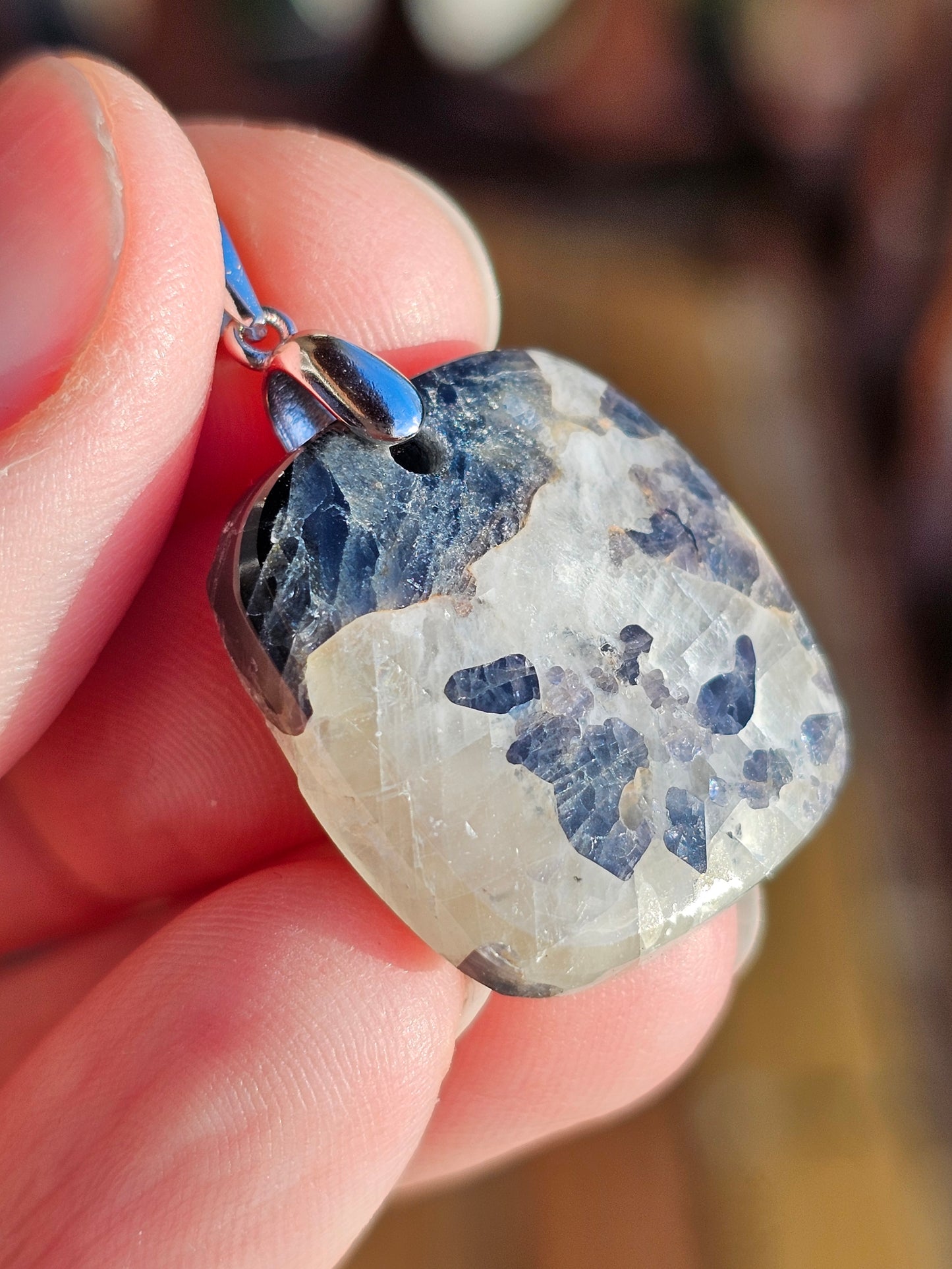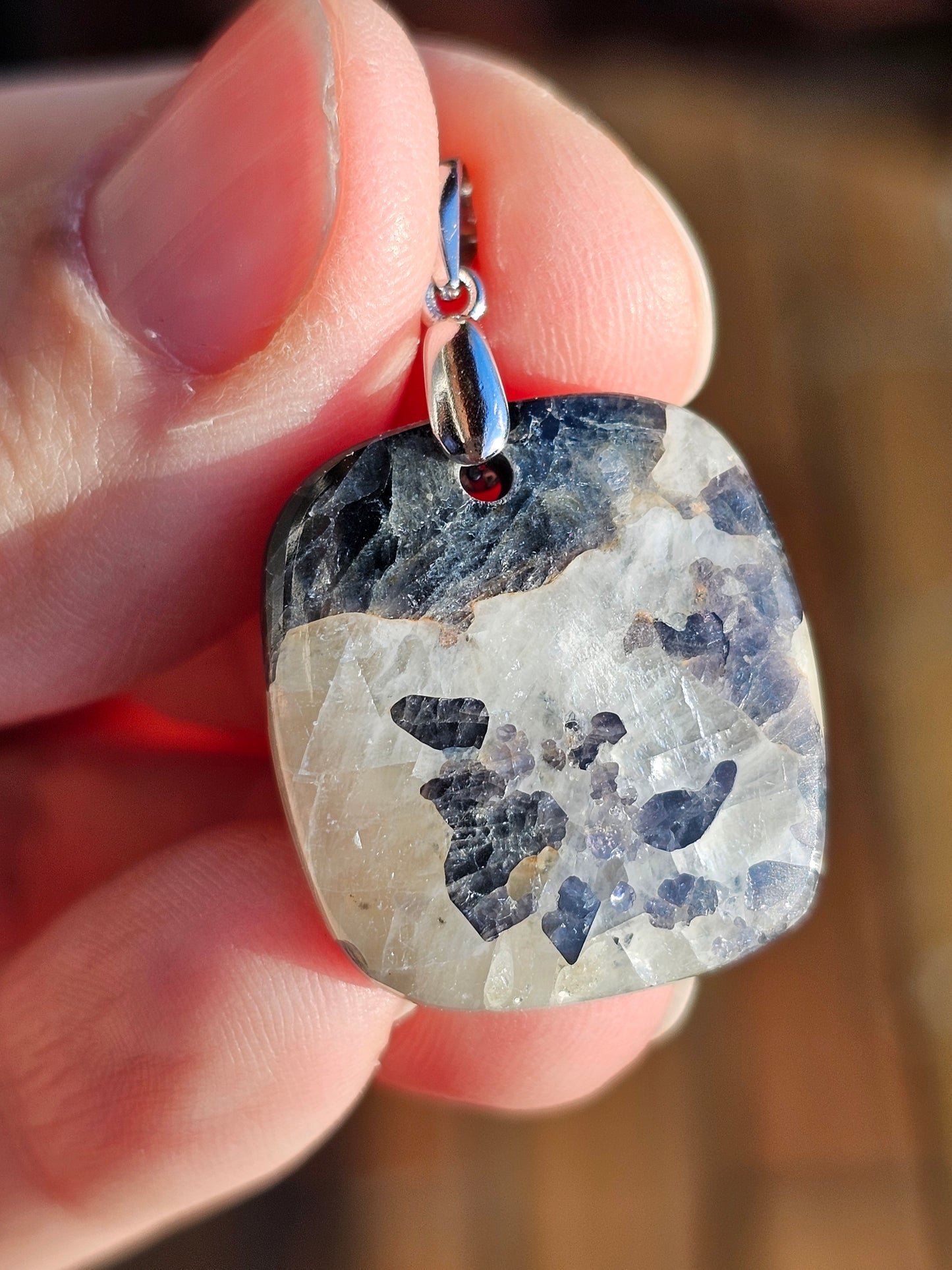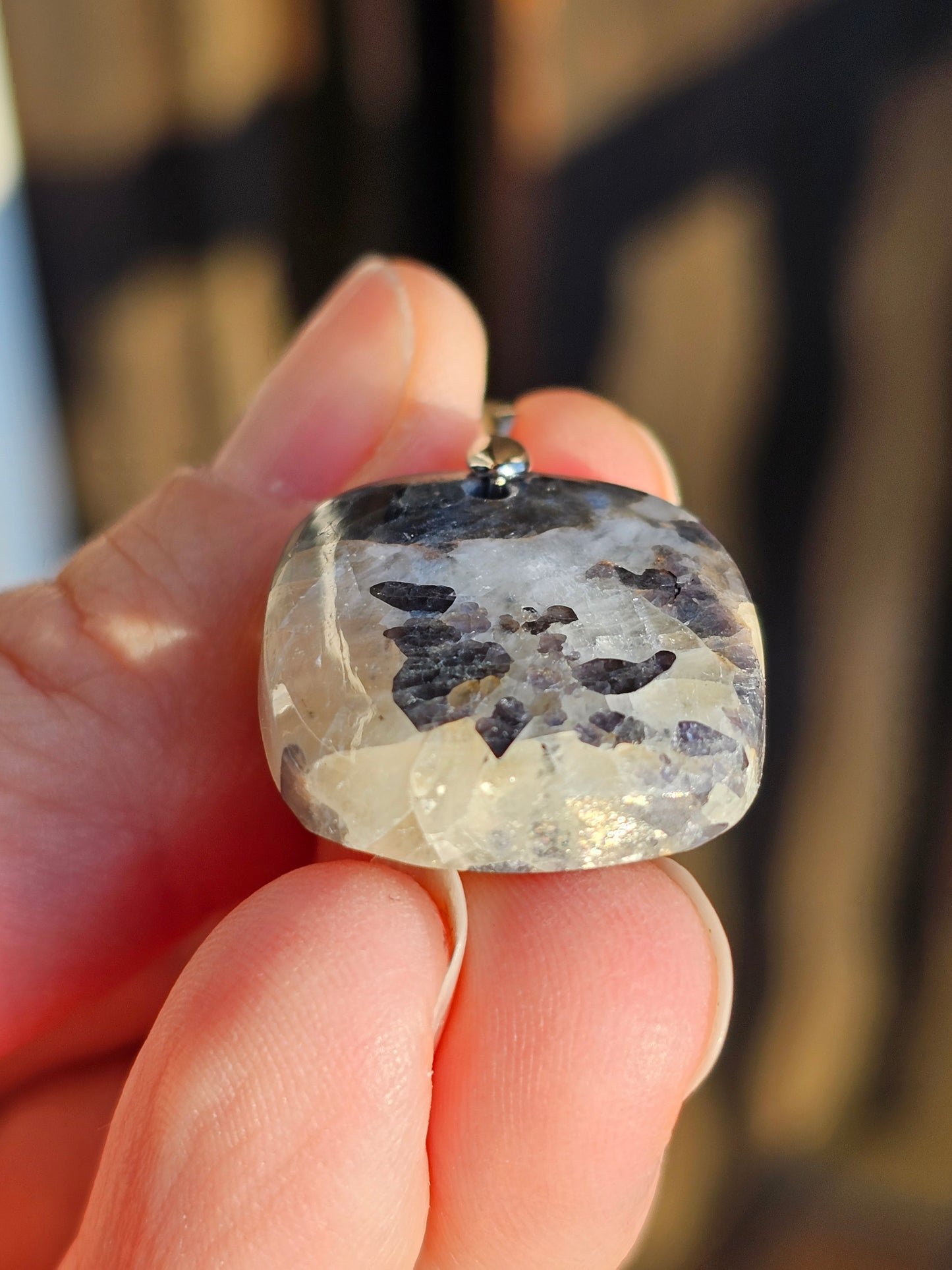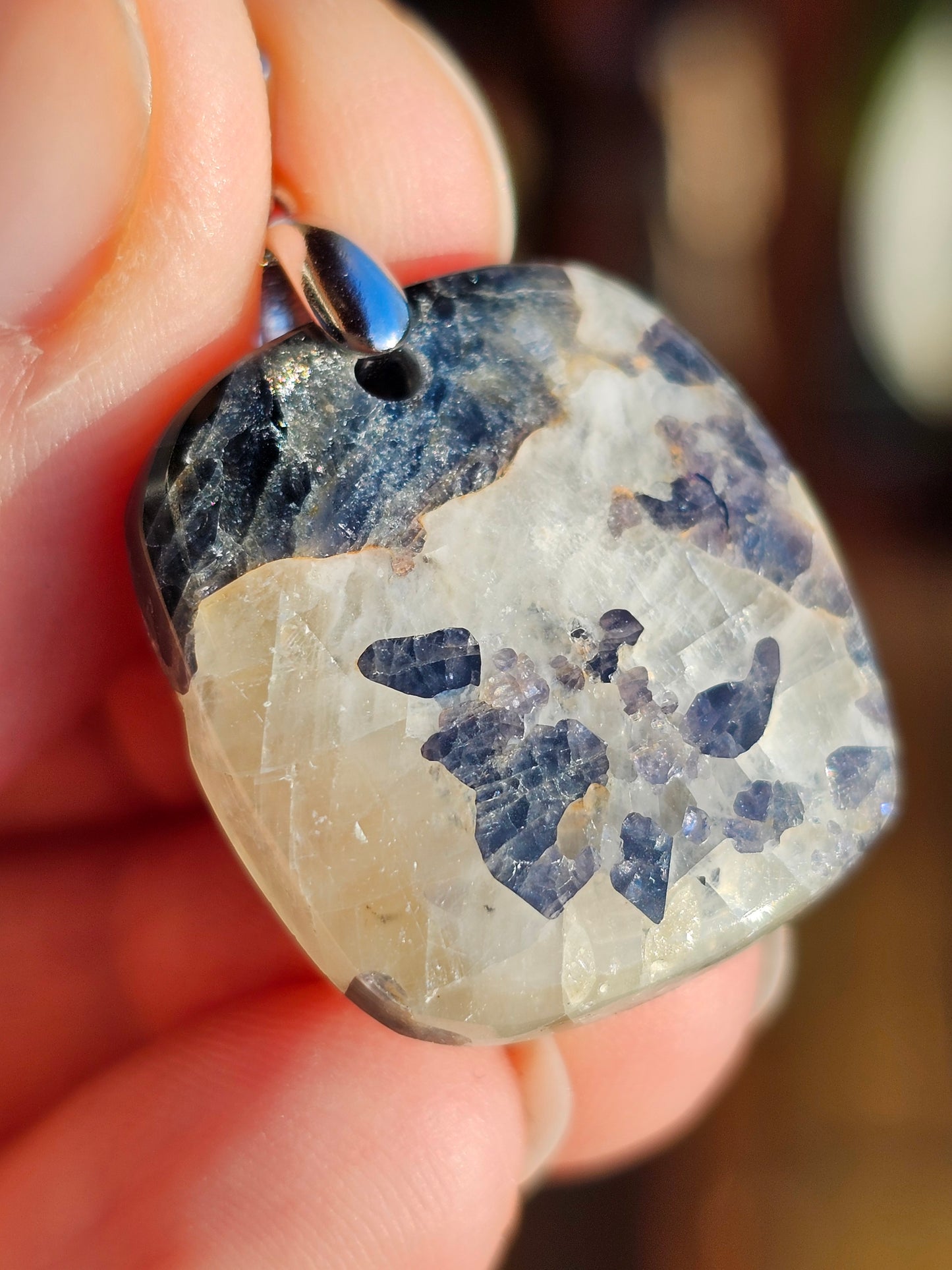 Magnifique pendentif en Calcite avec inclusions de spinelle violette monté sur une bélière en argent 925.