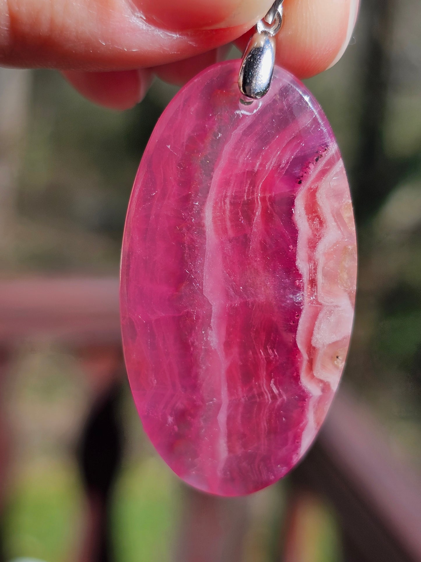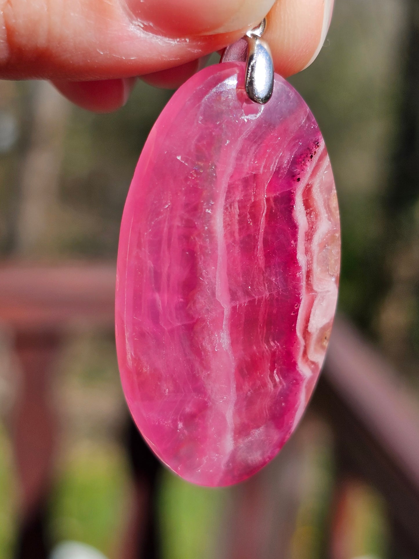 Superbe pendentif en cobaltocalcite de qualité AAA, monté sur une bélière en argent 925. La Cobaltocalcite est également appelée Calcite cobaltifère. C'est sa teneur en cobalt qui lui confère sa couleur rose plus ou moins prononcée.