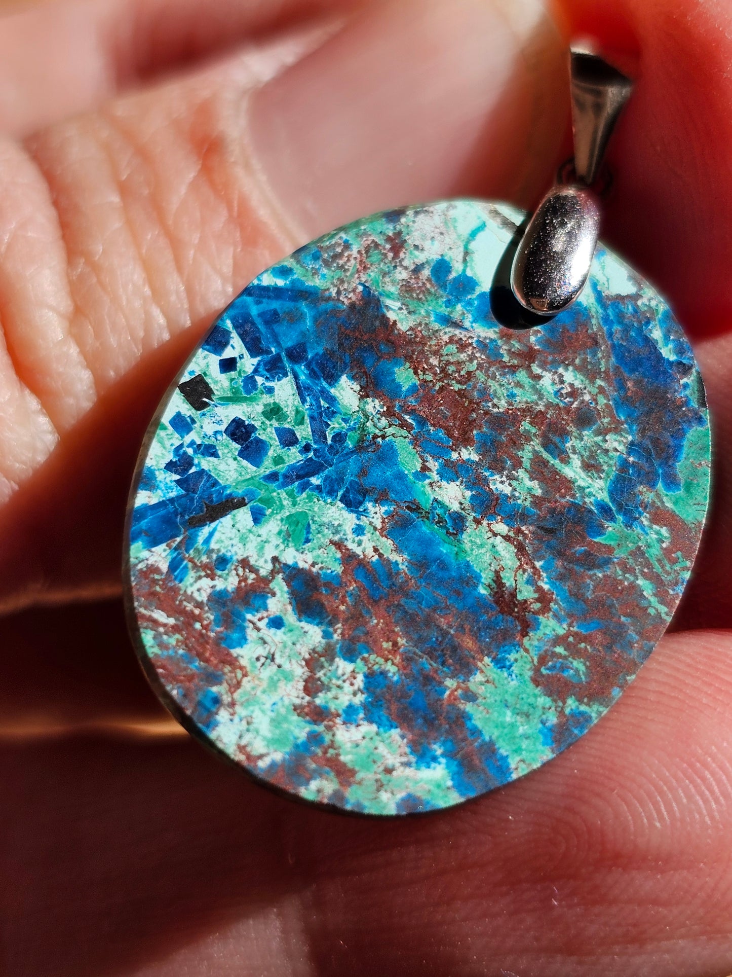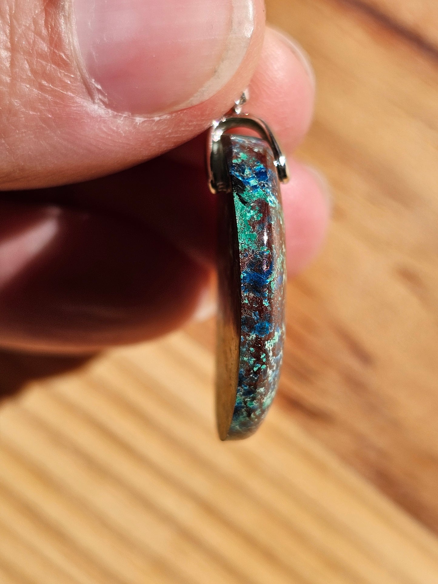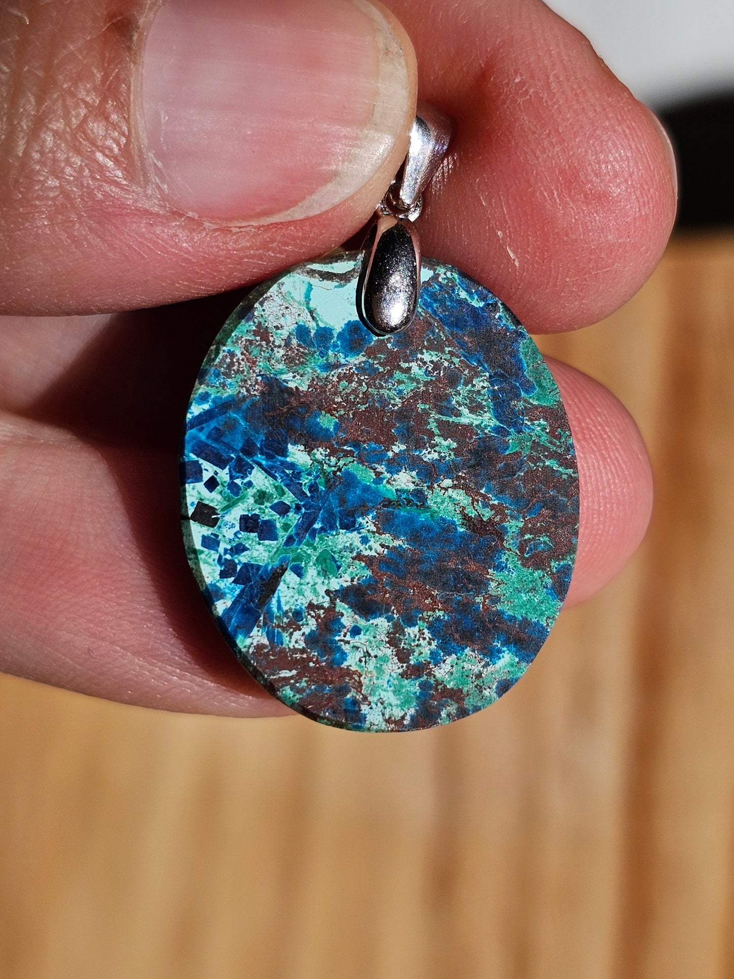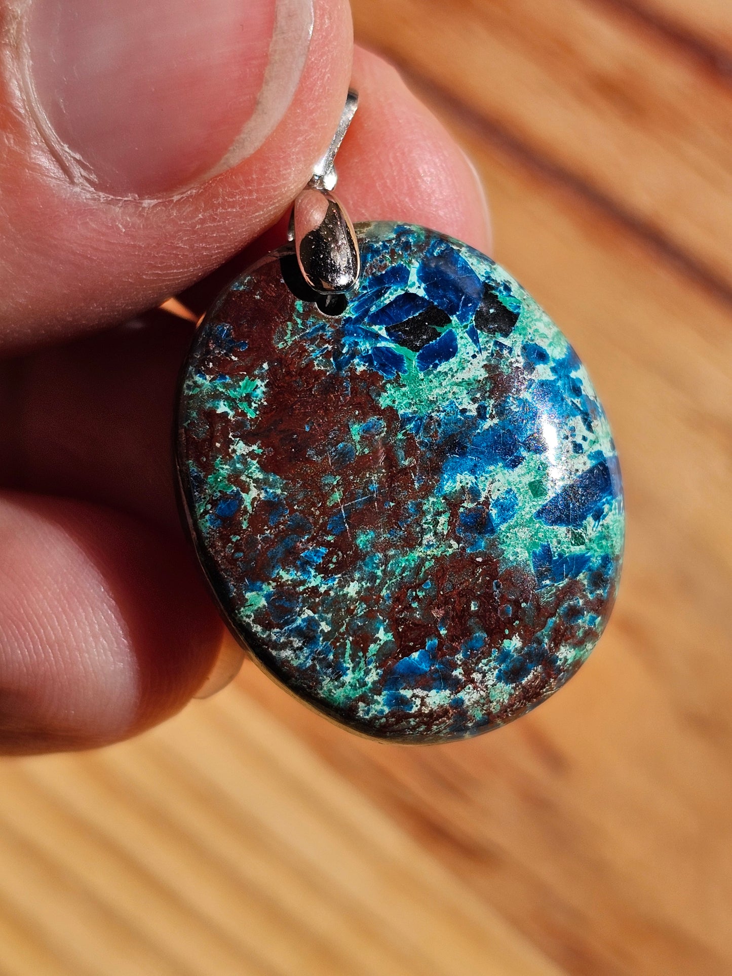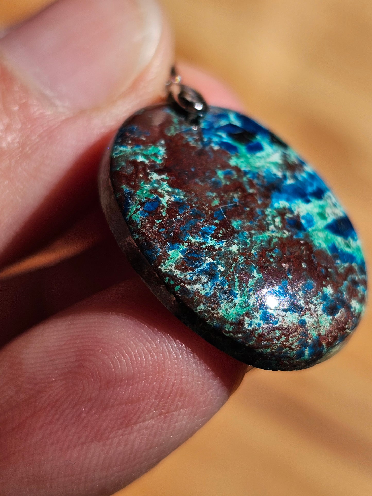 Joli pendentif en Malachite, Chrysocolle et Cuprite de qualité AAA monté sur une bélière en argent 925.