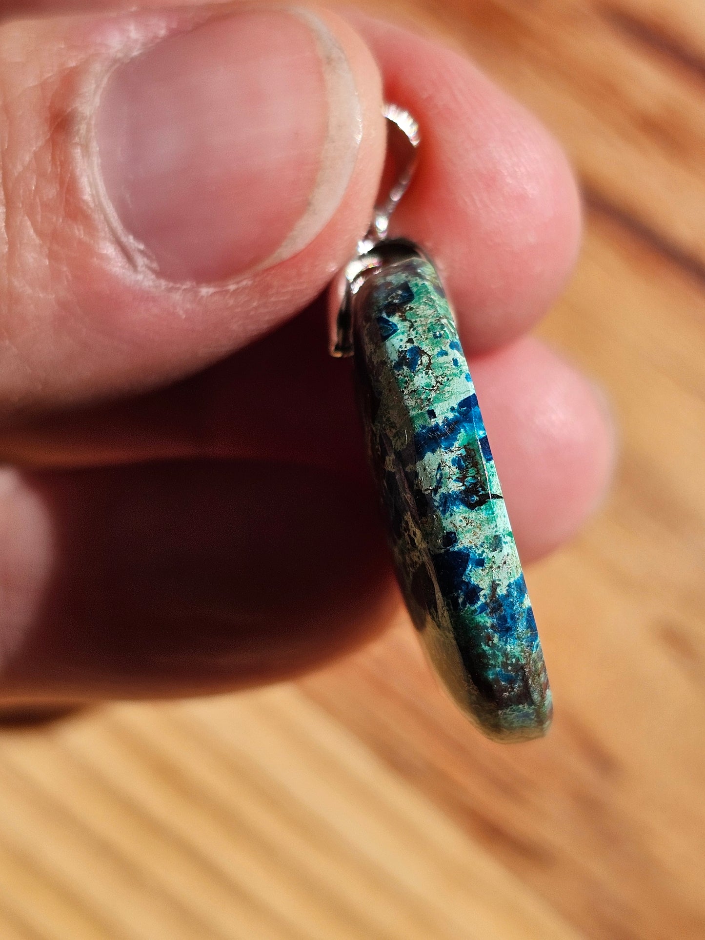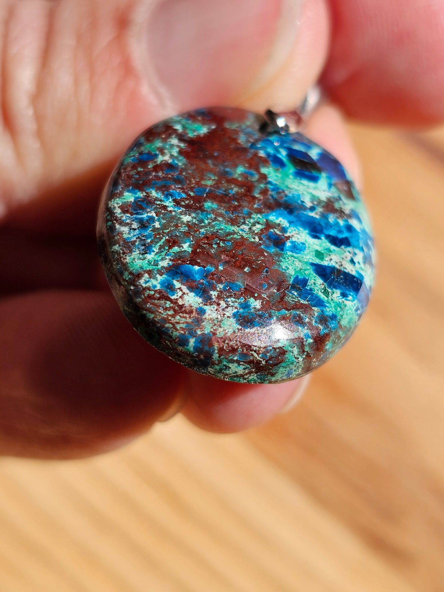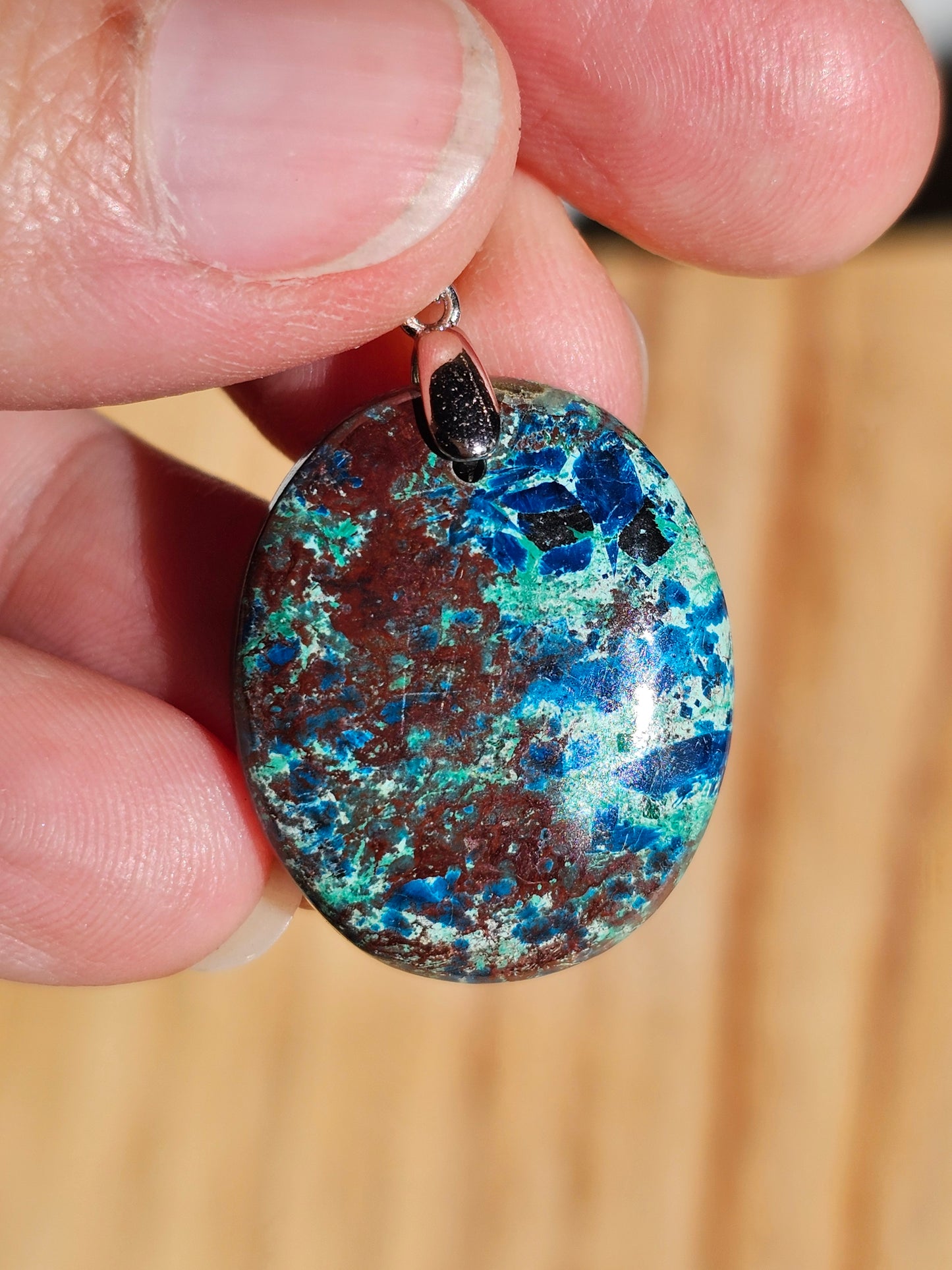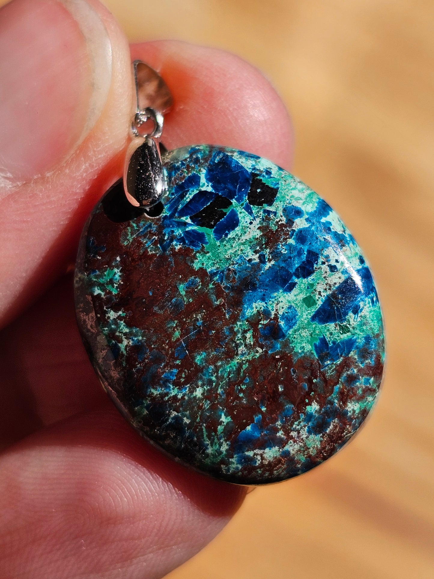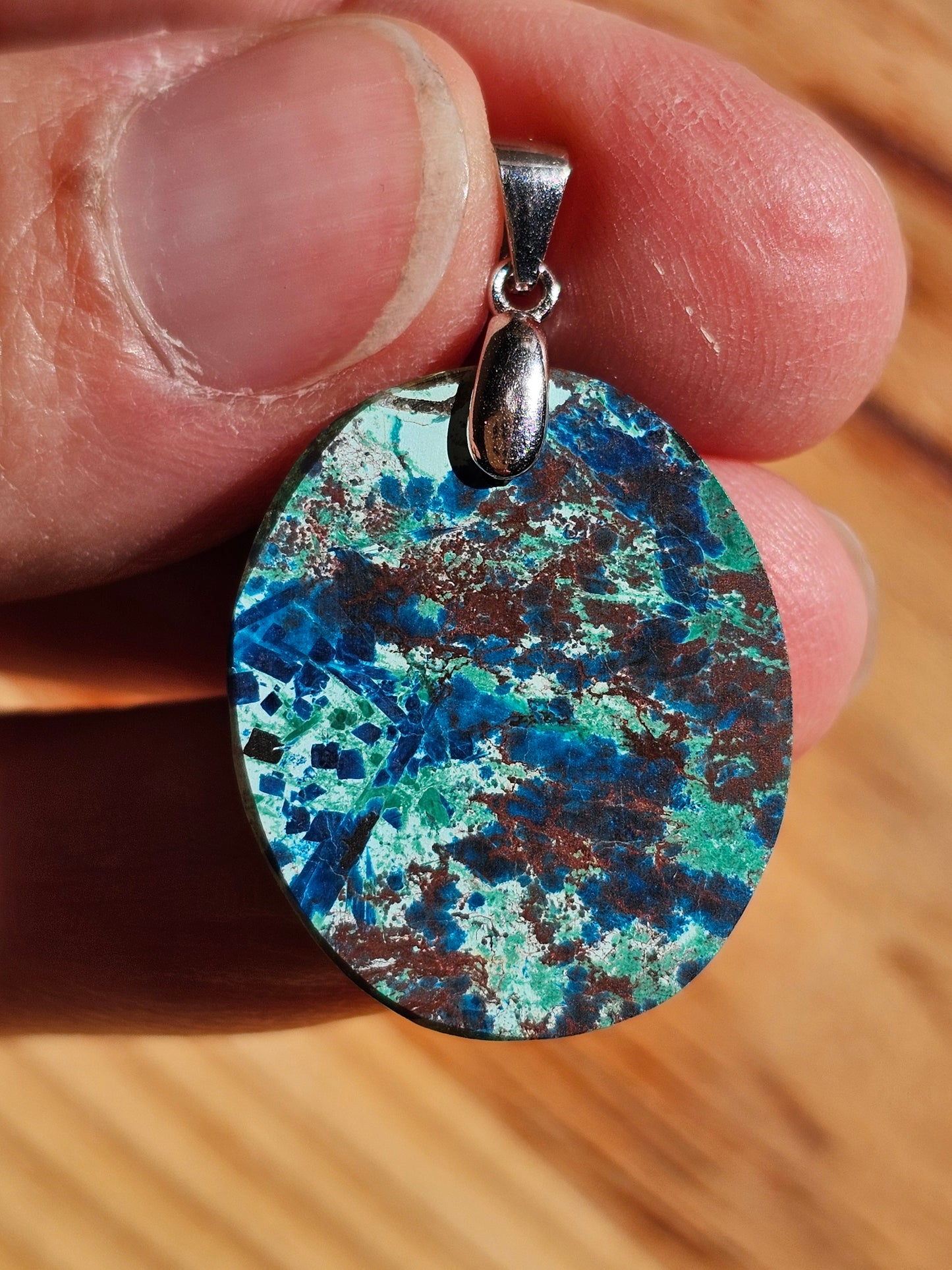 Joli pendentif en Malachite, Chrysocolle et Cuprite de qualité AAA monté sur une bélière en argent 925.