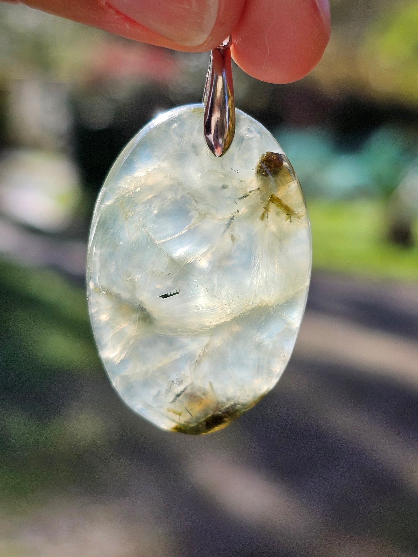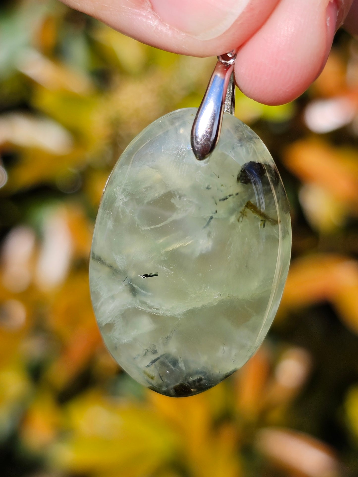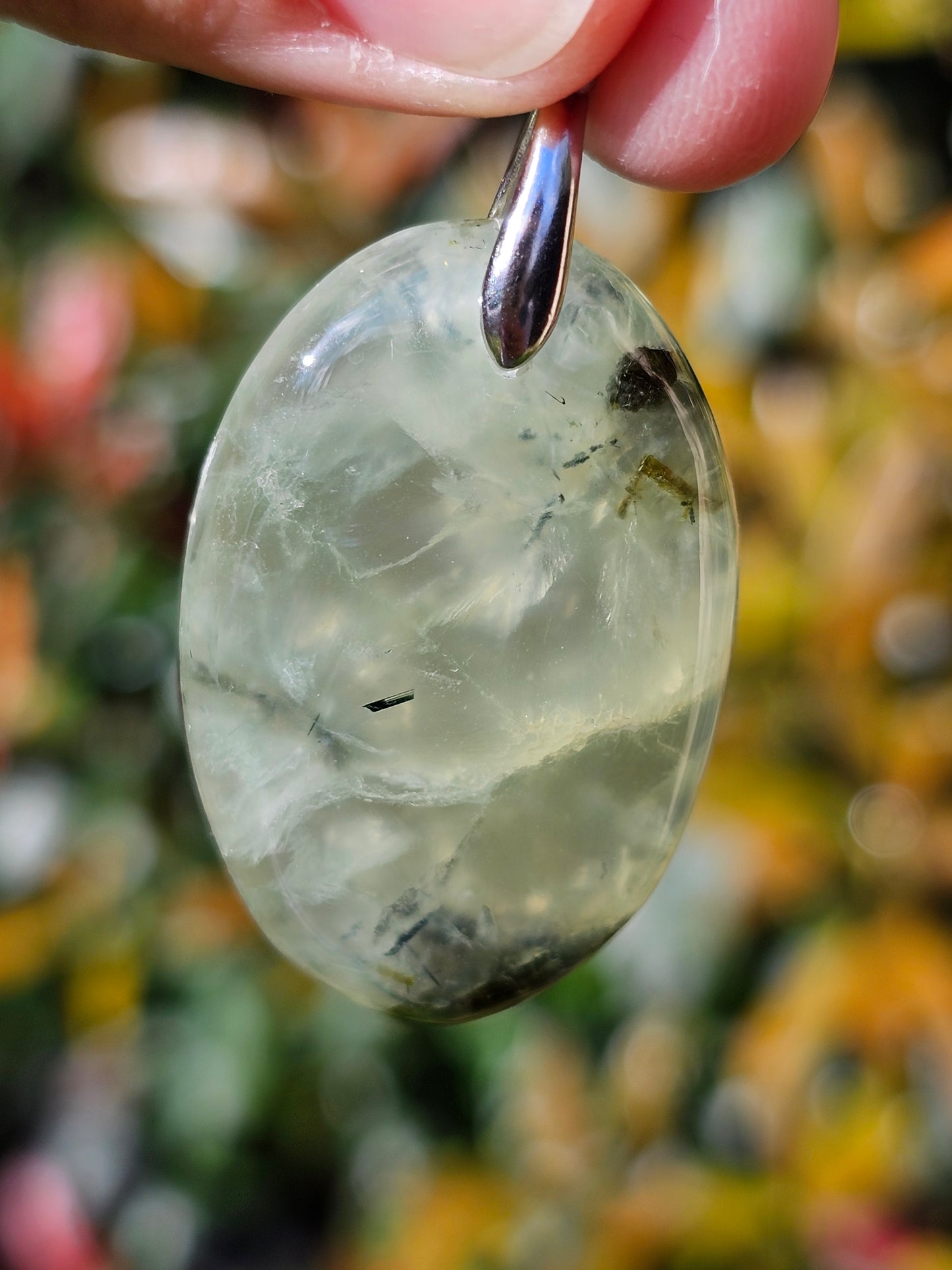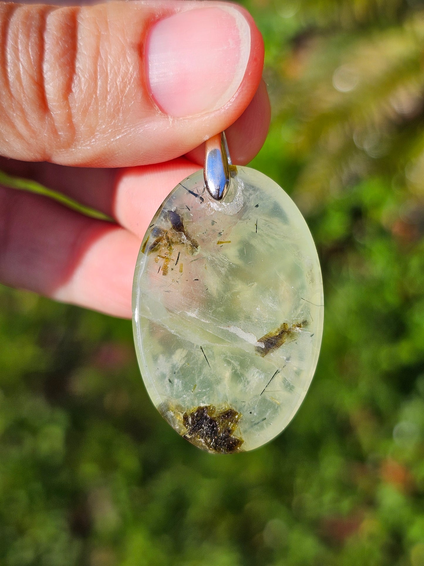 Joli pendentif en Prehnite de Madagascar, monté sur une bélière en argent 925.