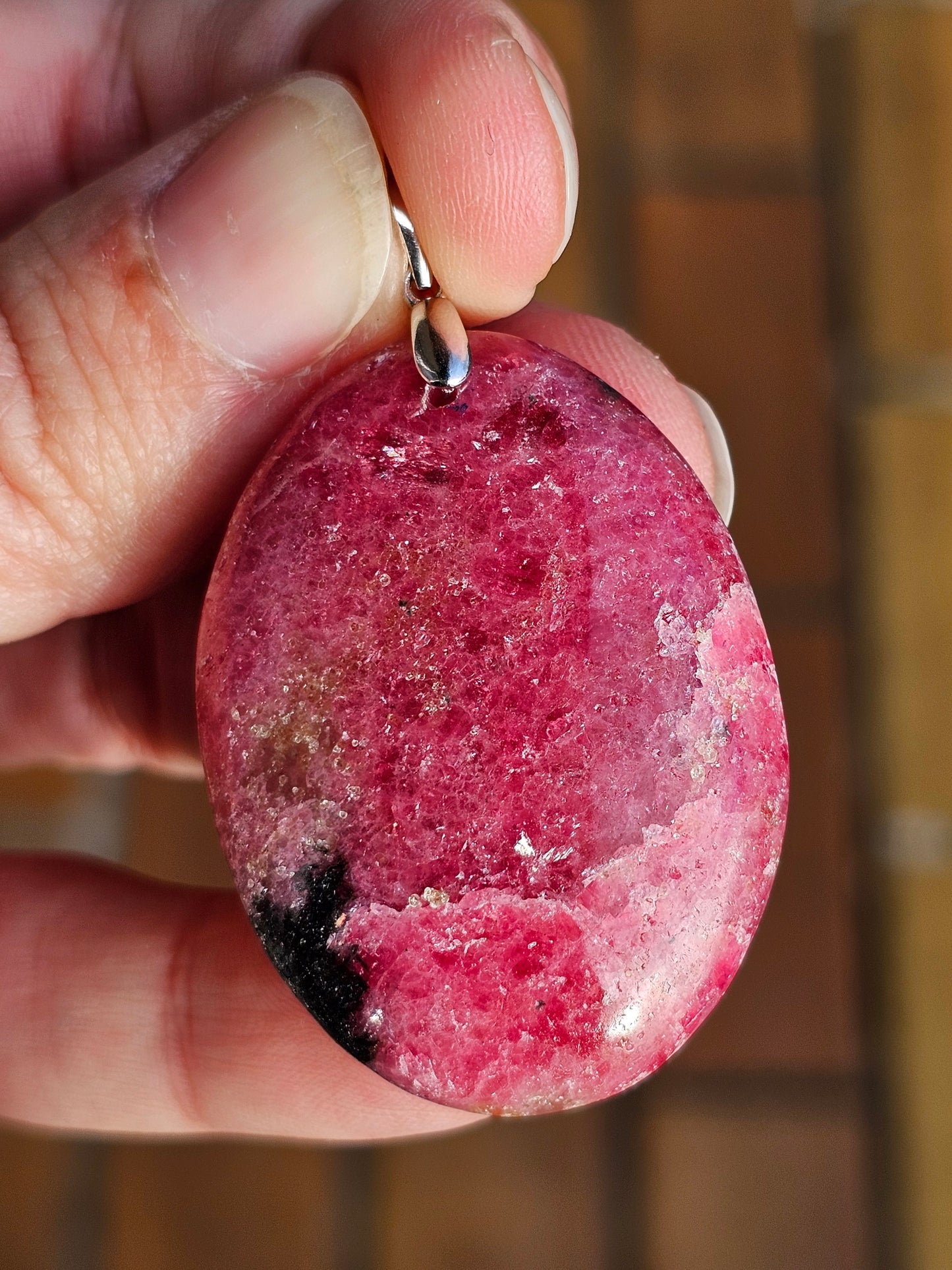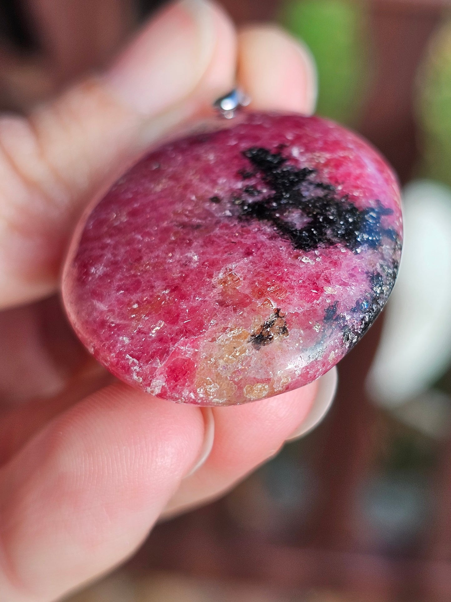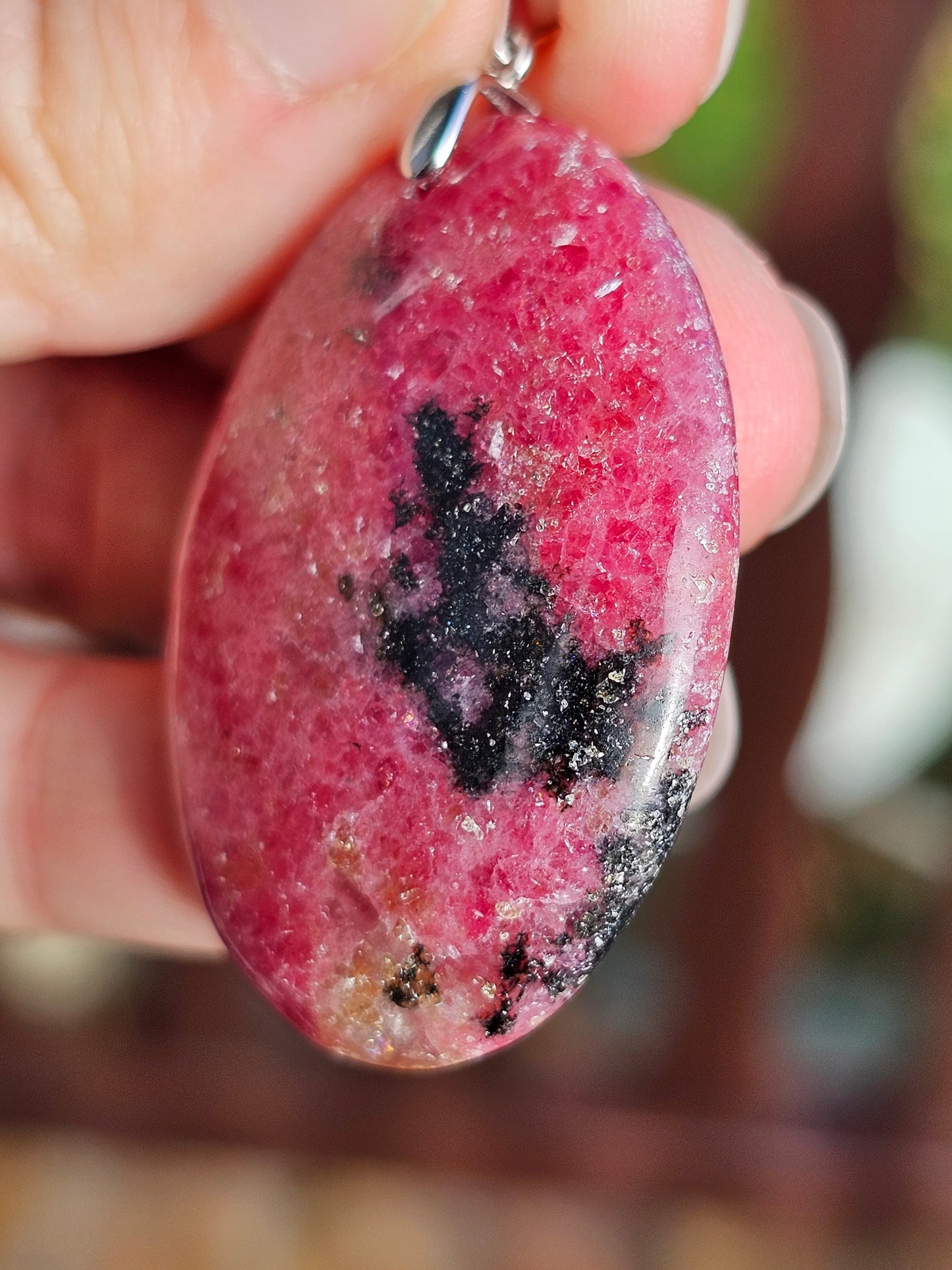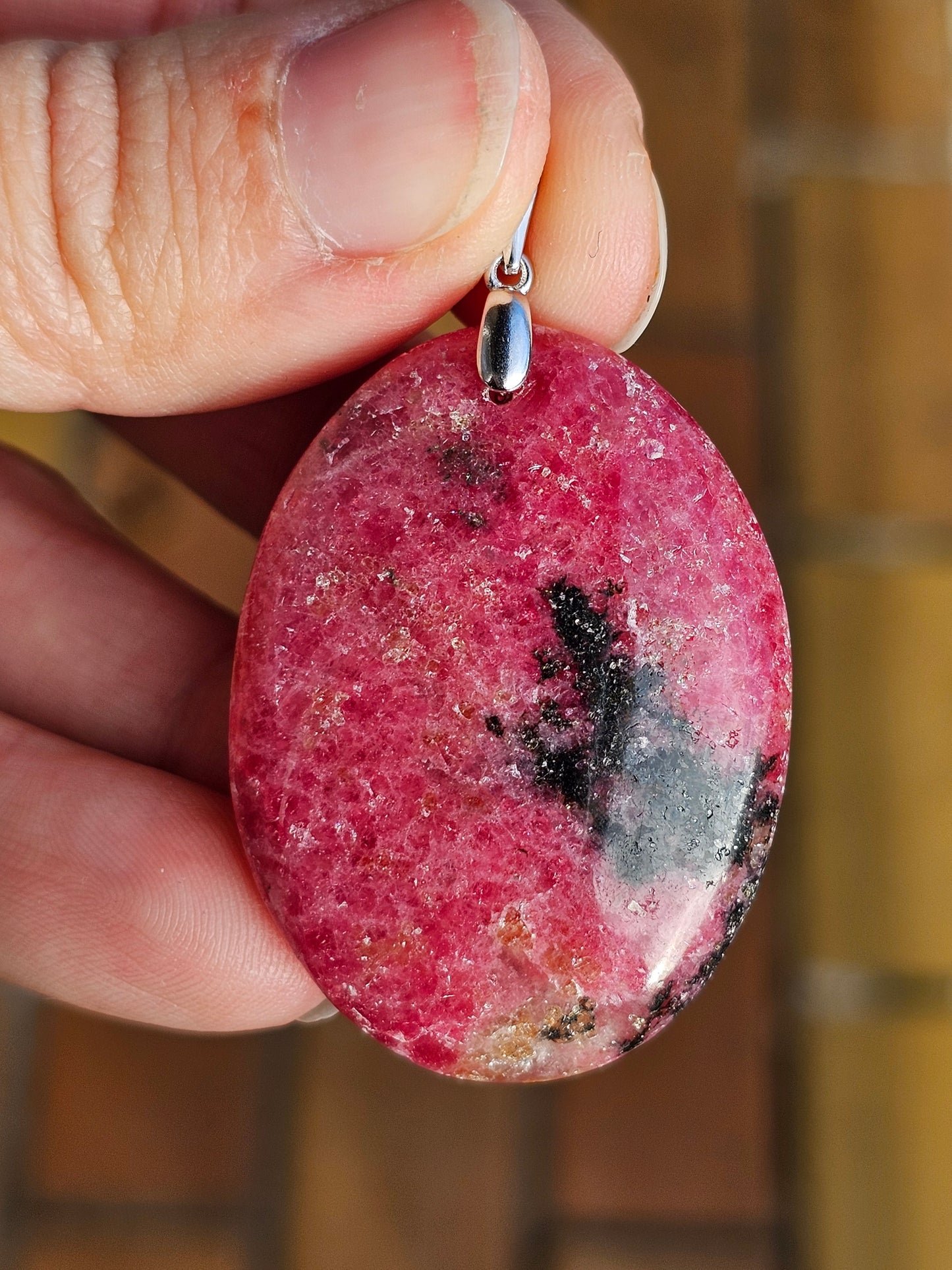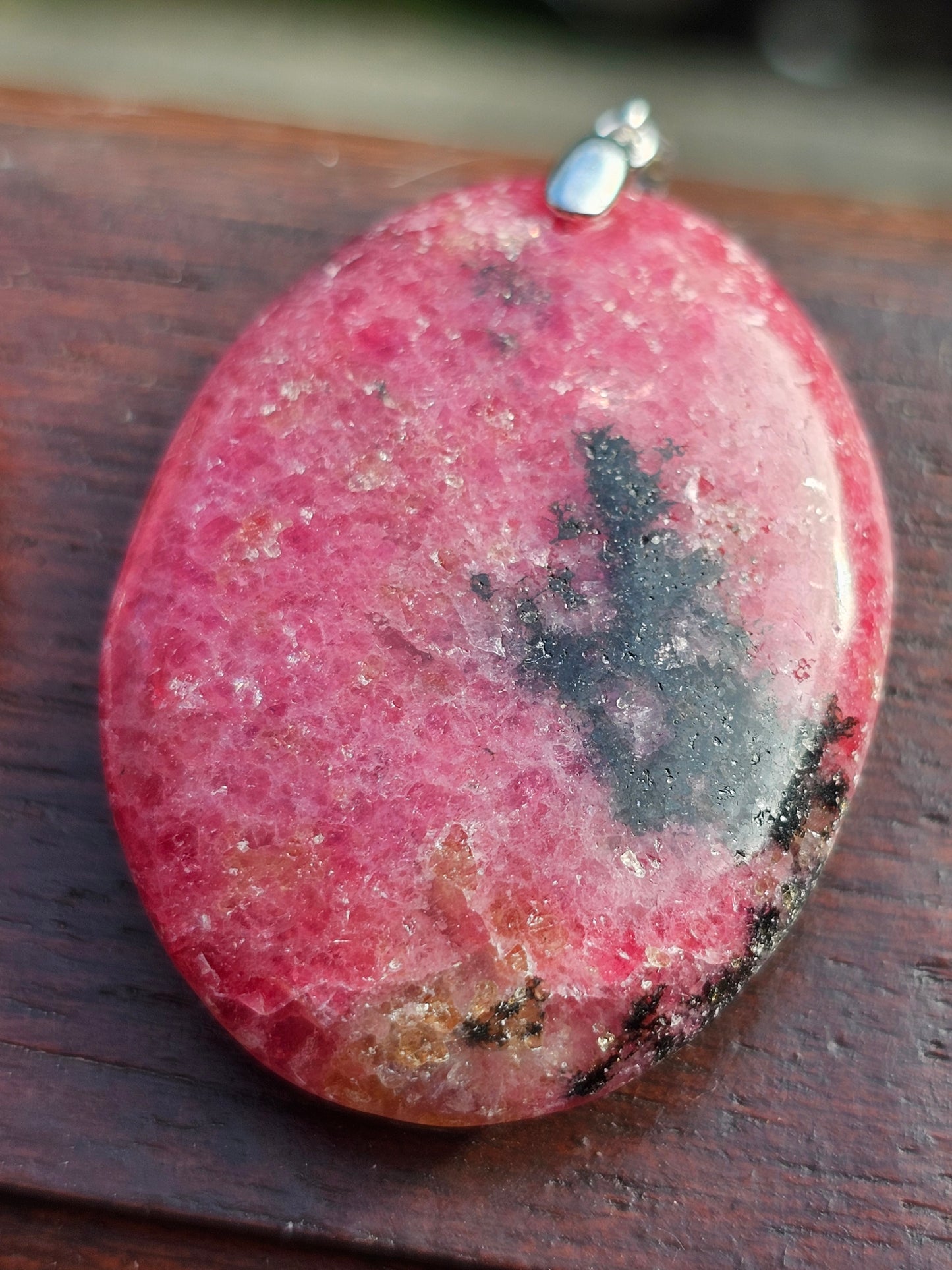 Joli pendentif en Rhodonite monté sur une bélière en argent 925.