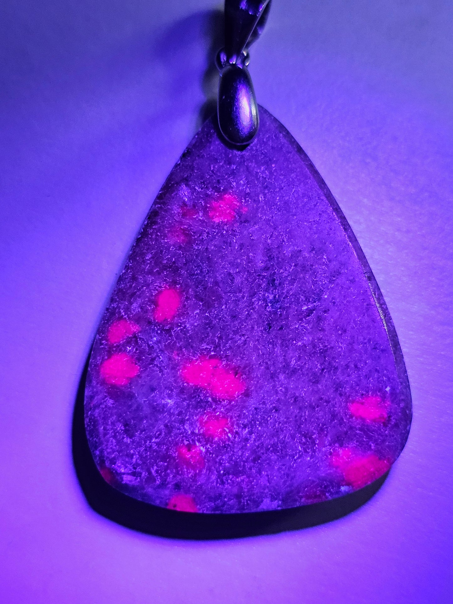 Magnifique pendentif en Rubis sur Cyanite, monté sur une bélière en argent 925 et réactif à la lumière ultra violette.
