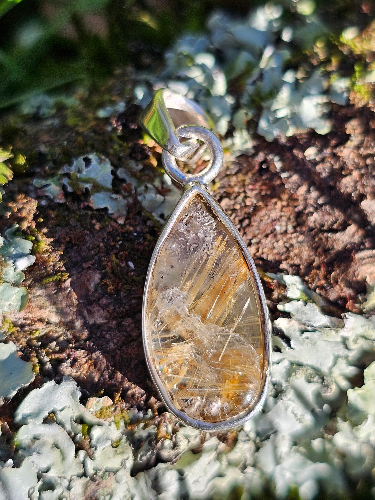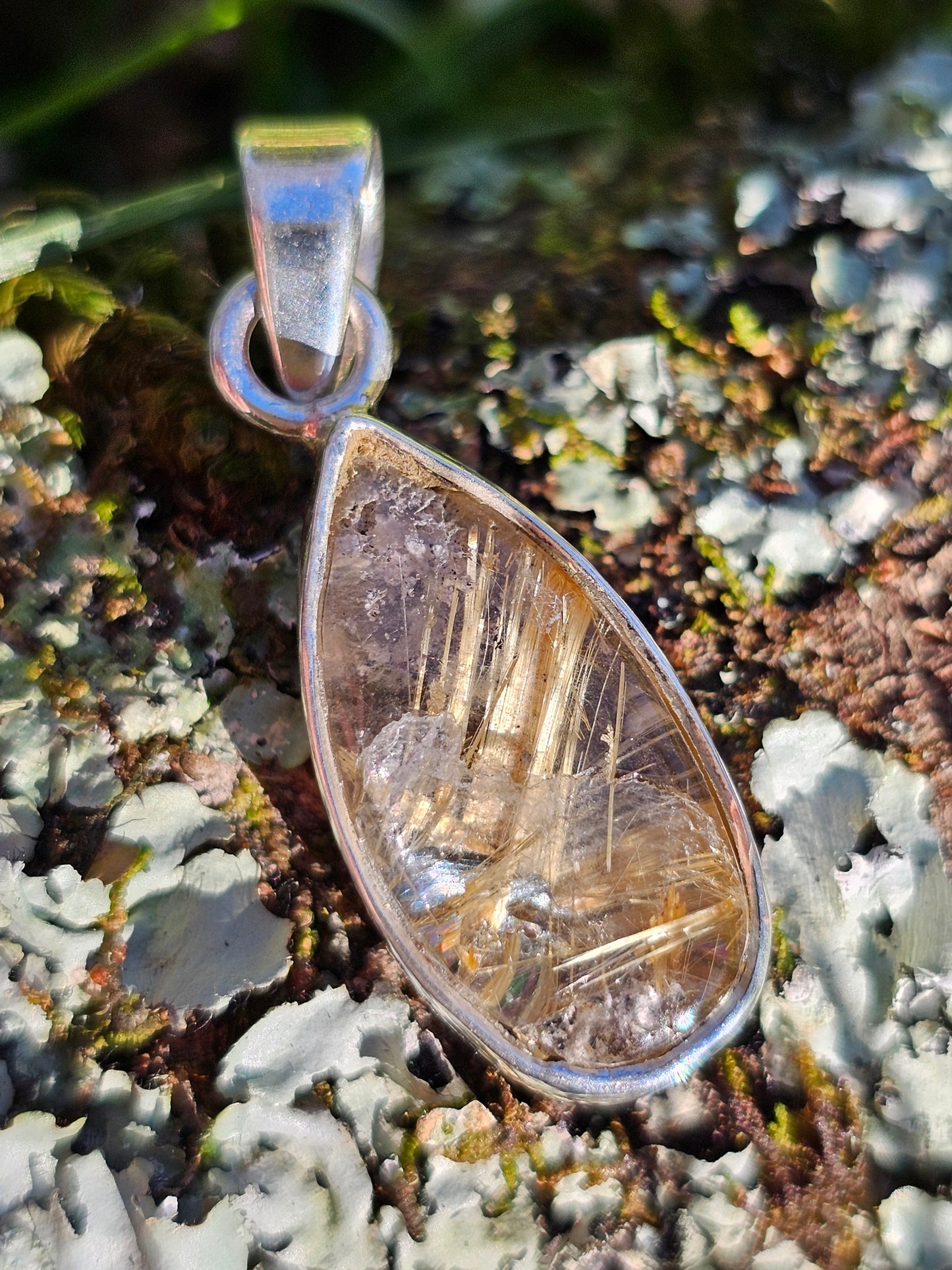 Magnifique pendentif en Quartz Rutile Hématite, serti argent 925 et monté sur une bélière en argent 925. Un vrai soleil autour de votre cou !