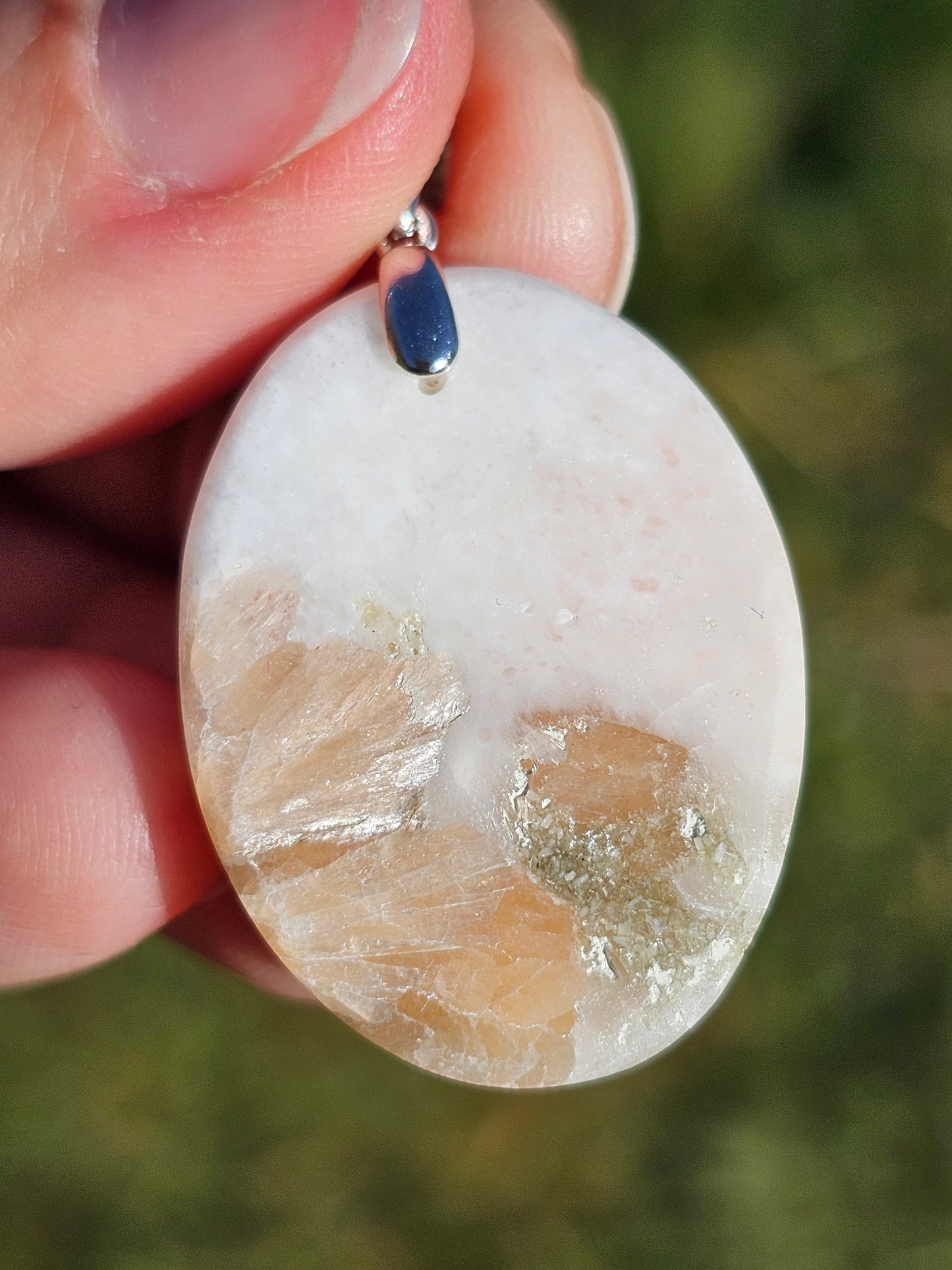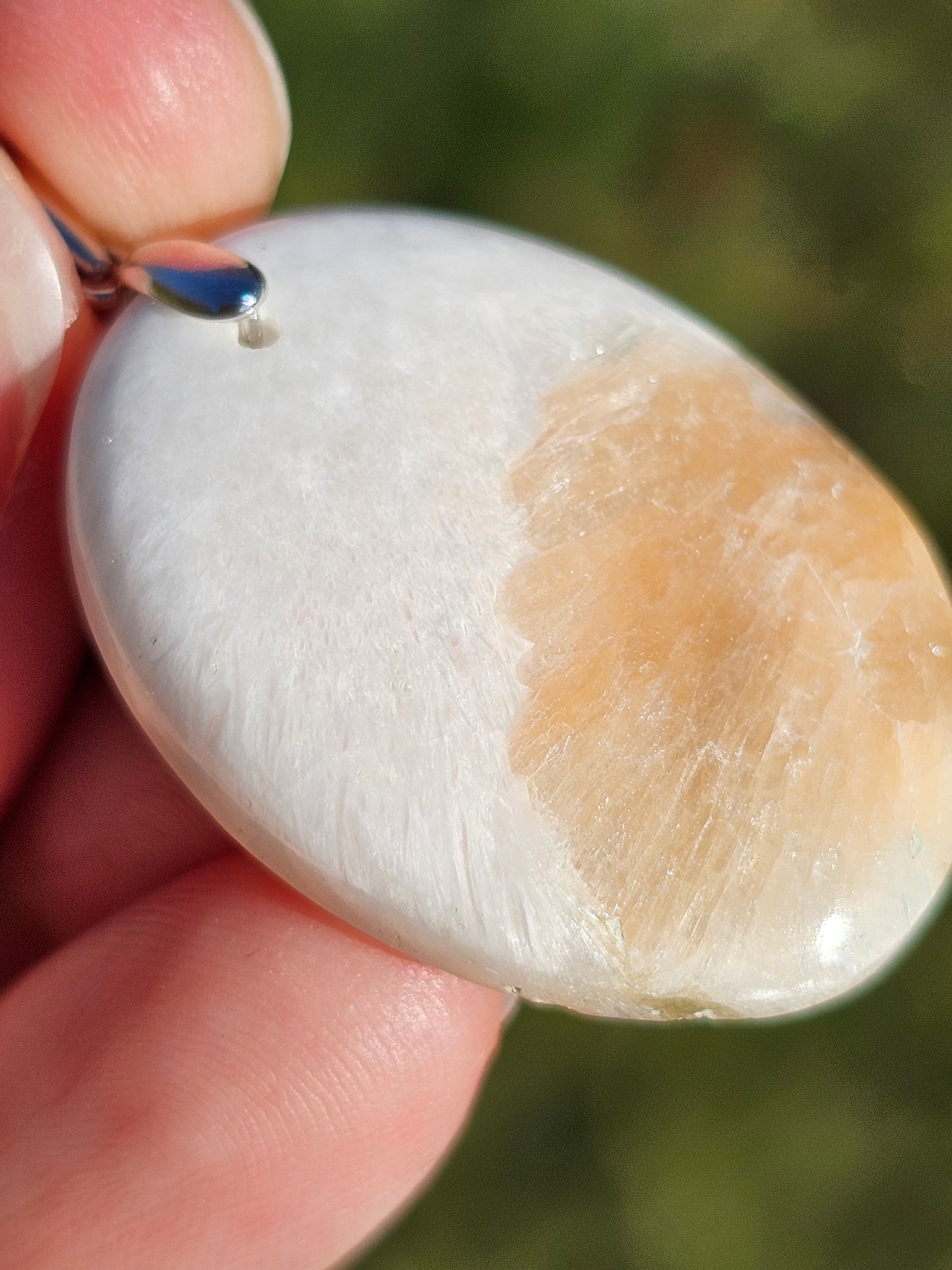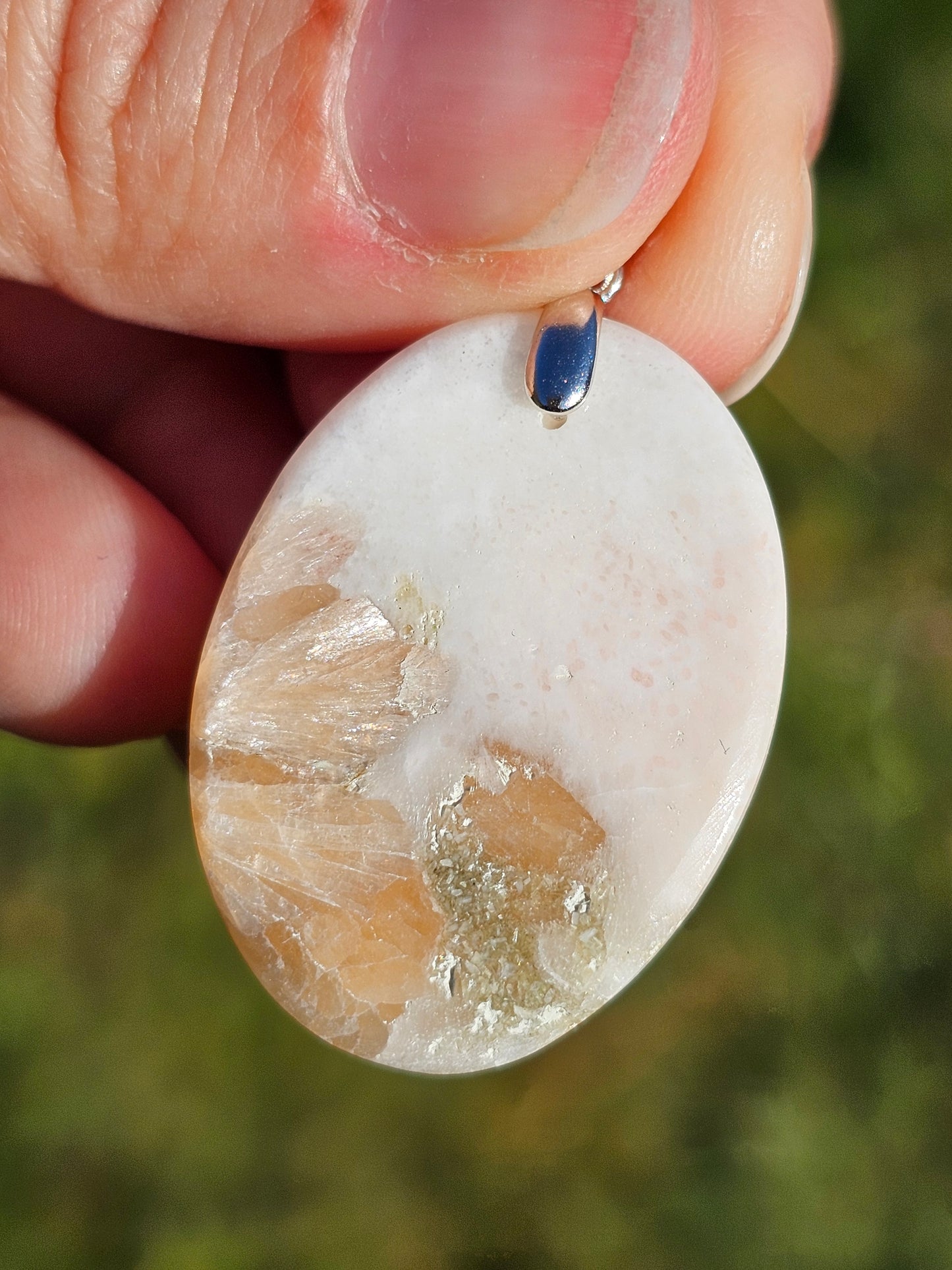 Superbe pendentif en Scolécite (blanc) et Stilbite (orangé) monté sur une bélière en argent 925. (vidéo disponible en cliquant ici)