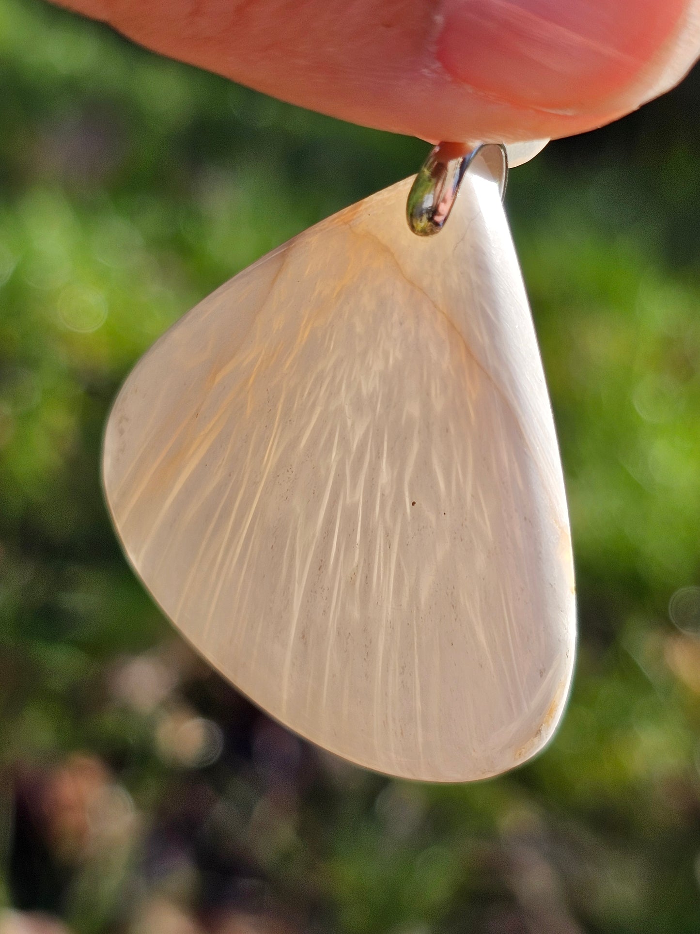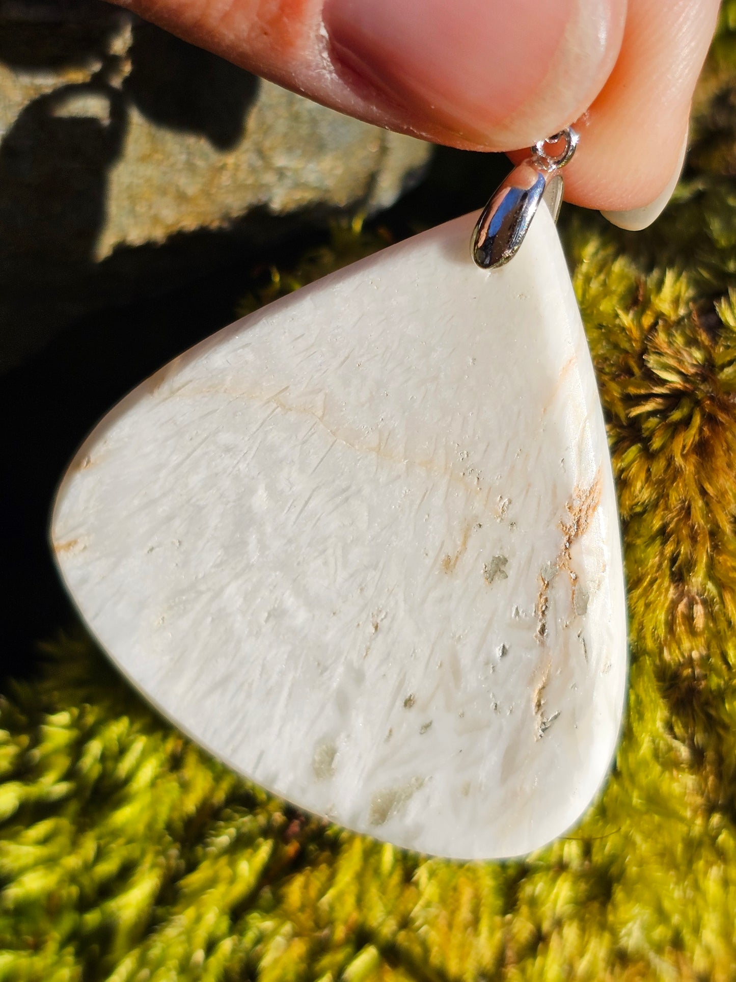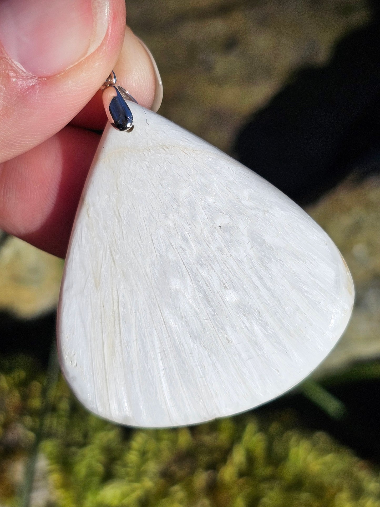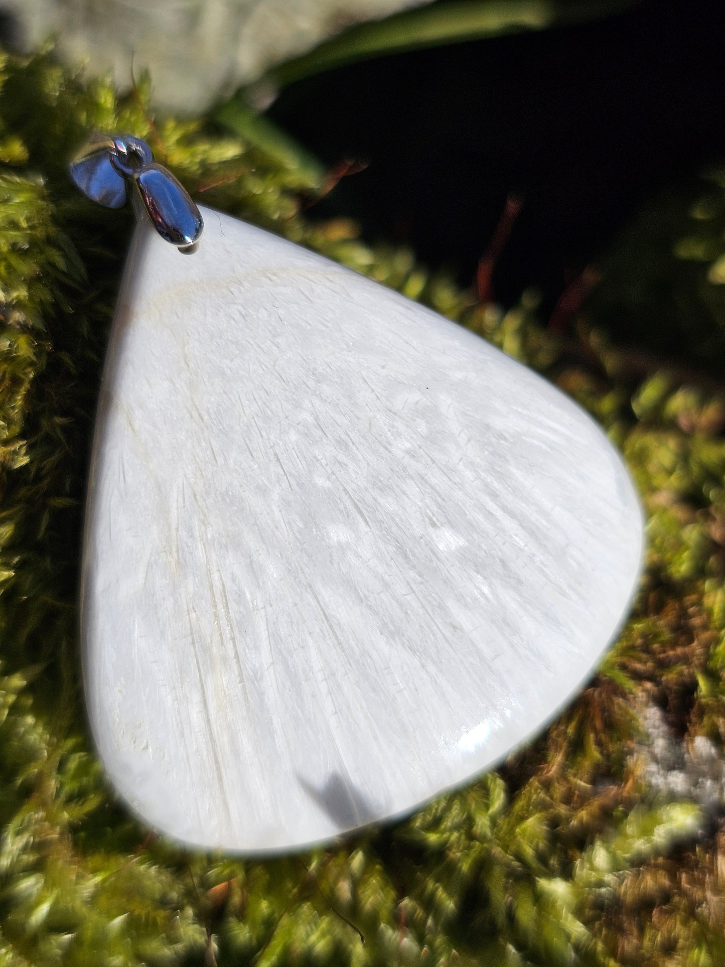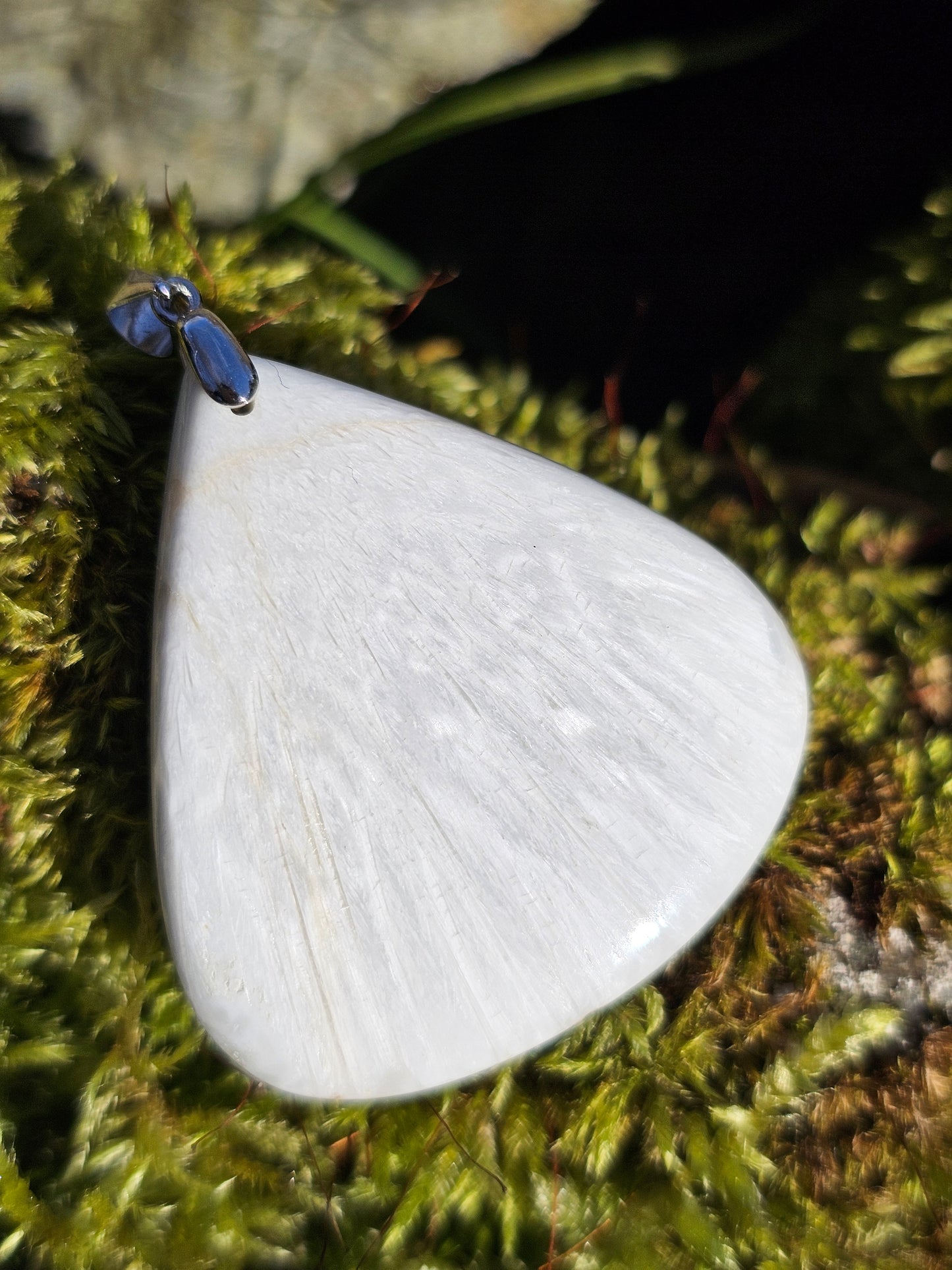 Magnifique pendentif en Scolécite aux reflets chatoyants, monté sur une bélière en argent 925 et livré dans son pochon.