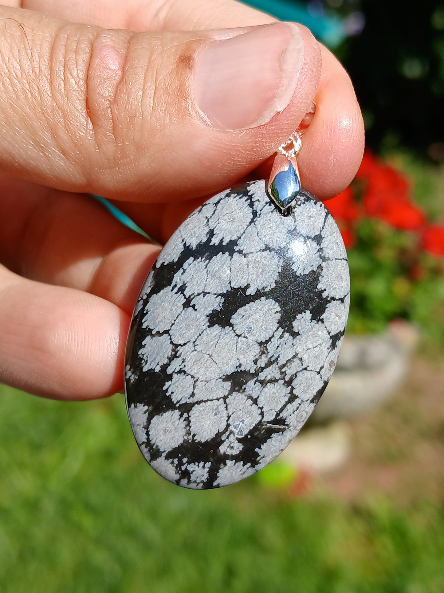 Joli pendentif en Obsidienne flocons de neige monté sur une bélière en argent 925. Les inclusions formant les flocons sont des inclusions de cristobalite.