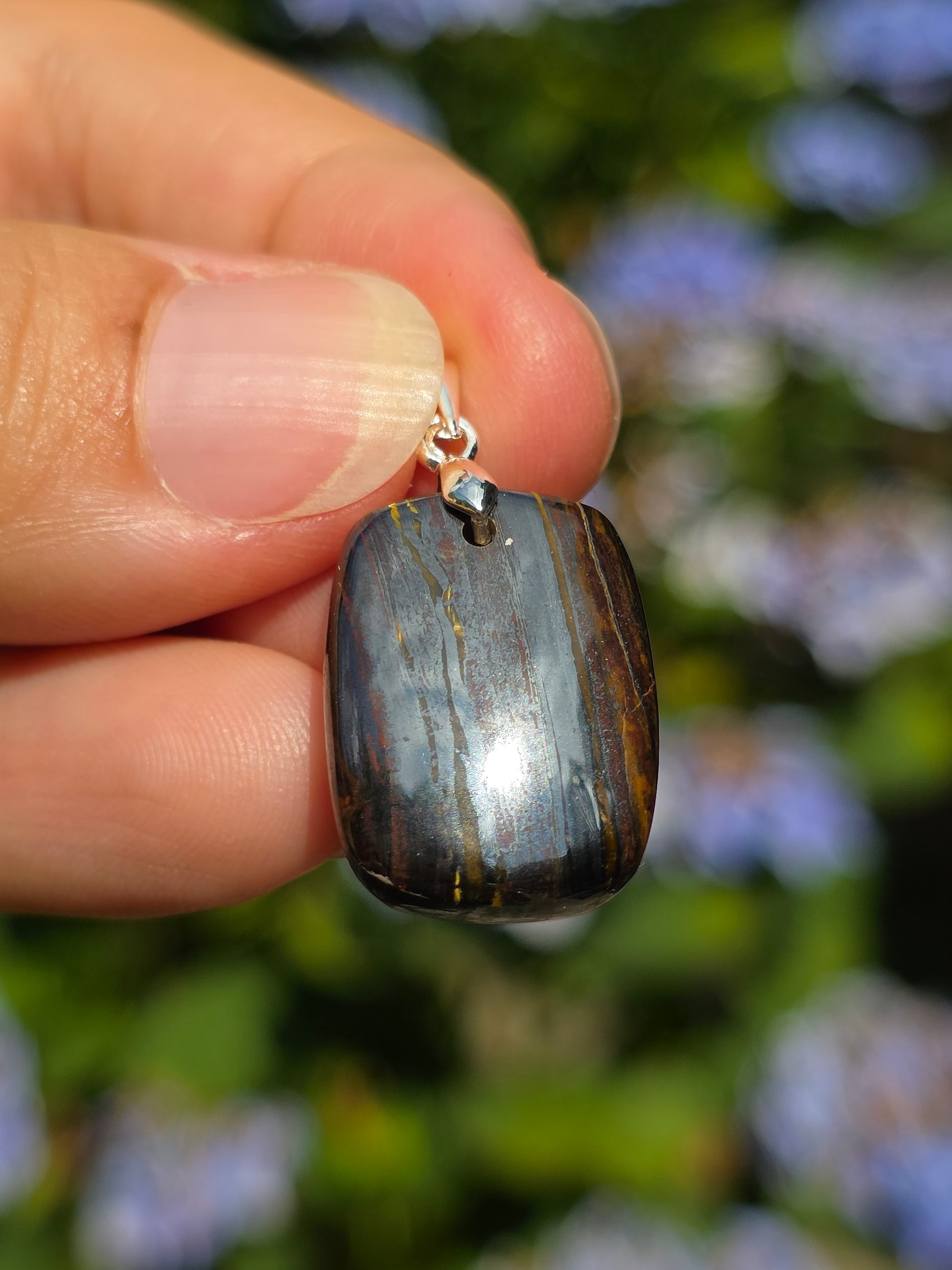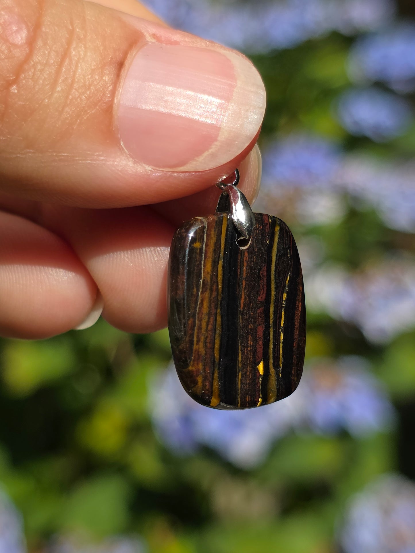 Superbe pendentif en Œil de fer (contient 3 minéraux : œil de tigre, hématite et Jaspe rouge) monté sur une bélière en argent 925. (vidéo disponible ici)