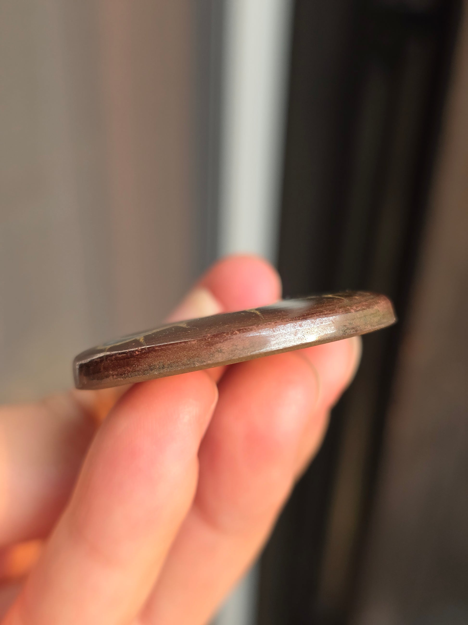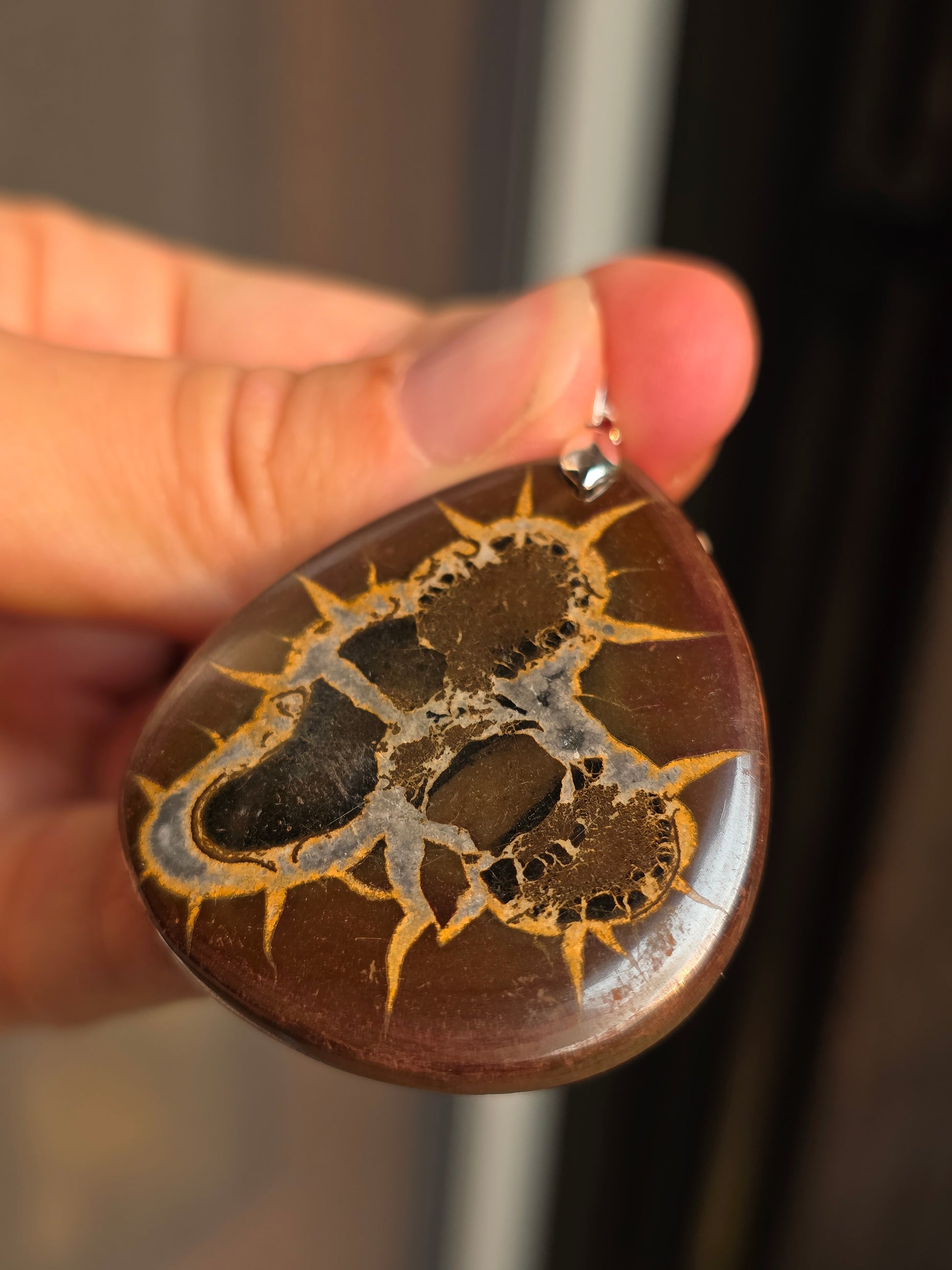 Joli pendentif en Septaria sauvage de Madagascar, monté sur une bélière en argent 925. (vidéo ici).