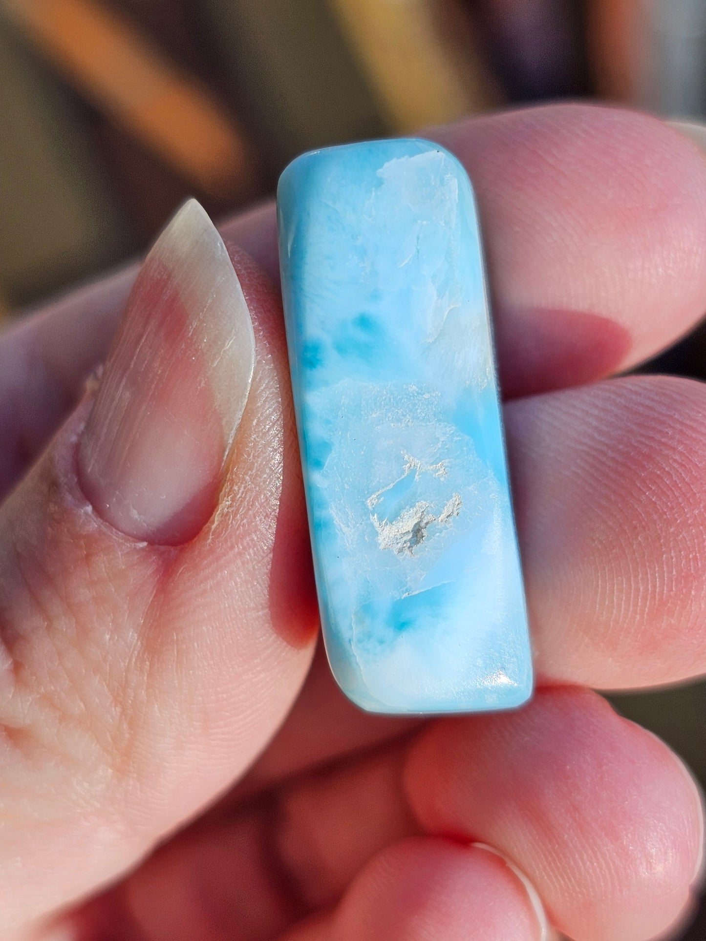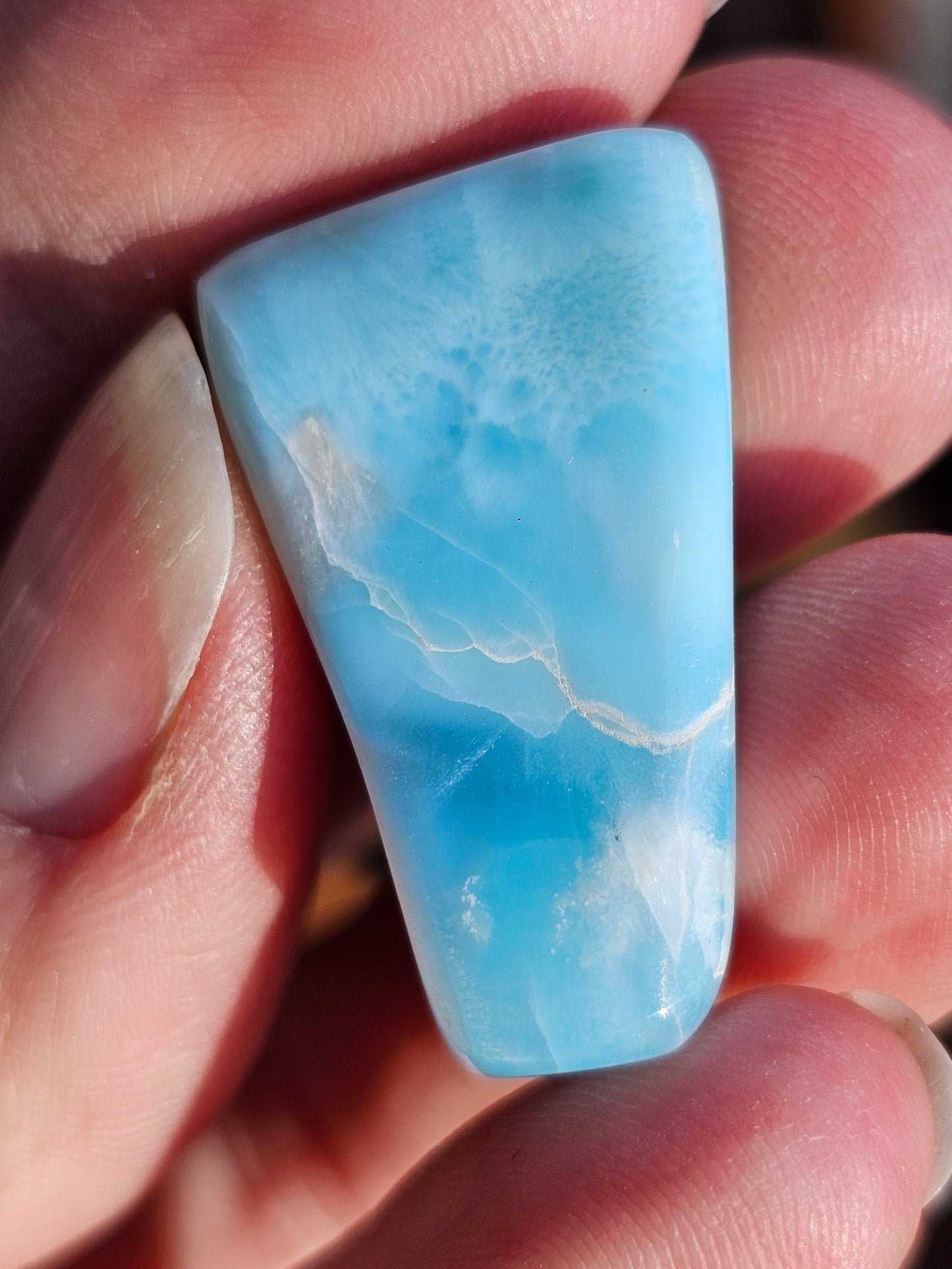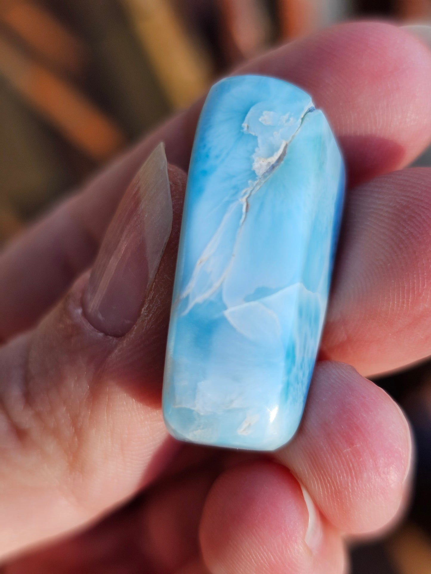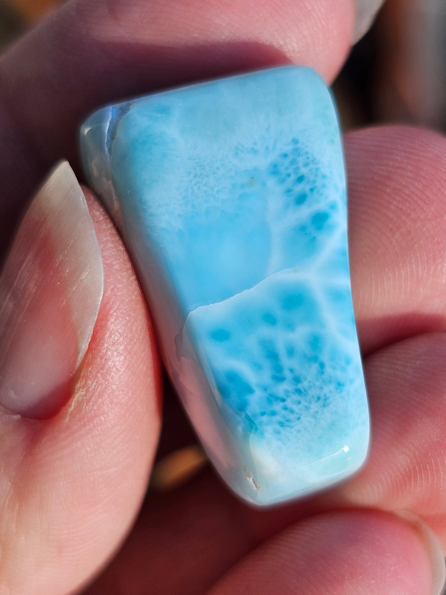 Joli pierre roulée de Larimar (également appelé Pectolite) dans une superbe qualité. Un petit bout d'océan à avoir dans la poche en permanence !