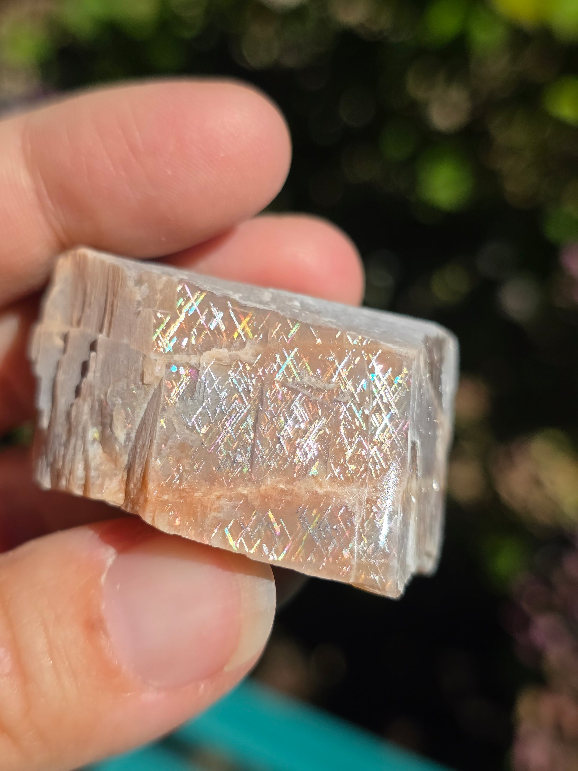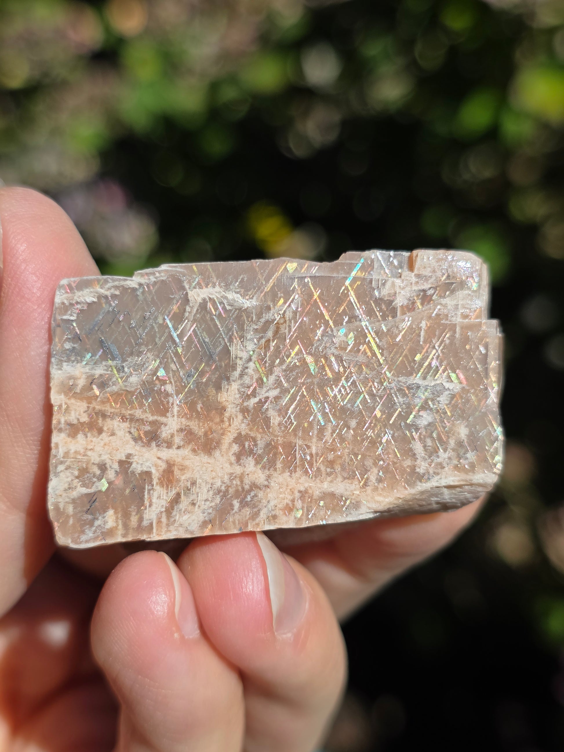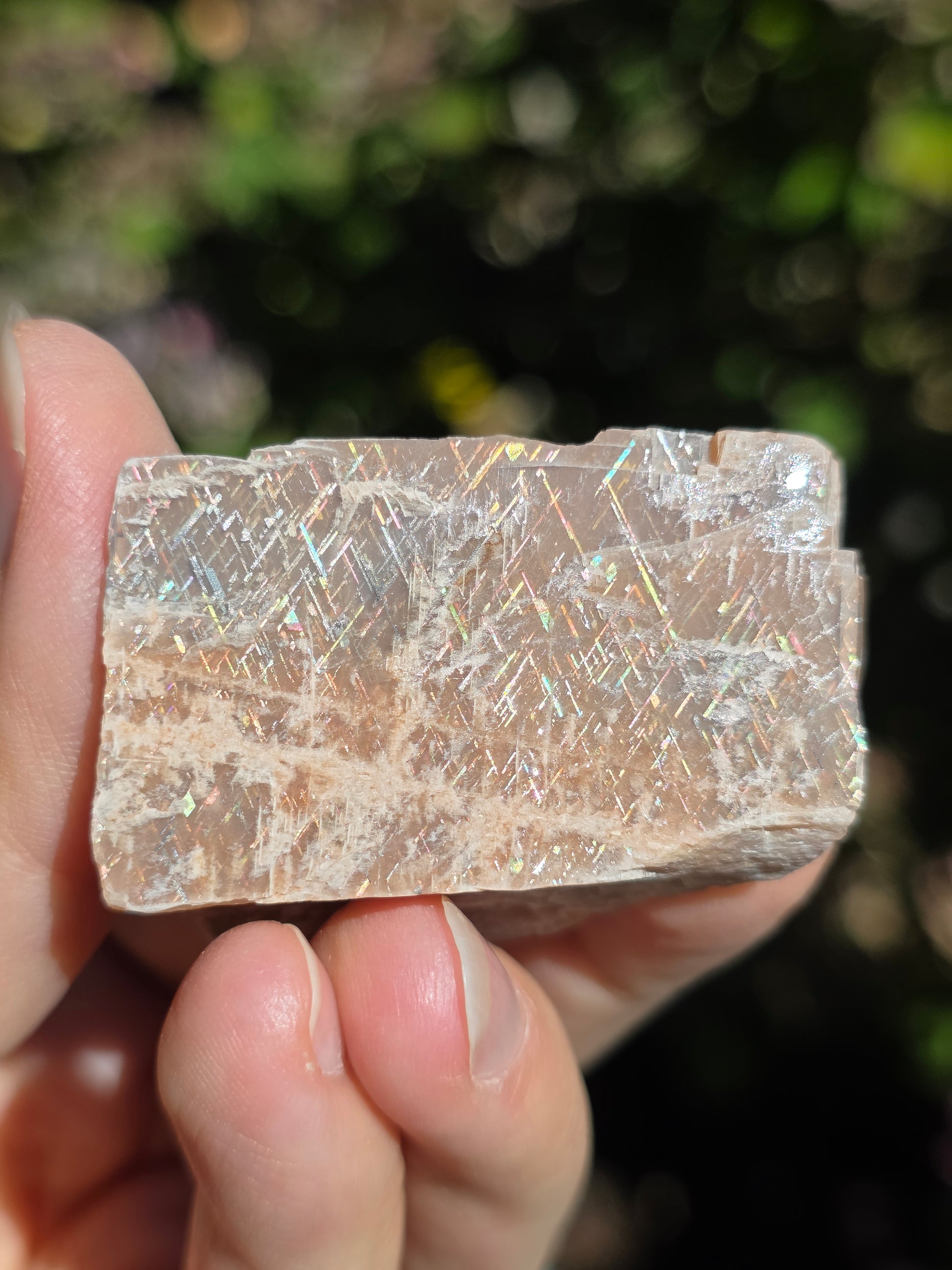 Sublime Rainbow Lattice sunstone d'Australie semi brute, semi polie, reconnaissable grâce à son maillage croisé arc en ciel. Cette variété de pierre de soleil est très rare et très recherchée. (vidéo ici).