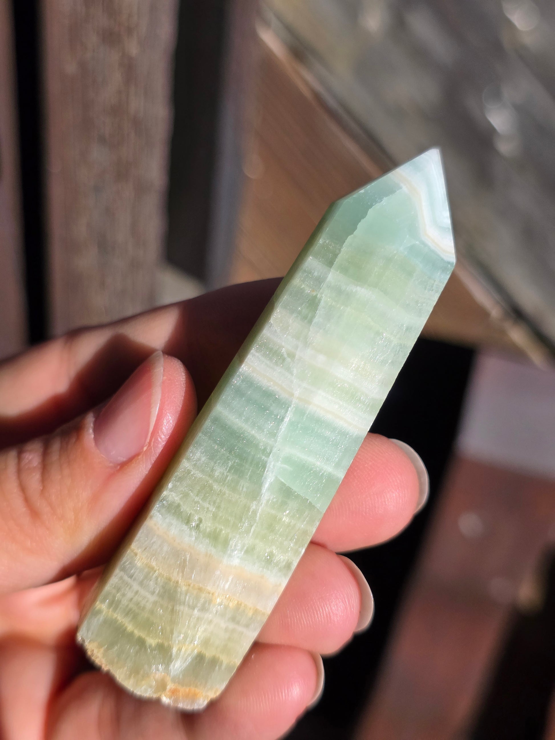 Superbe pointe en Calcite verte du Pakistan. Il existe des appellations commerciales telles que Calcite pistache ou encore caraïbes, pour définir la calcite verte (vidéo disponible ici)