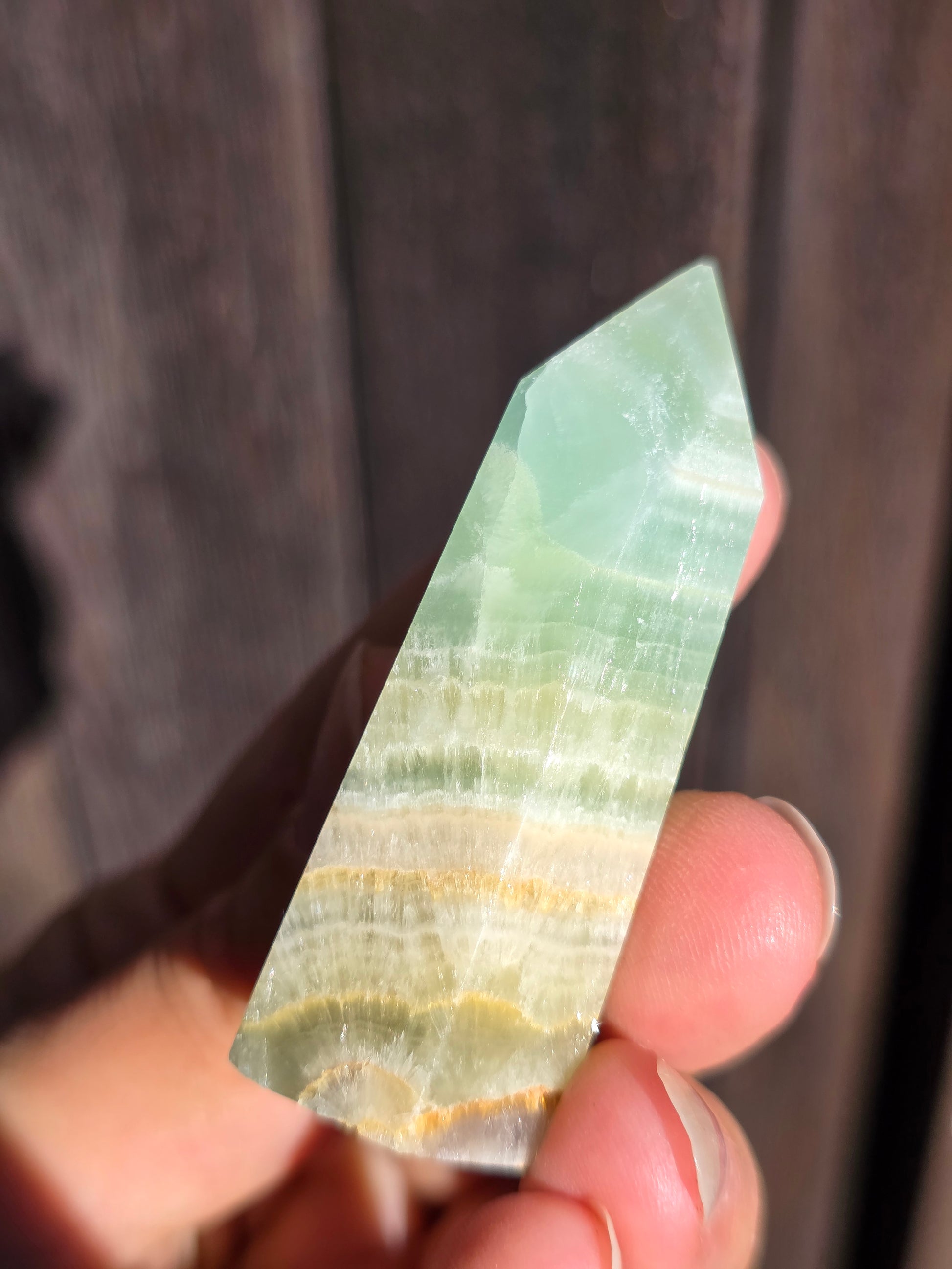 Superbe pointe en Calcite verte du Pakistan. Il existe des appellations commerciales telles que Calcite pistache ou encore caraïbes, pour définir la calcite verte (vidéo disponible ici)