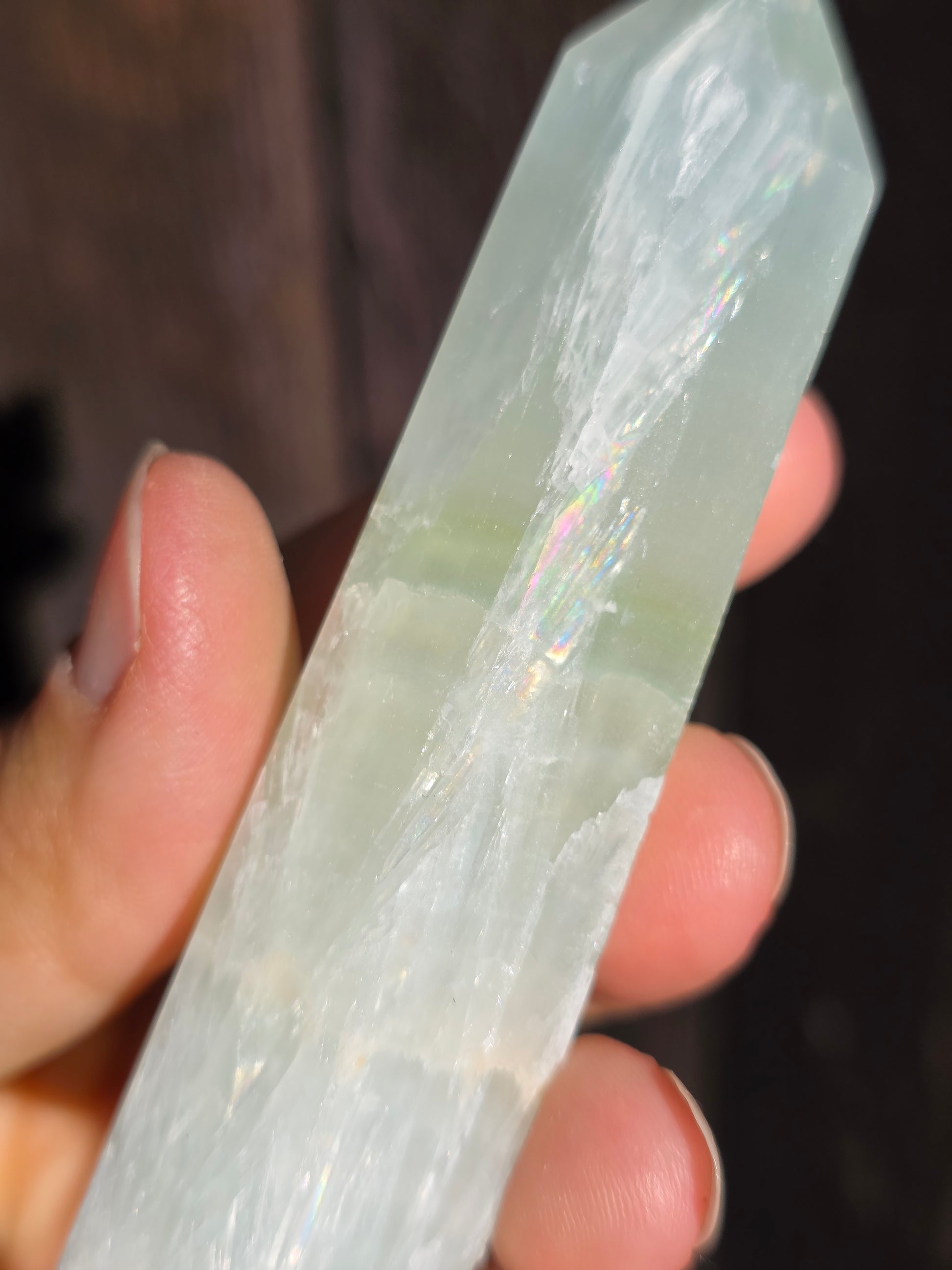 Superbe pointe en Calcite verte du Pakistan. Il existe des appellations commerciales telles que Calcite pistache ou encore caraïbes, pour définir la calcite verte (vidéo disponible ici)