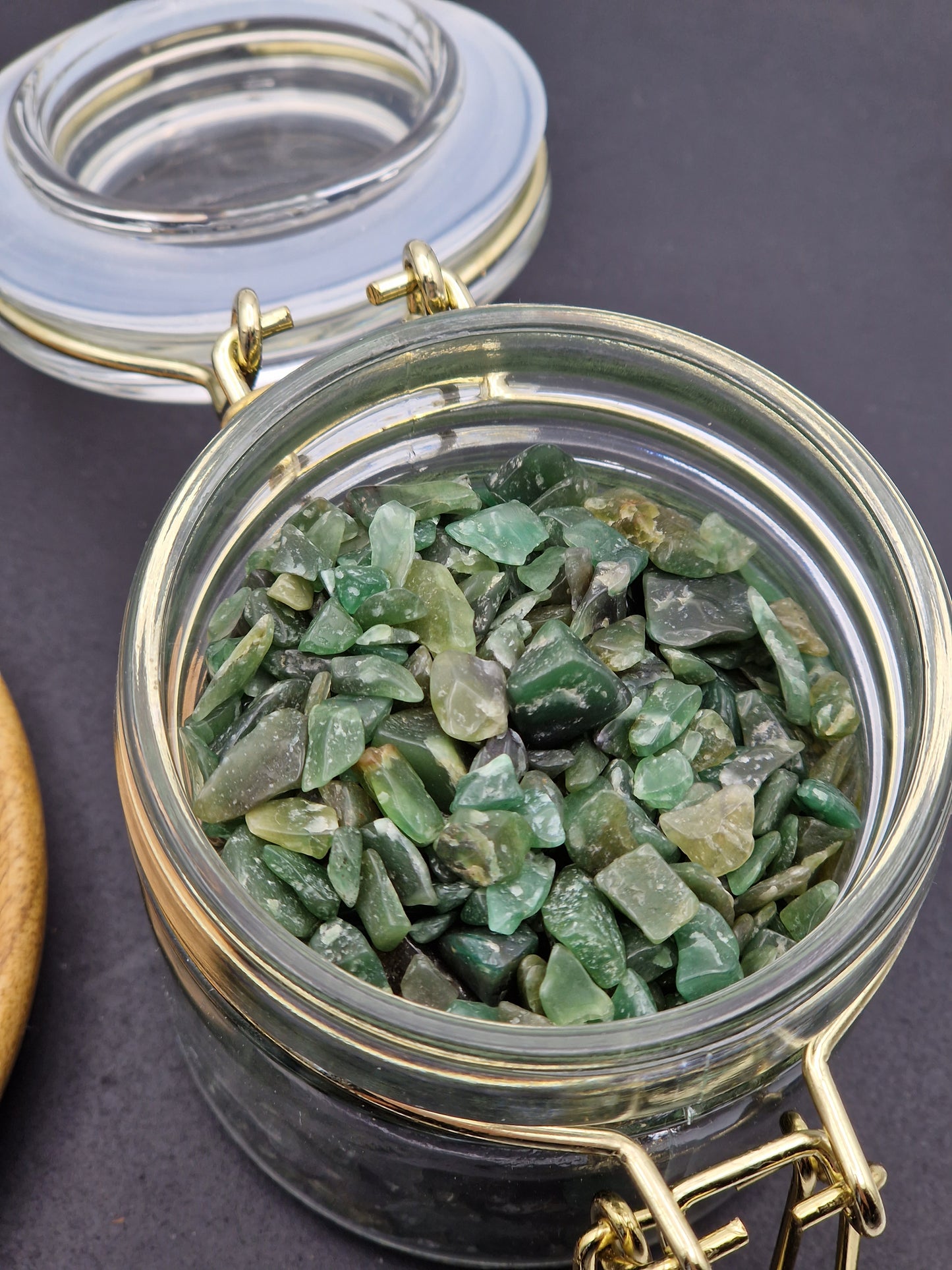 Emportez partout votre fiole de chips d'aventurine verte ou déposez votre pot de minis cristaux dans un petit bol en sélénite pour apporter tolérance et recentrage dans votre cocon.