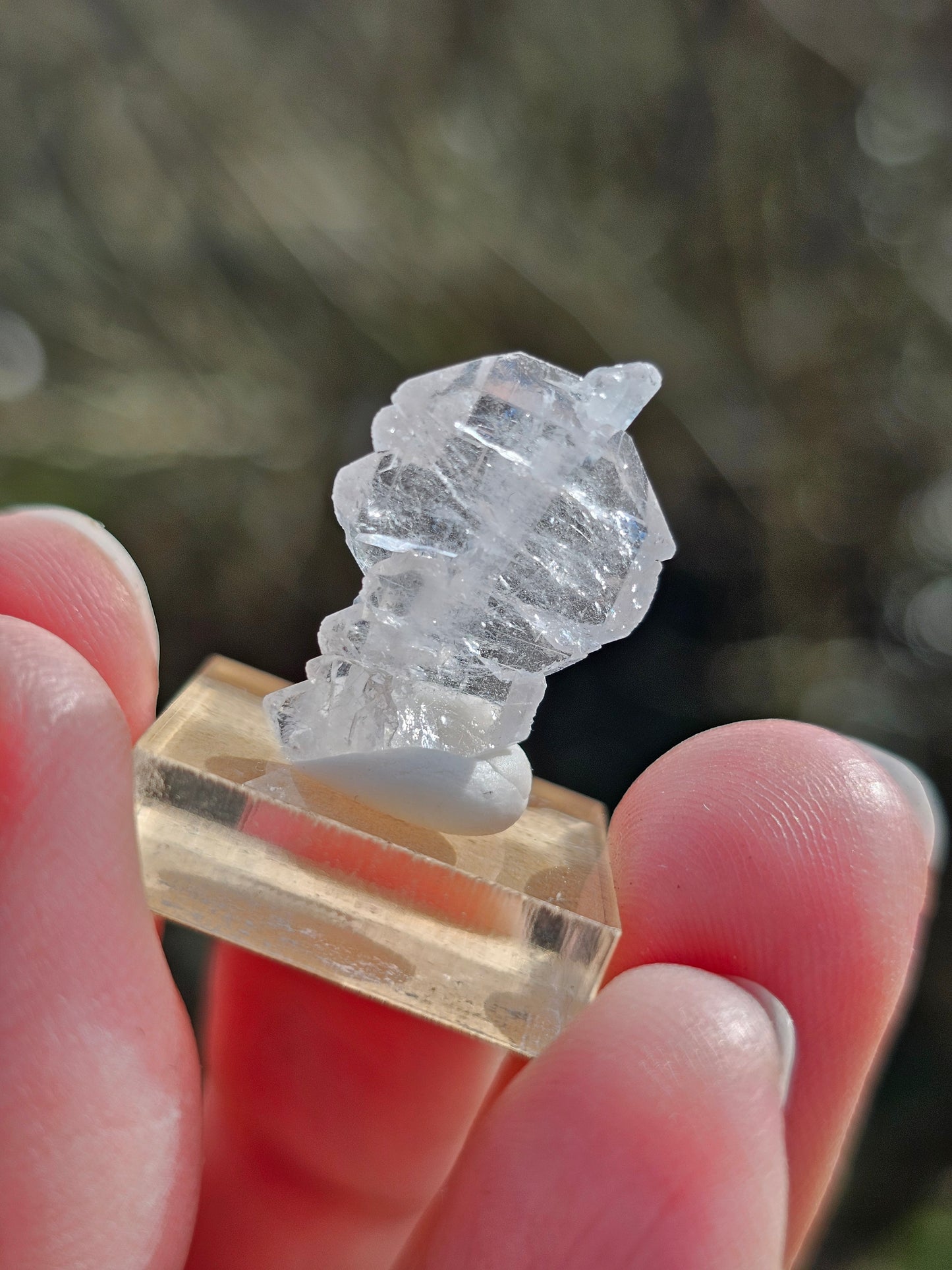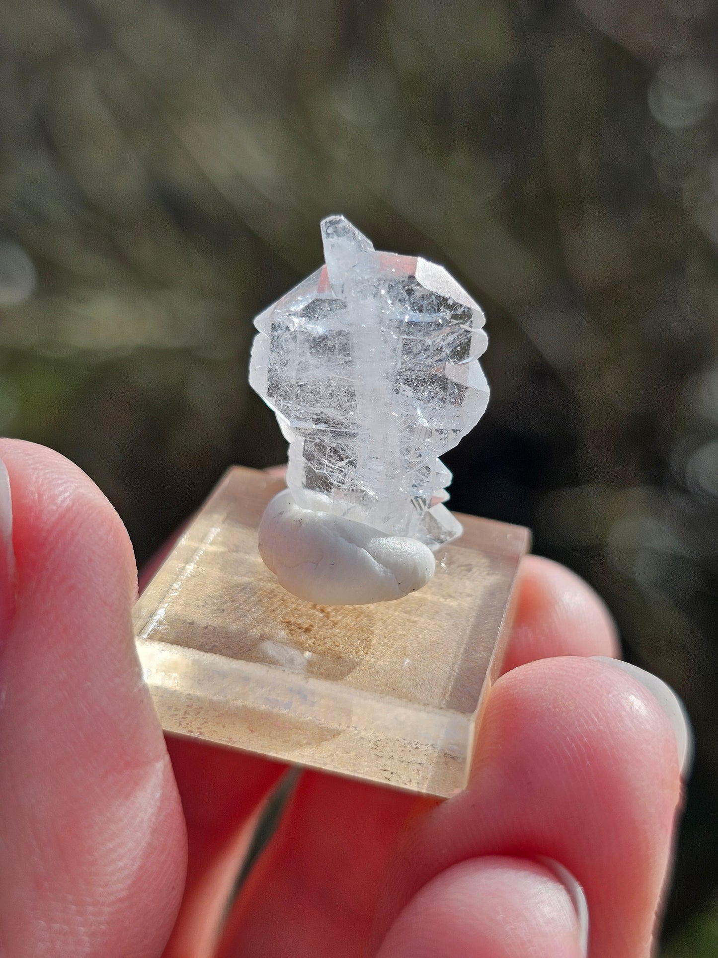 Jolie Quartz à âme du Pakistan sur socle, également appelé faden quartz ou quartz tabulaire. La ligne blanche représente une "fracture" le long de laquelle le quartz à recristallisé.