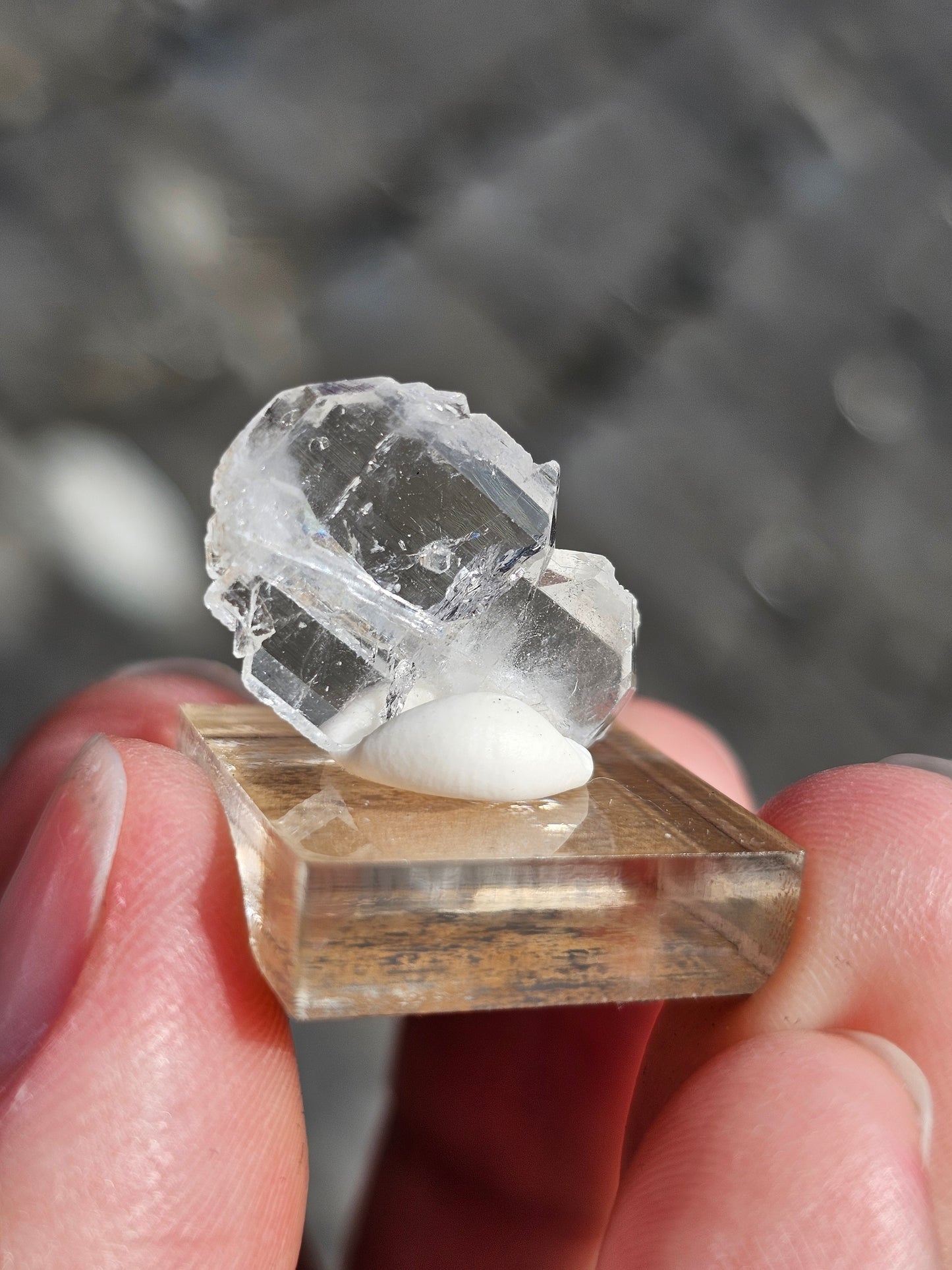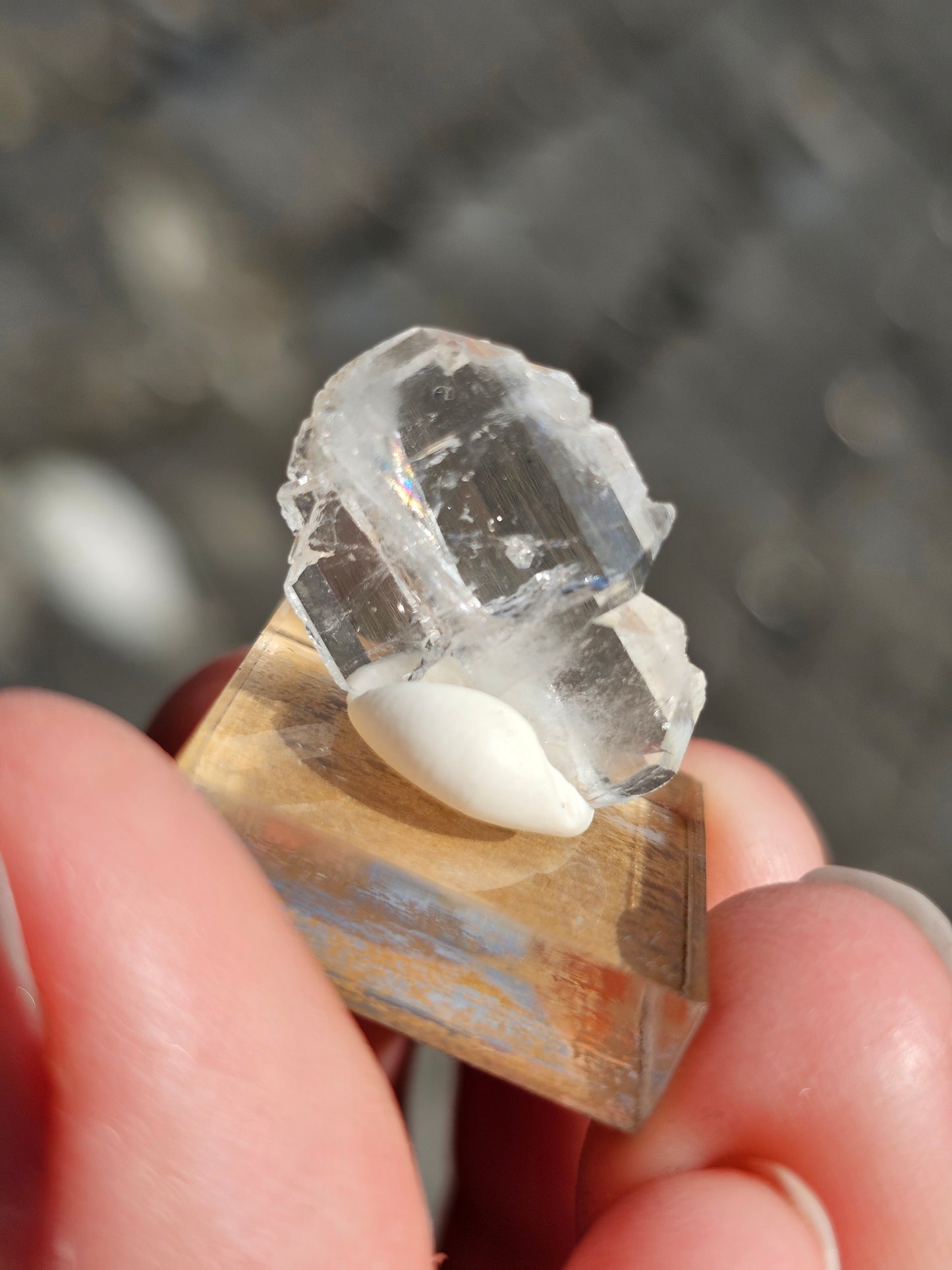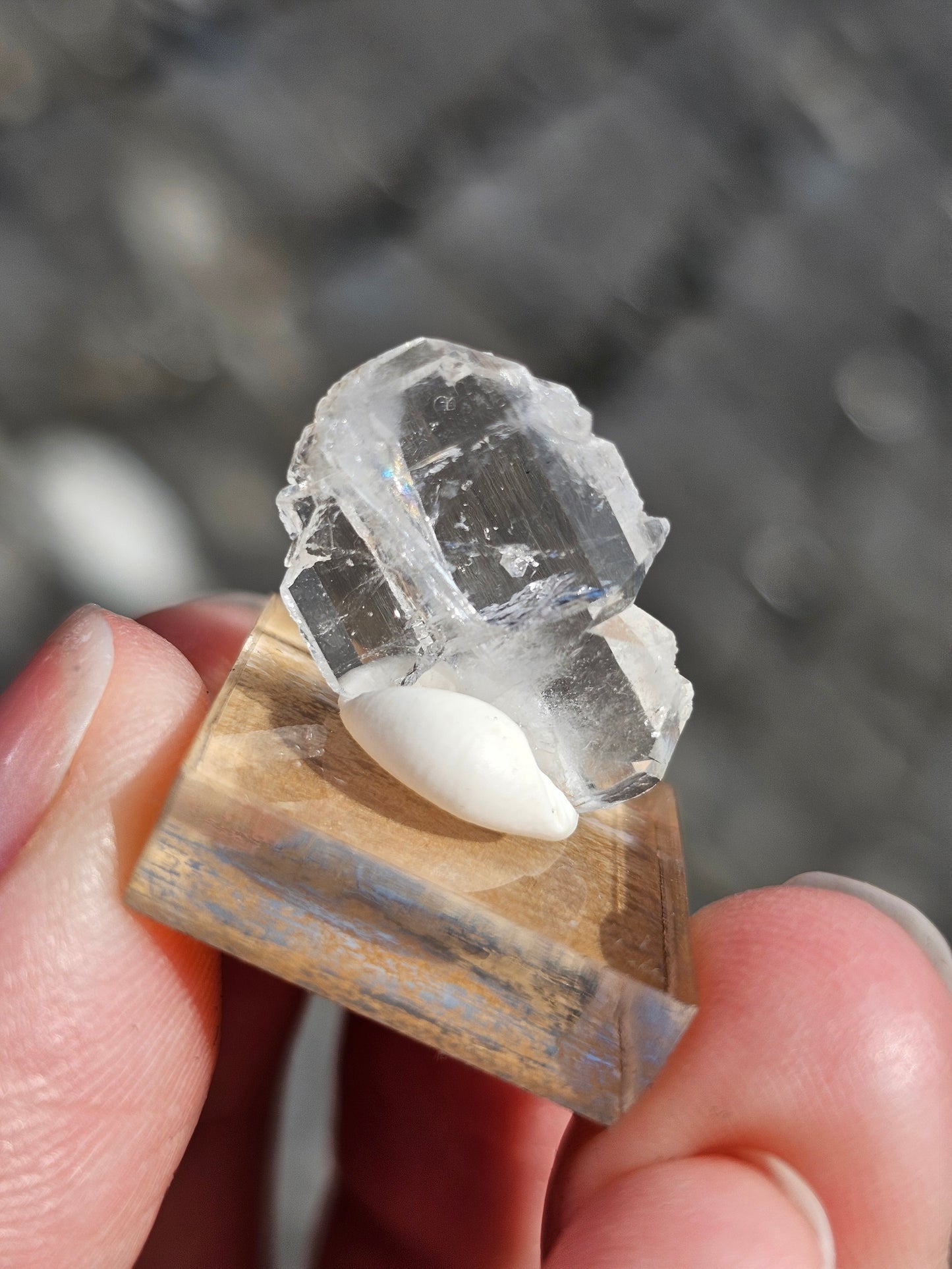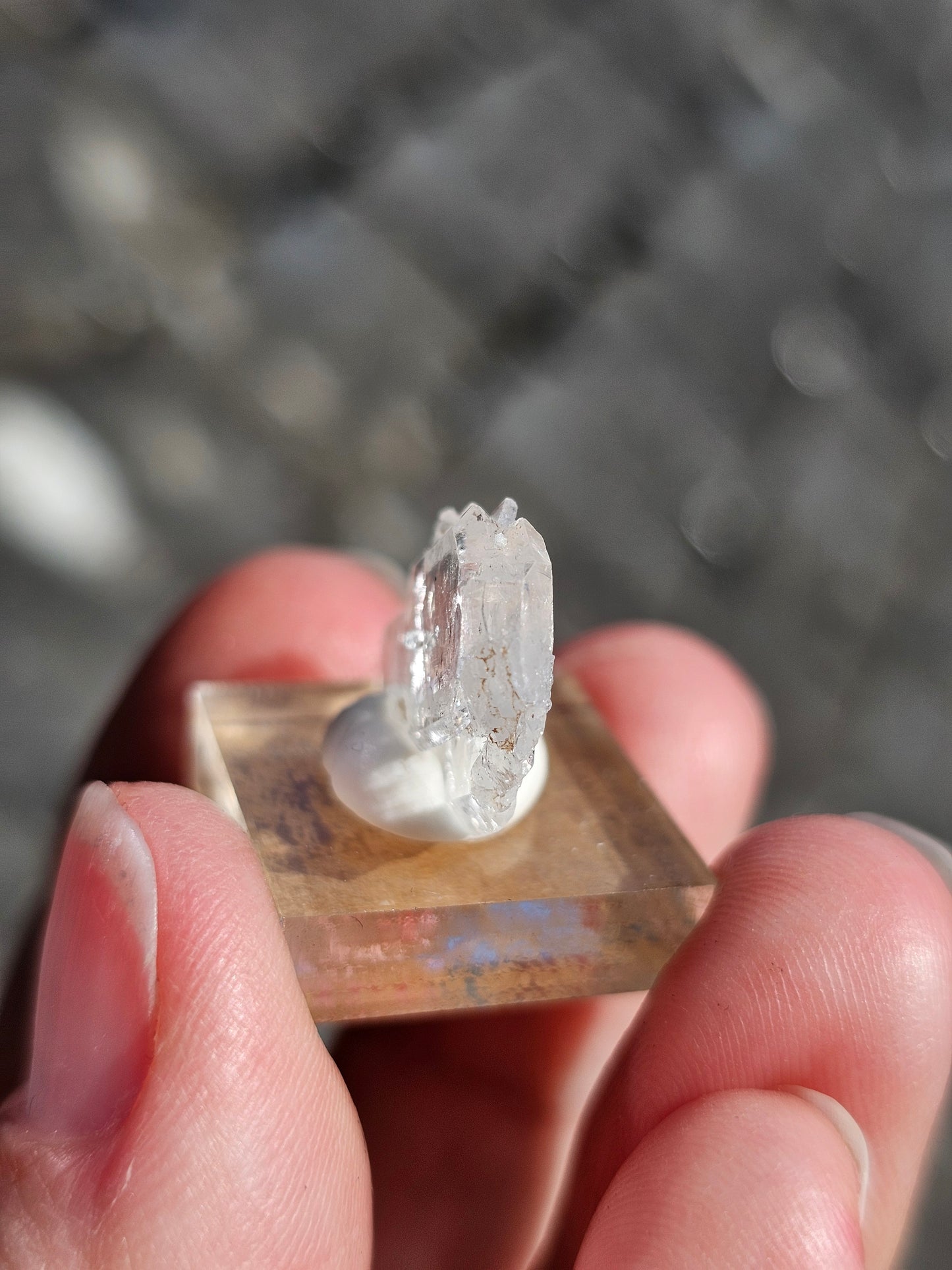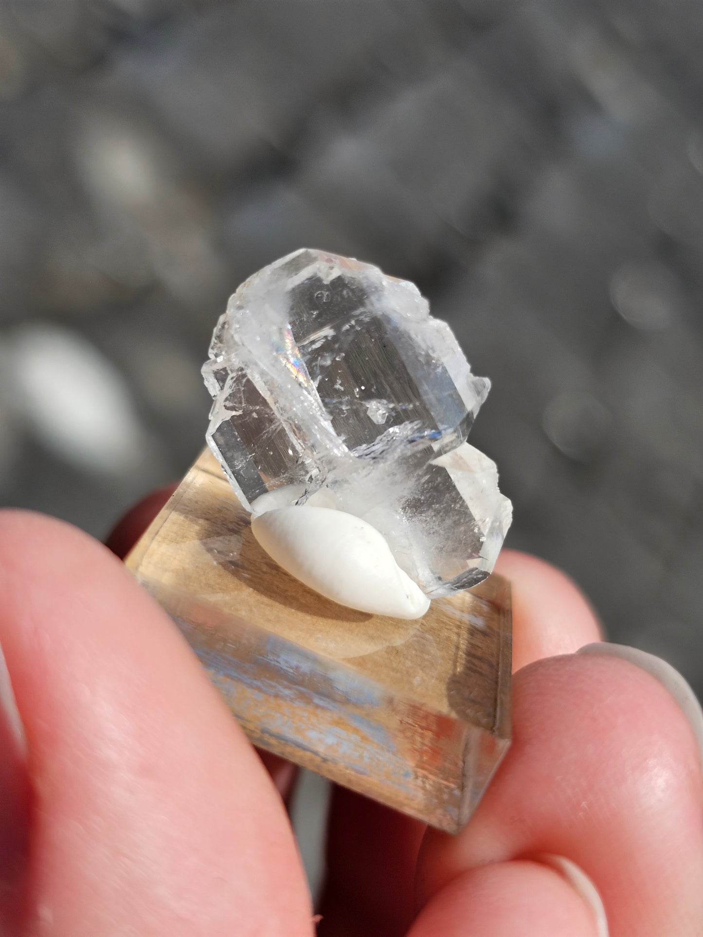 Jolie Quartz à âme du Pakistan sur socle, également appelé faden quartz ou quartz tabulaire. La ligne blanche représente une "fracture" le long de laquelle le quartz à recristallisé.
